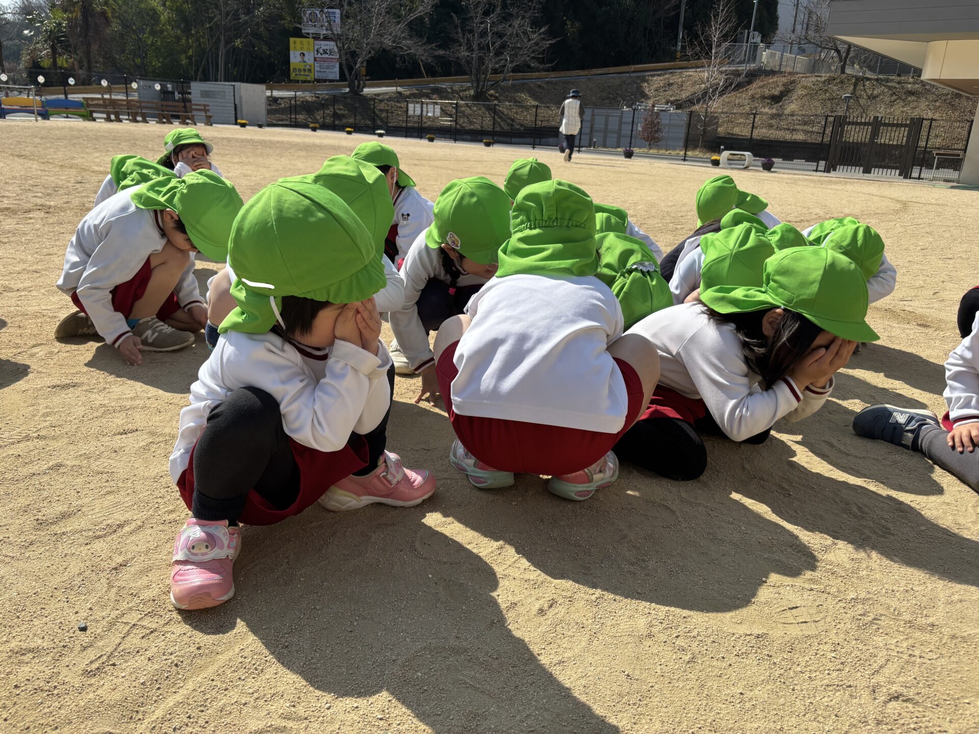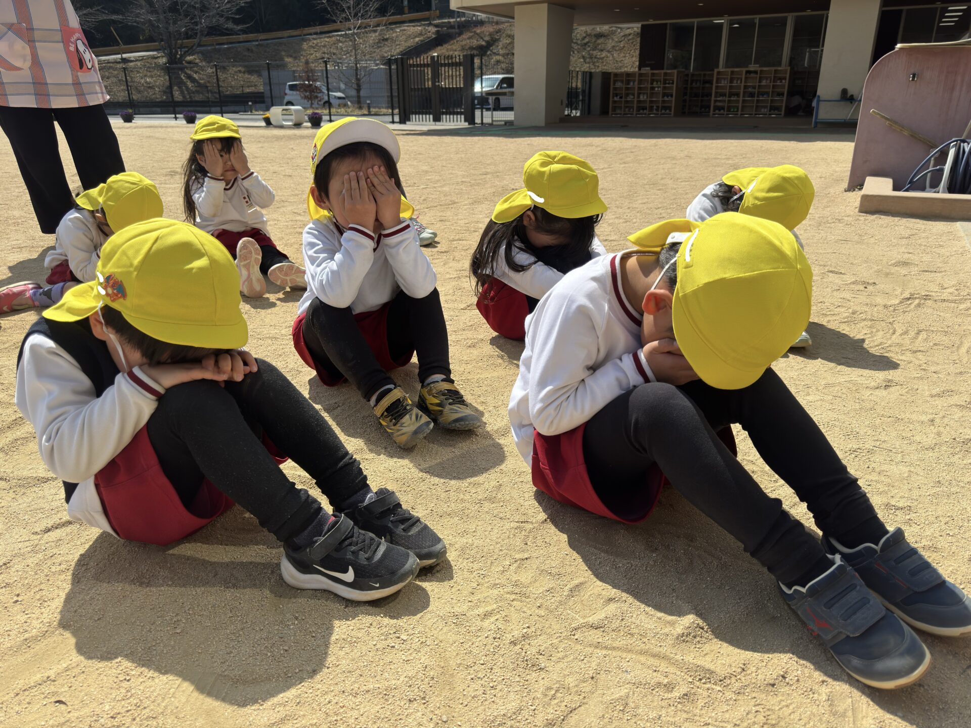 最後にアルファベットを一つずつ復習したあとは、みんなで目を閉じて、だんごむしのポーズに🫣。その間に、園庭のいろいろな場所にアルファベットカードが隠されました。