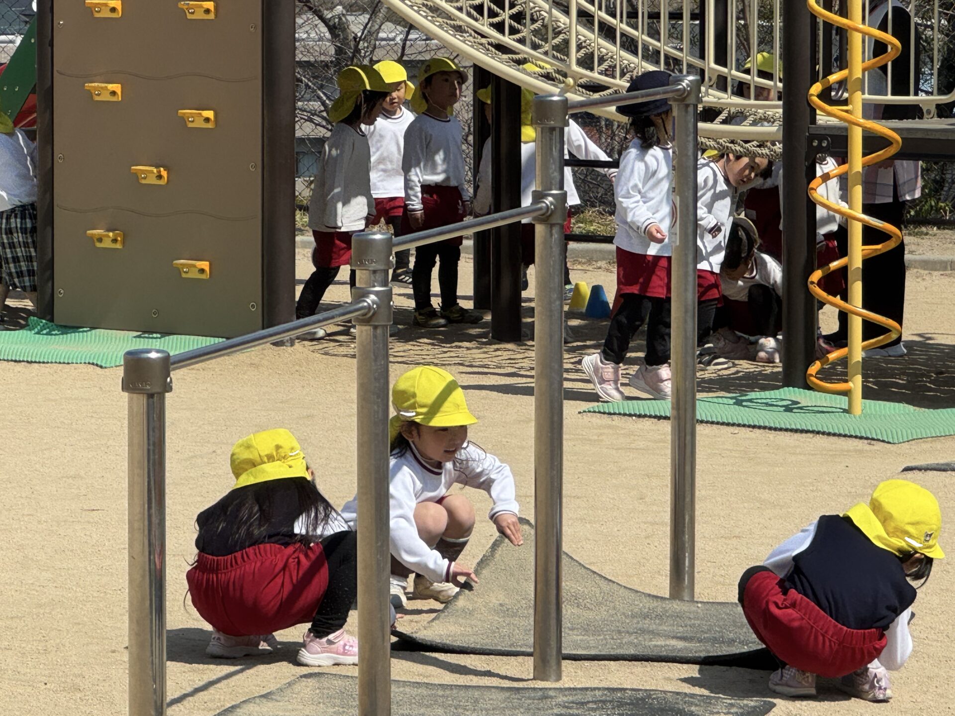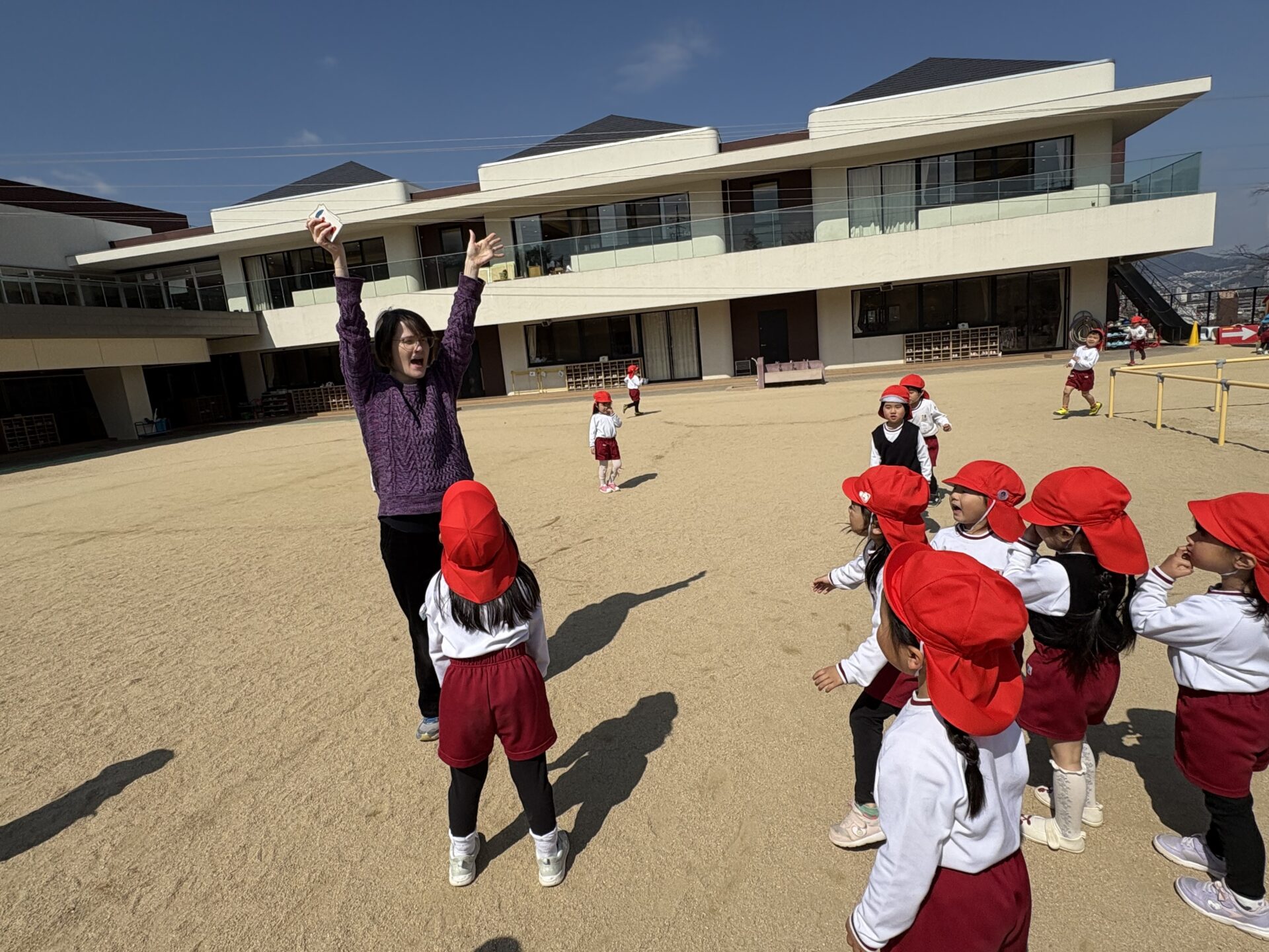 年少さんにとって最後の英語あそびは、お外でのかくれんぼでした! お天気もとてもよく、ワクワクがさらに高まっていました。