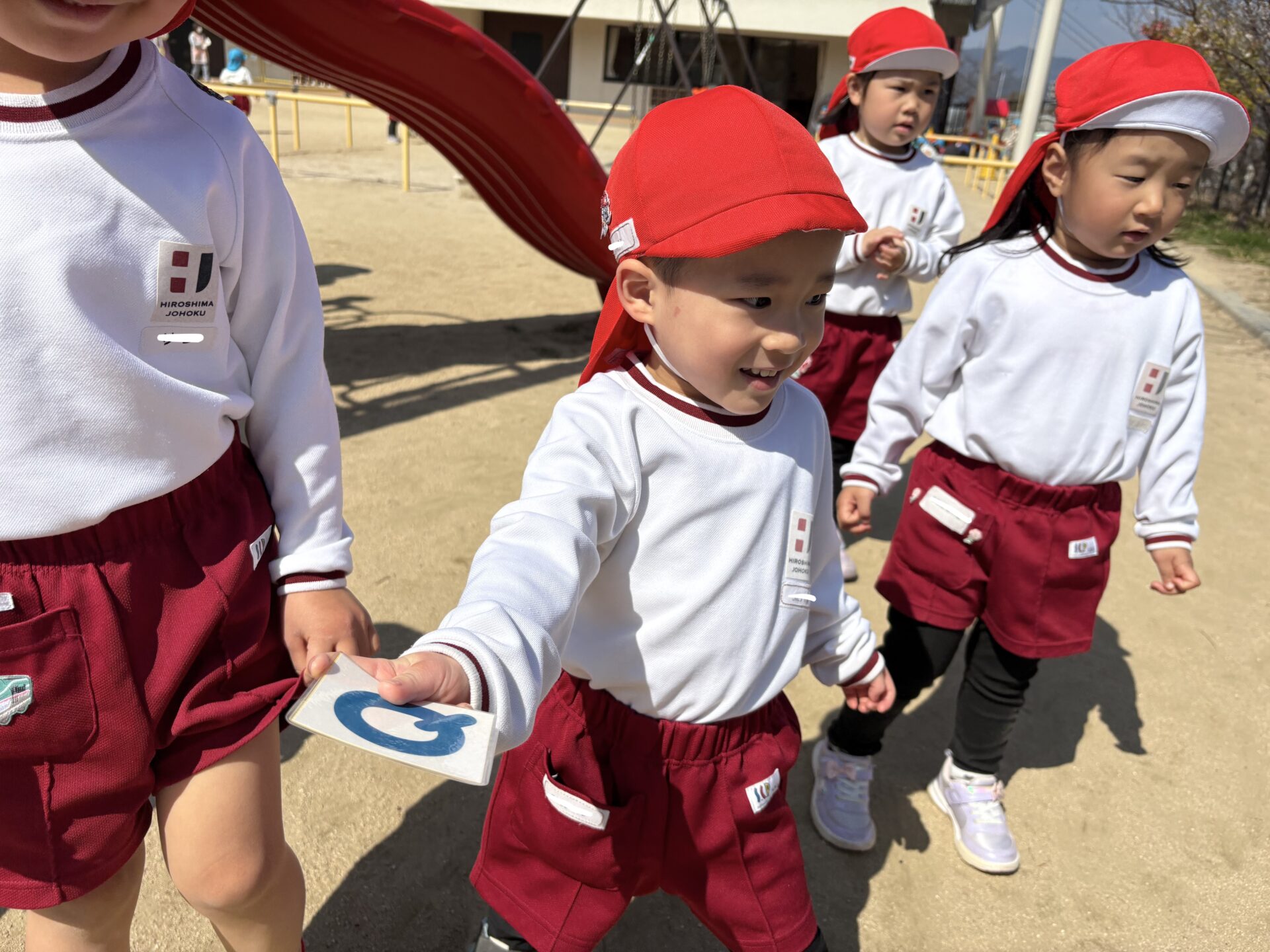 「1, 2, 3!」の合図で、みんな一斉に探しに出発! ベンチやすべり台、木のまわり、ジャングルジムの下など、あちこちでカードを発見していました。にこにこ笑顔がたくさん見られ、とても楽しんでいる様子が伝わってきました。