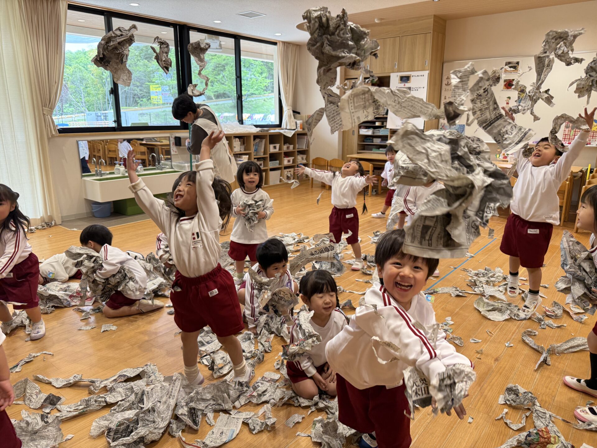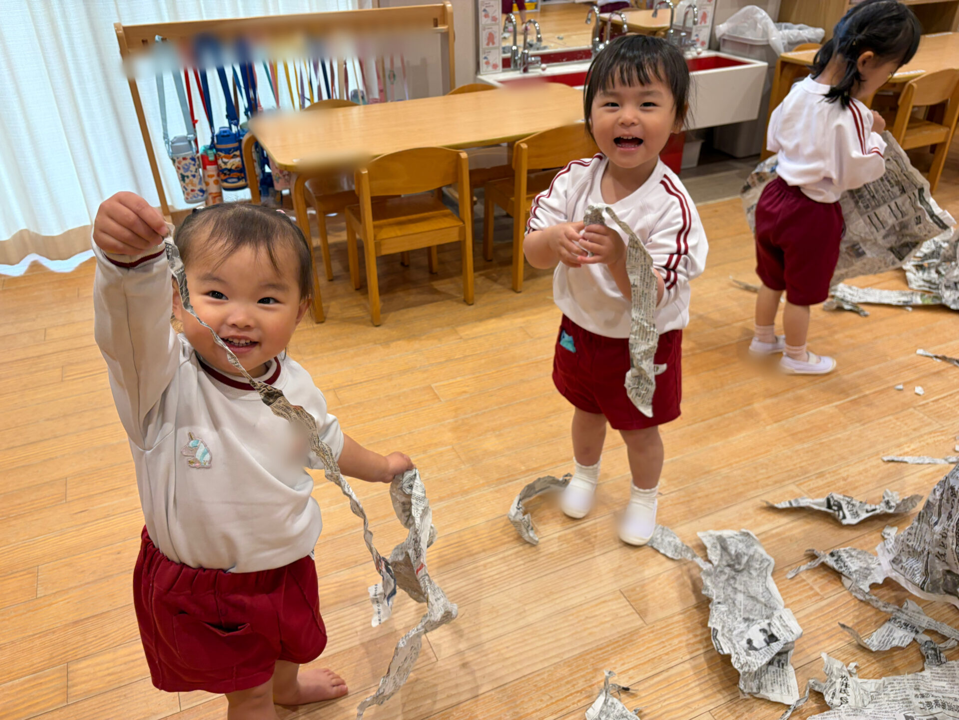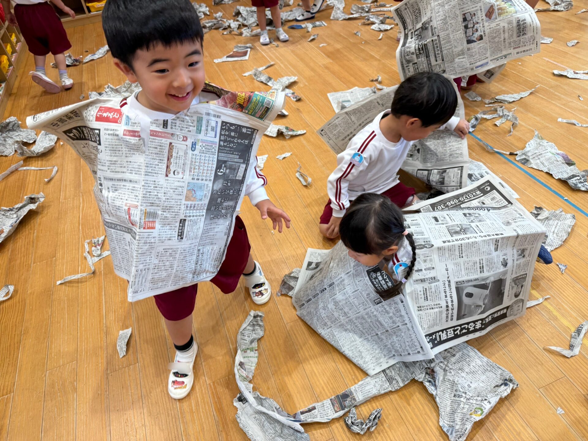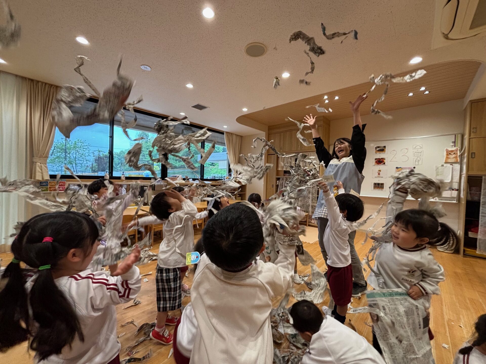 「いっぱいビリビリ破けた!」「アンパンマンのマントにする!!」「おばけになっちゃった!」と嬉しそうな声も聞かれました✨破いた新聞紙を集め「3,2,1 シャワー!!!」と投げ、思い思いに遊ぶ姿が見られました😊