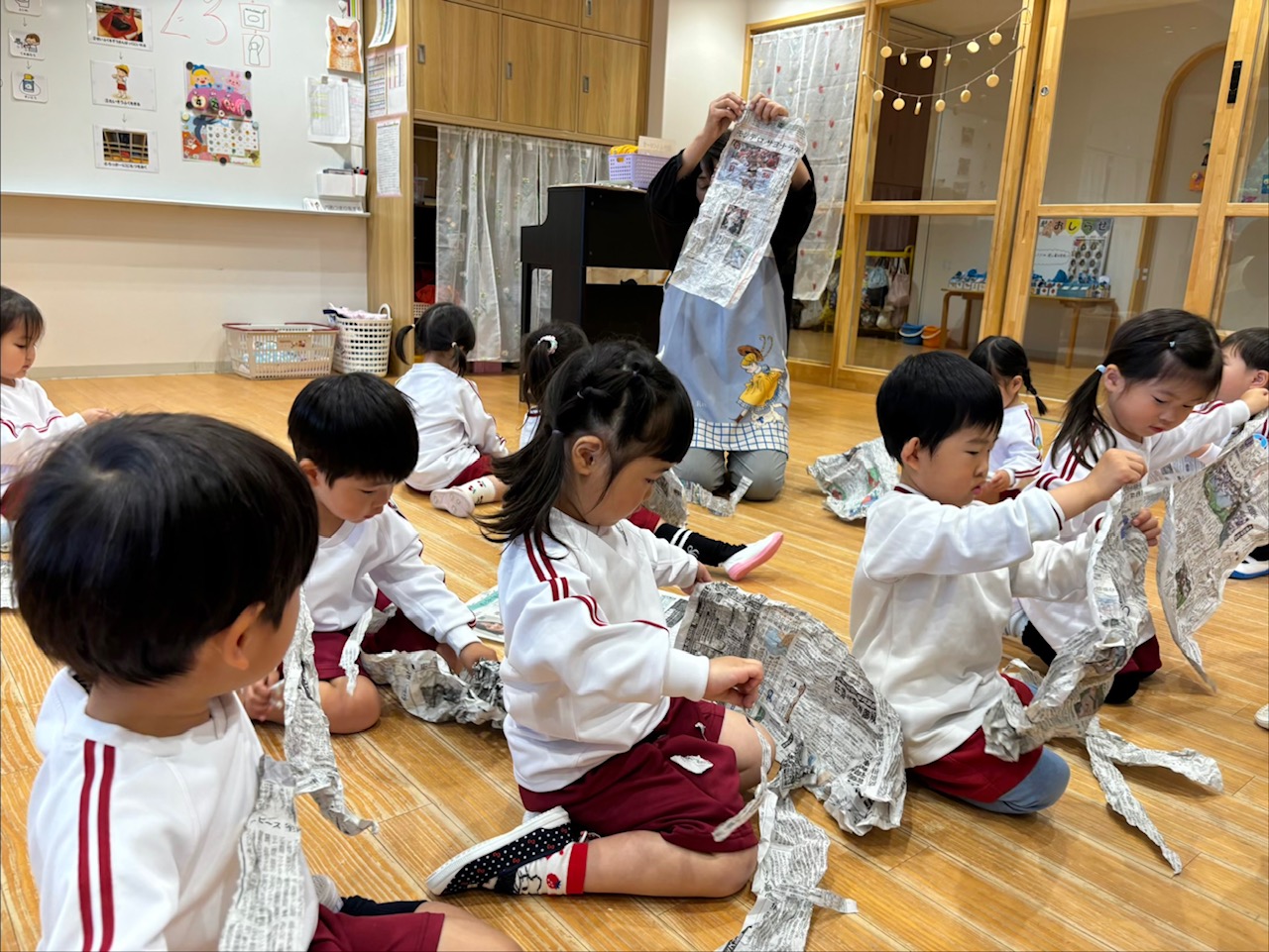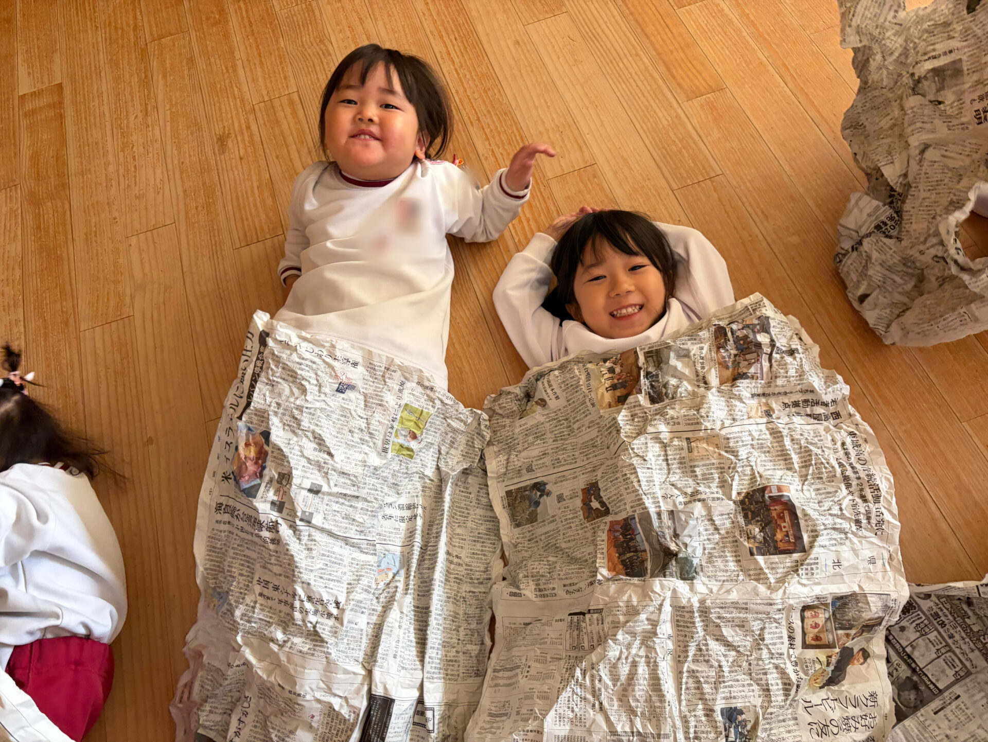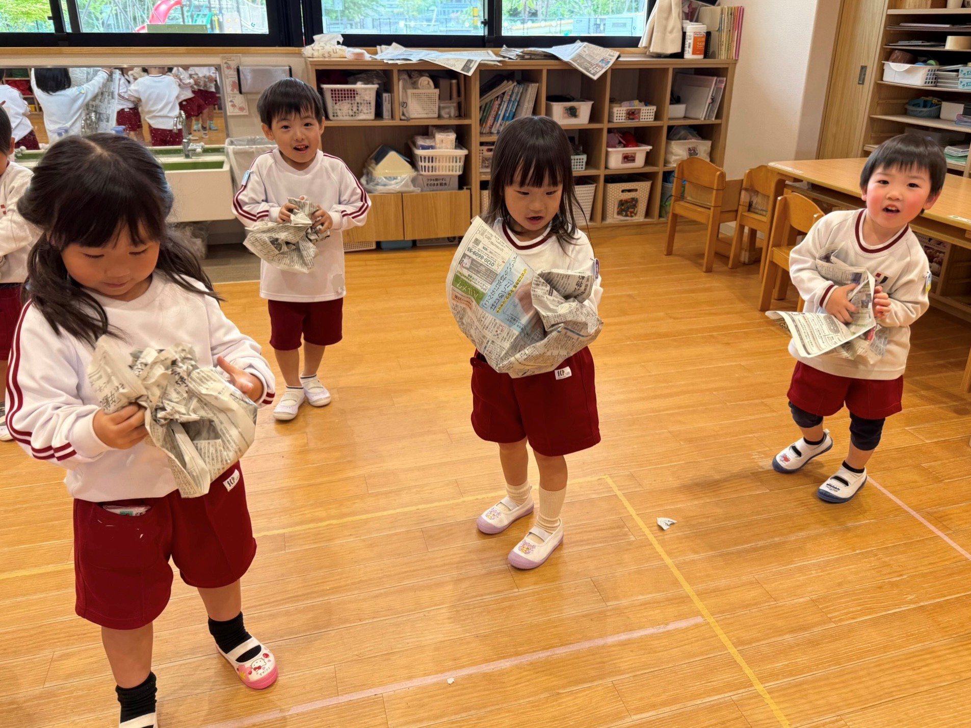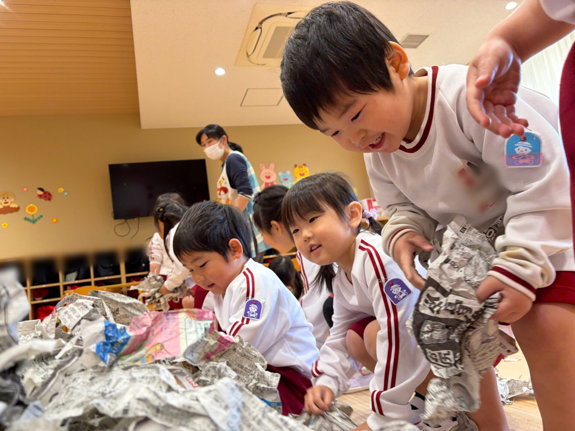 「いっぱいビリビリ破けた!」「アンパンマンのマントにする!!」「おばけになっちゃった!」と嬉しそうな声も聞かれました✨破いた新聞紙を集め「3,2,1 シャワー!!!」と投げ、思い思いに遊ぶ姿が見られました😊