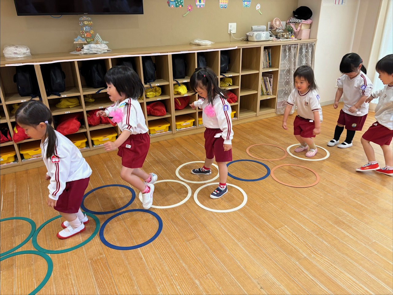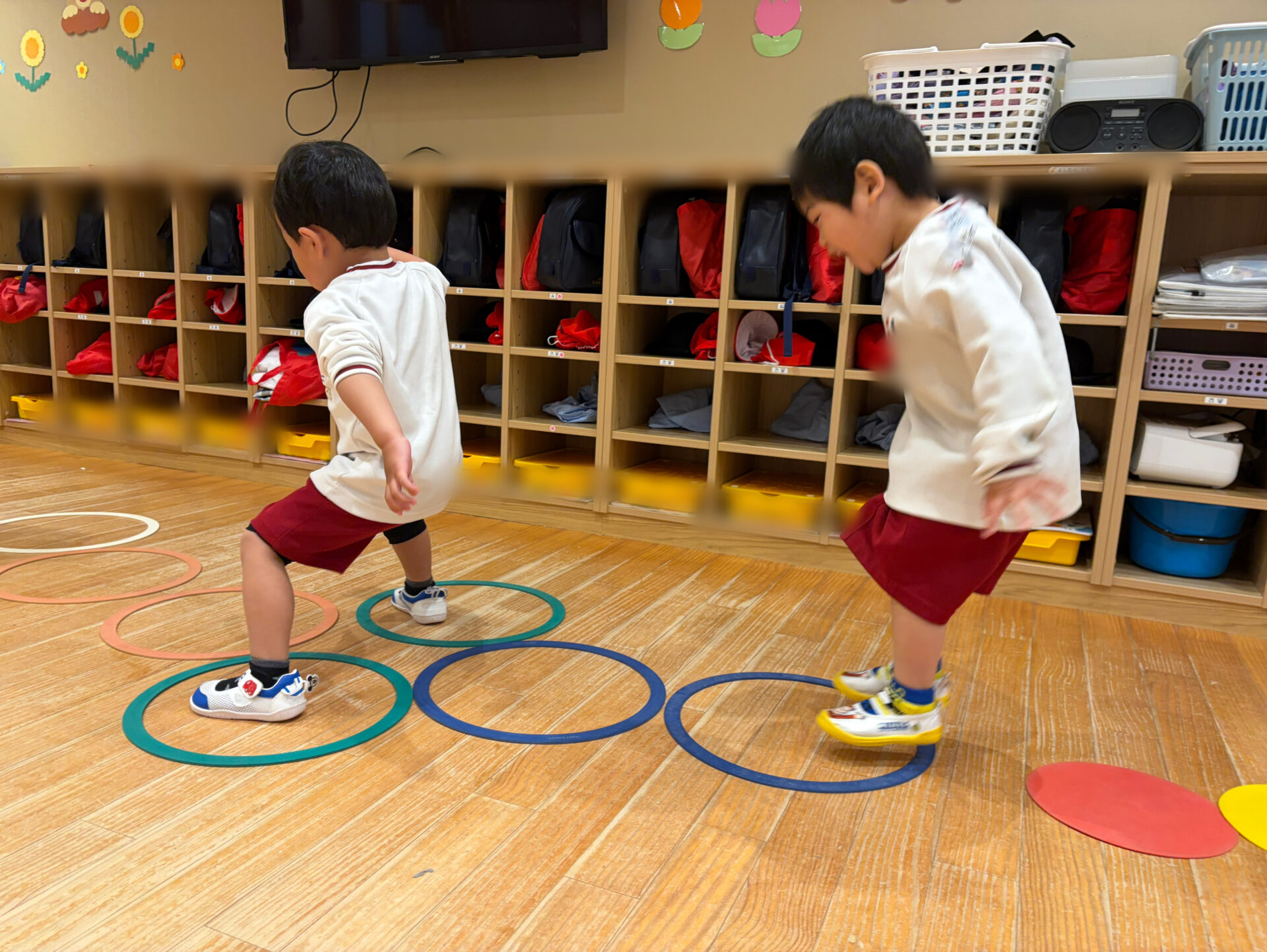 さまざまな動きに挑戦🌟ラバーリングでは、両足でジャンプしながら「グー・パー」とリズムよく進み、体を大きく使って楽しんでいます。