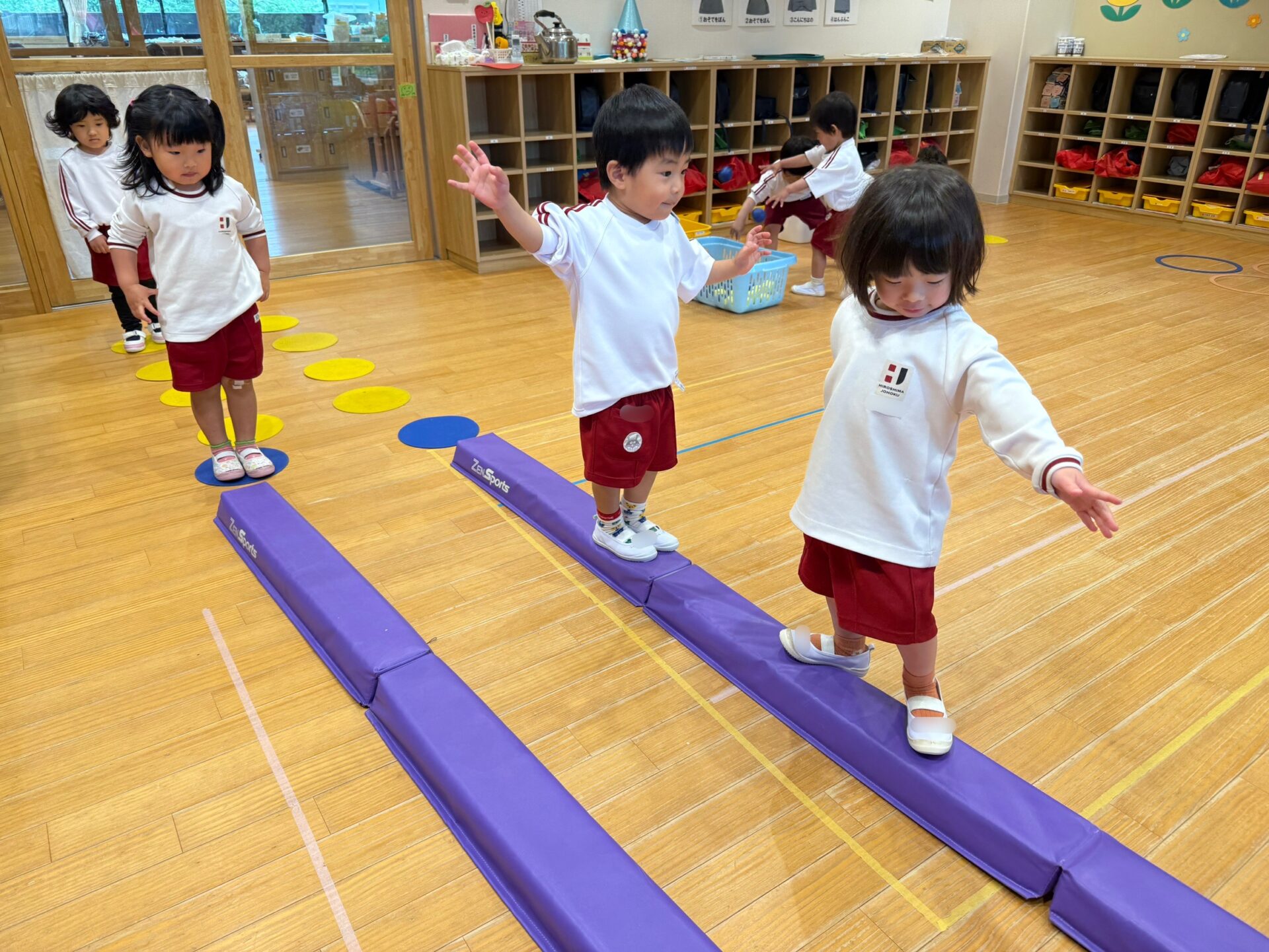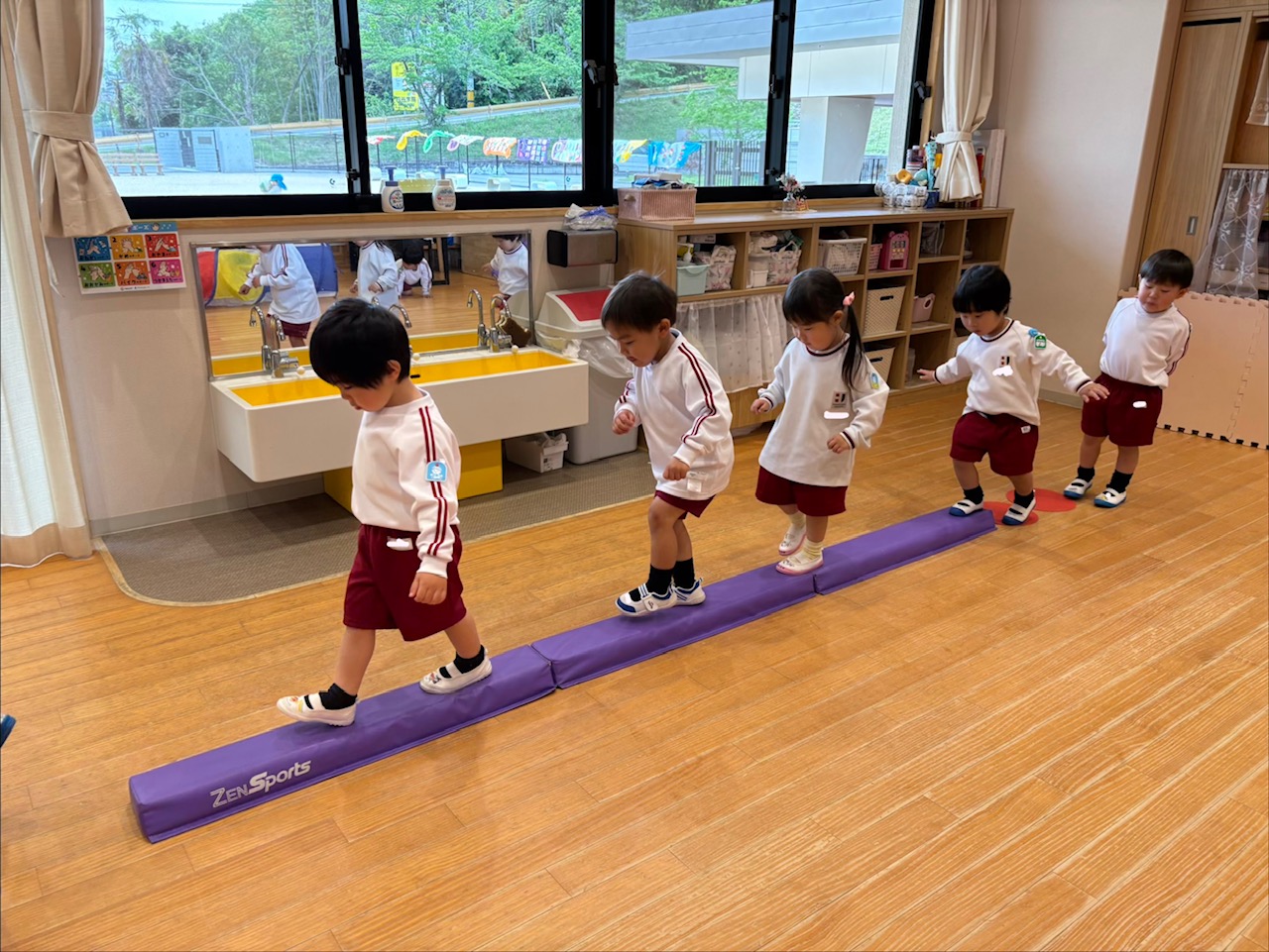 平均台では、落ちないようにバランスを取りながら「わにさんに食べられないようにしないと!!」と慎重に慎重に歩き、一歩一歩進んでいます。