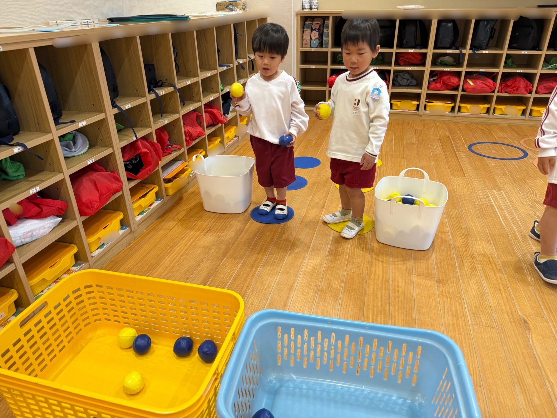 ボール入れでは、箱をよく見ながら狙いを定め、繰り返し挑戦する姿が見られました。