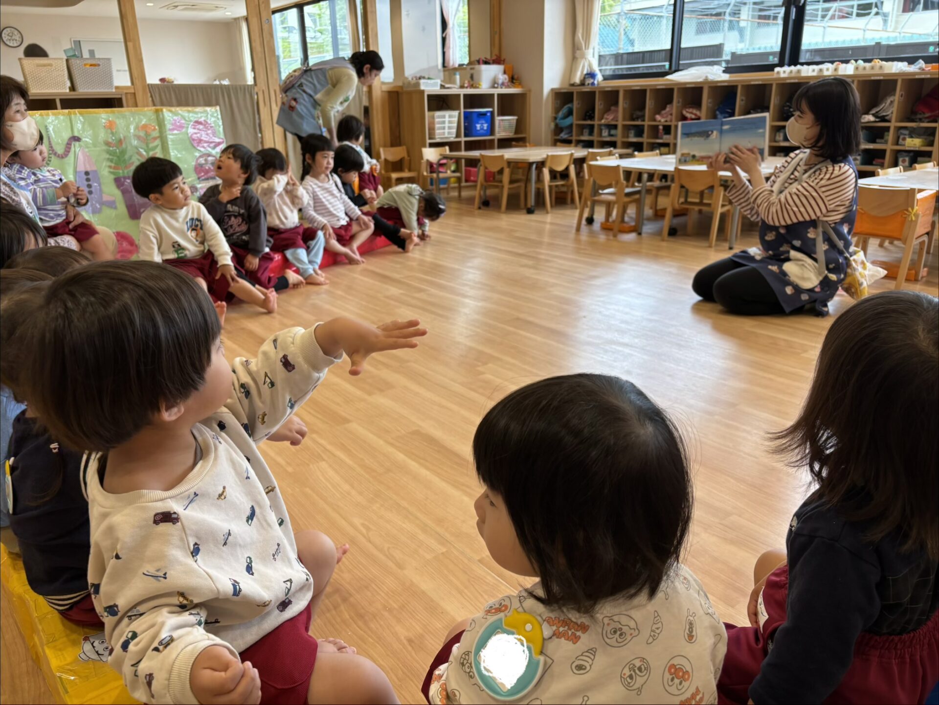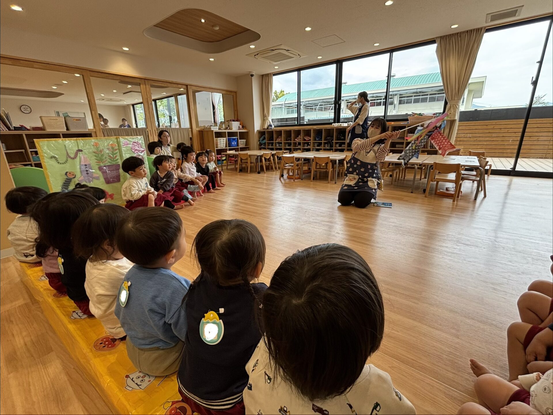 『こいのぼりくんのさんぽ』の絵本を見ると、「大きい!」「とんでる!」と夢中な園児です☺