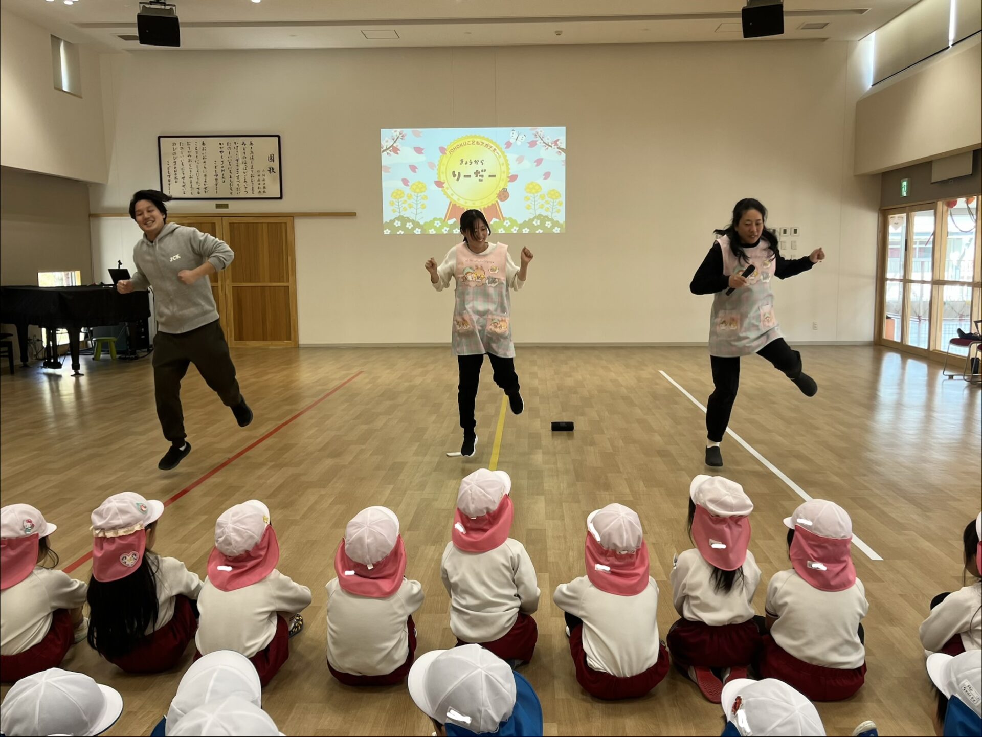 先生紹介の後は、年長組の先生たちが得意な《リズムジャンプ》を披露しました!《リズムジャンプ》は音楽に合わせて、両足ジャンプや片足ジャンプ、ステップを繰り返す運動遊びです!園児から「やってみたい!」「私もできるかも!」と声が挙がり早速みんなでチャレンジしました😊