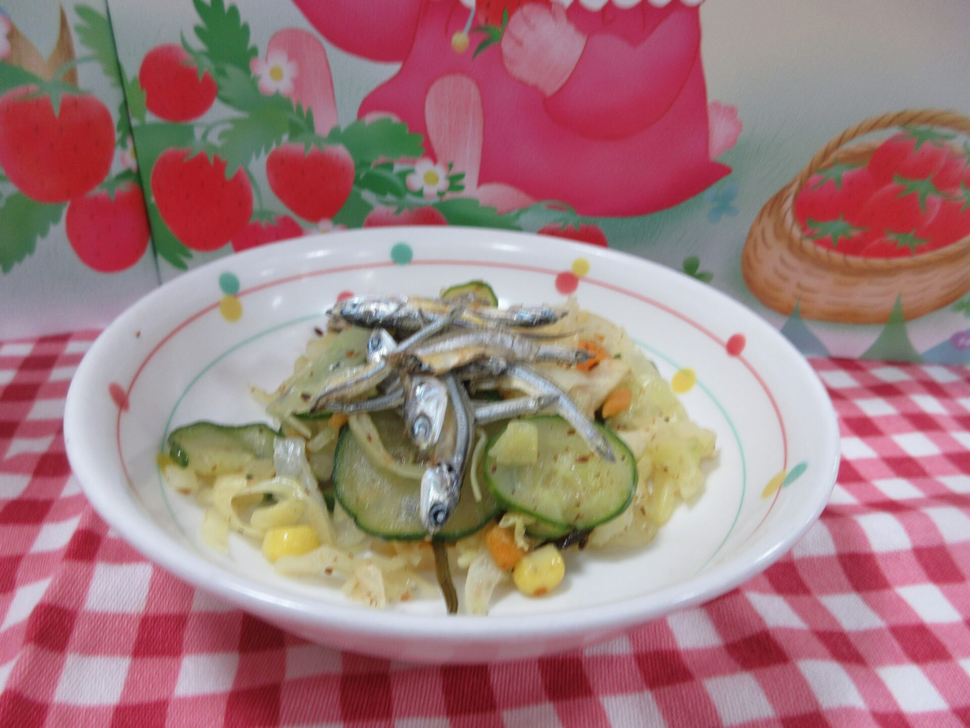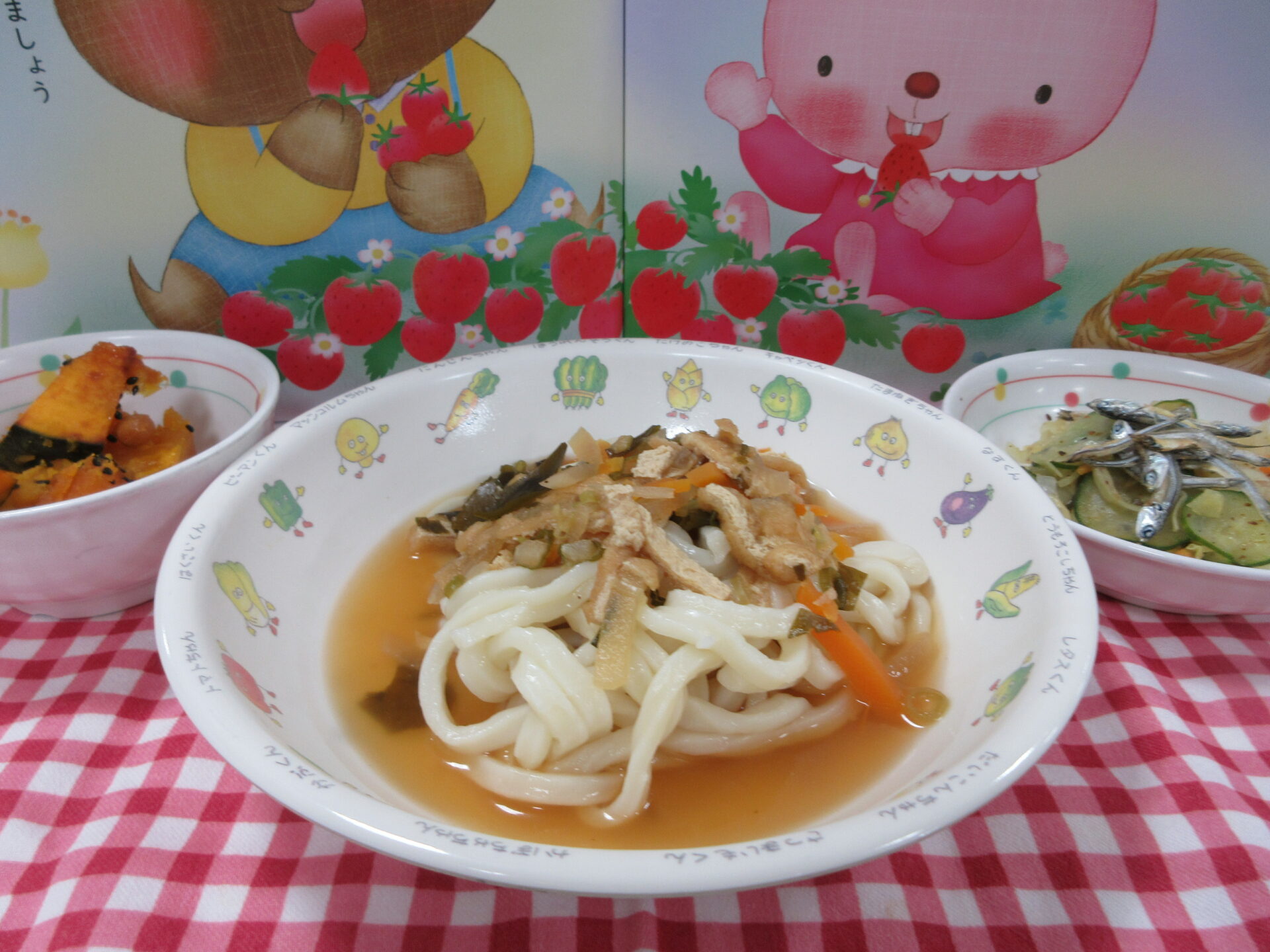 【🦊きつねうどん 野菜サラダ かぼちゃと大豆の大学炒め 食べる煮干し】