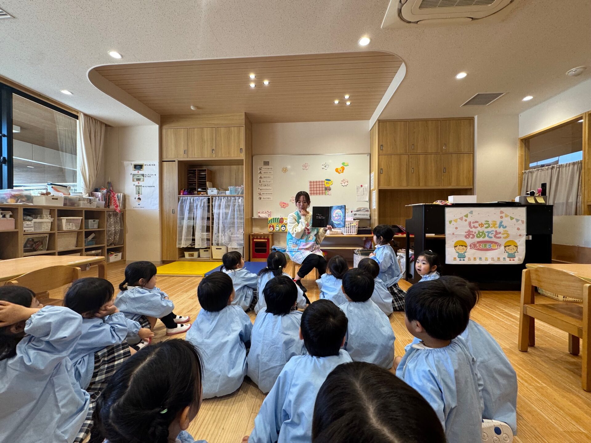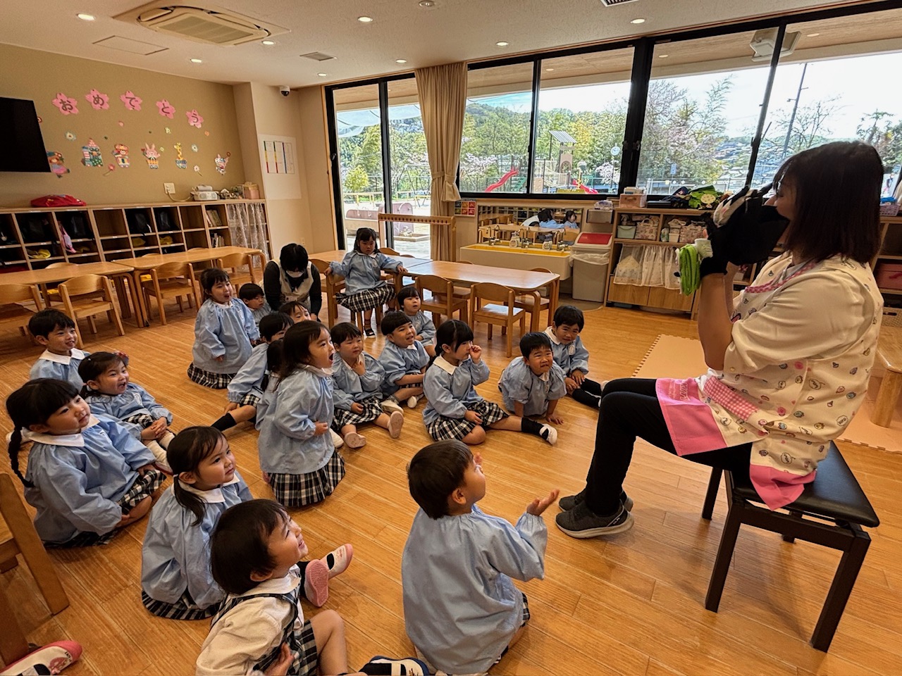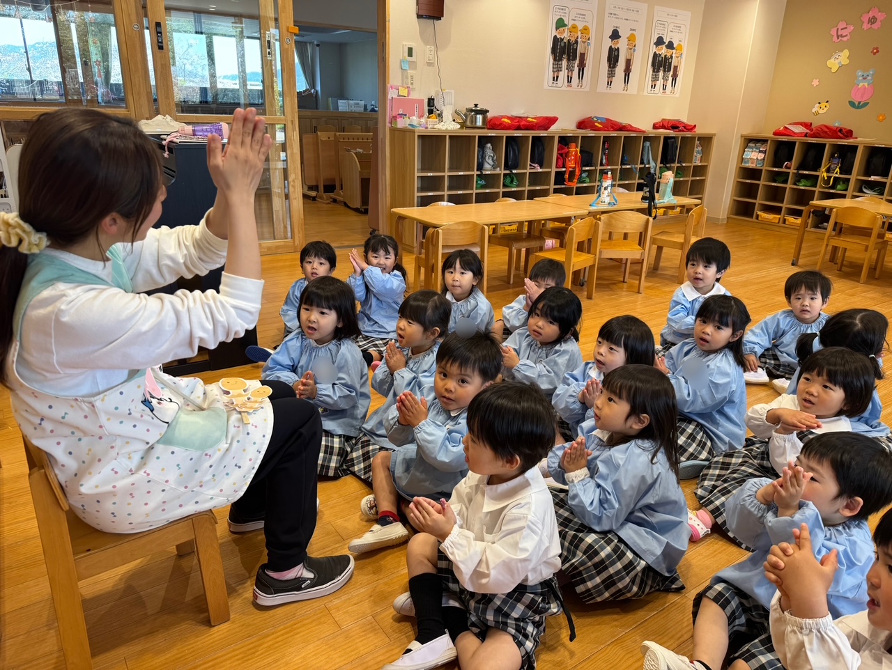 お部屋では、絵本を見たり、お歌をうたったりしながら、少しずつ園での時間を楽しむ姿が見られました♪