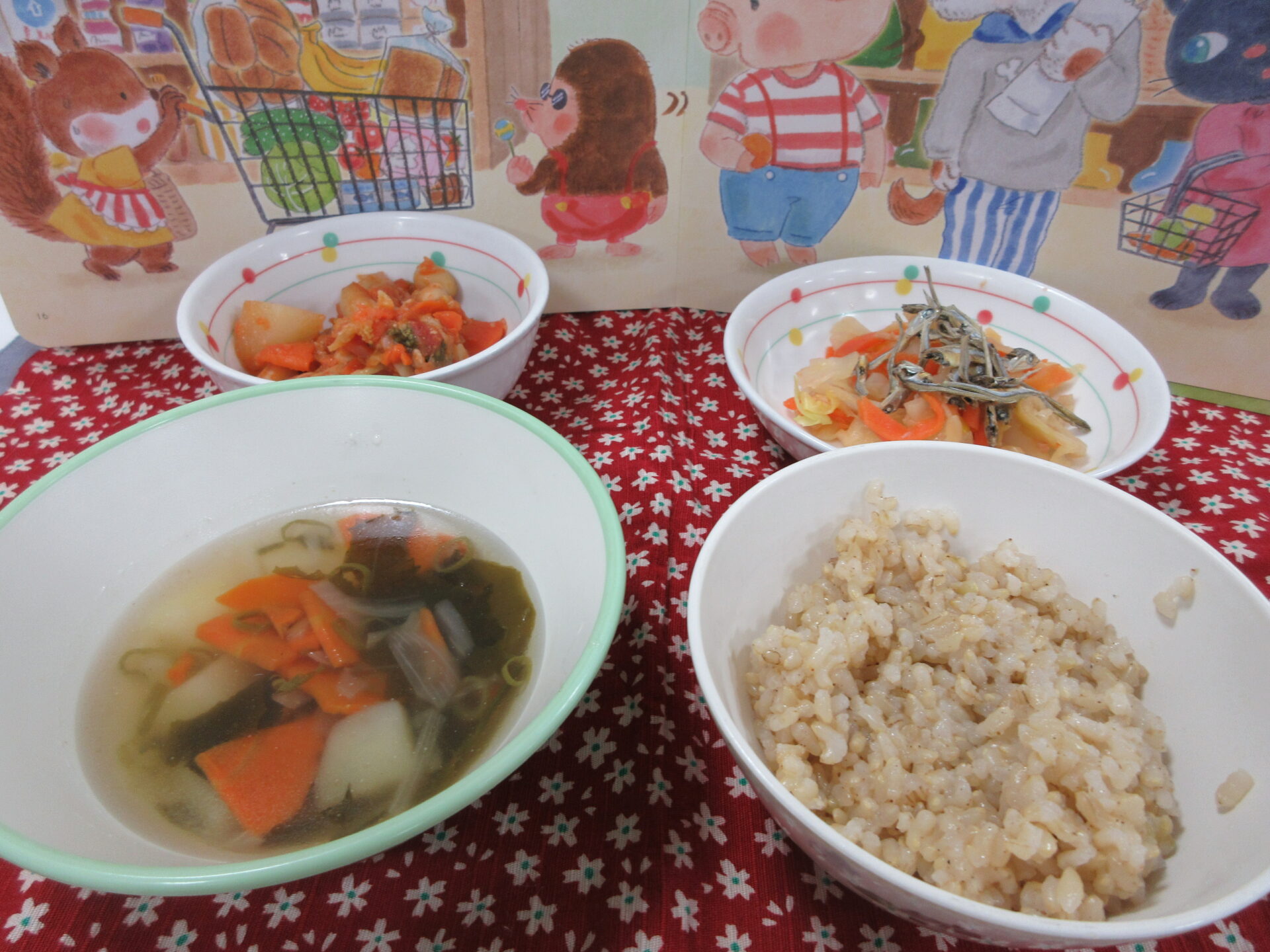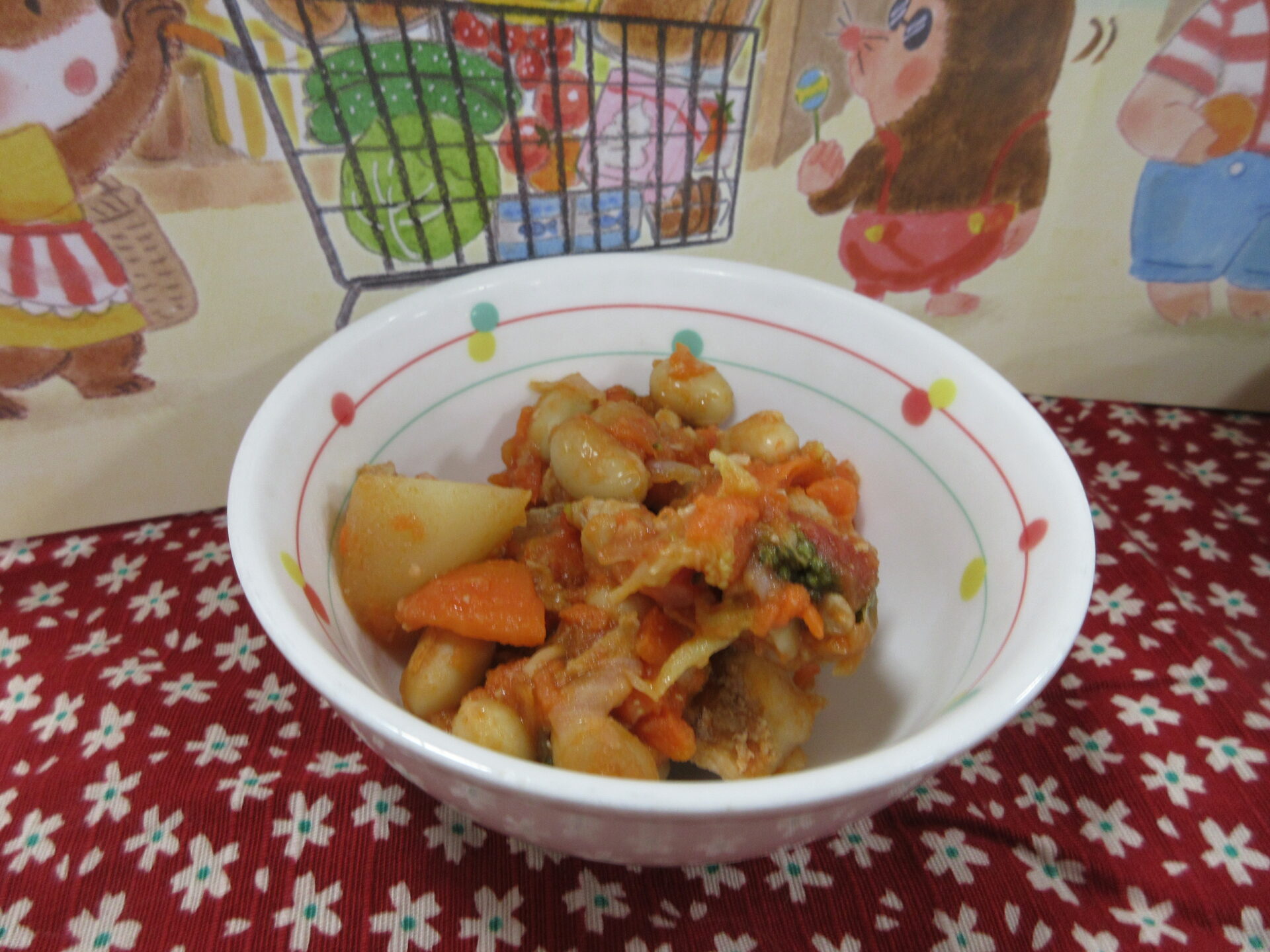 ポークビーンズは豚肉が入り、大豆と🍅トマト味でとても美味しかったです。スープにはわかめやじゃがいもが入っていました。