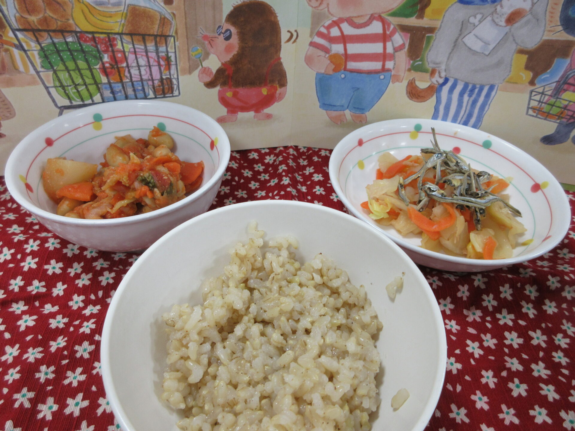 【玄米ご飯 ポークビーンズ 🌽コーンサラダ 野菜スープ 食べる煮干し】