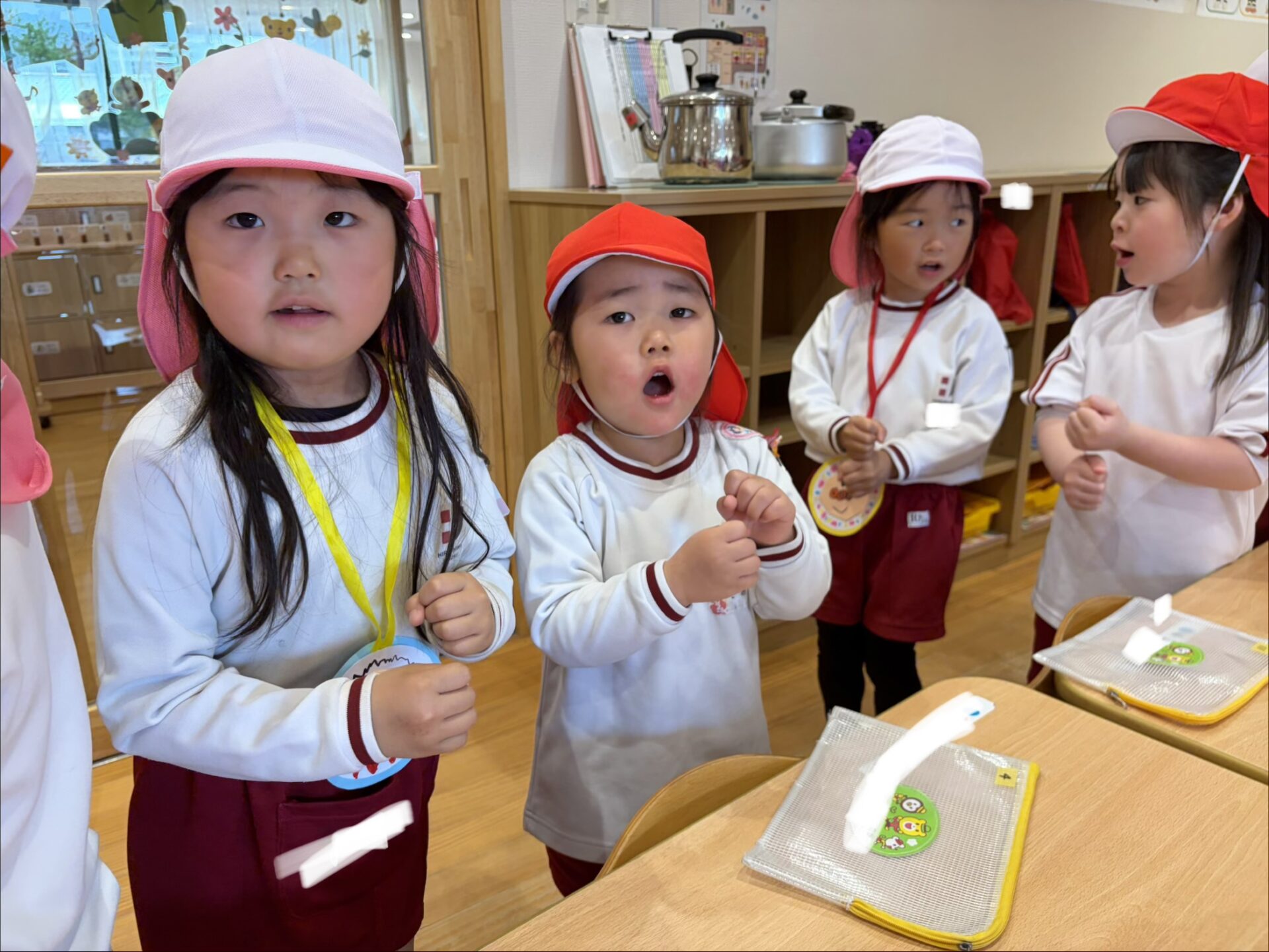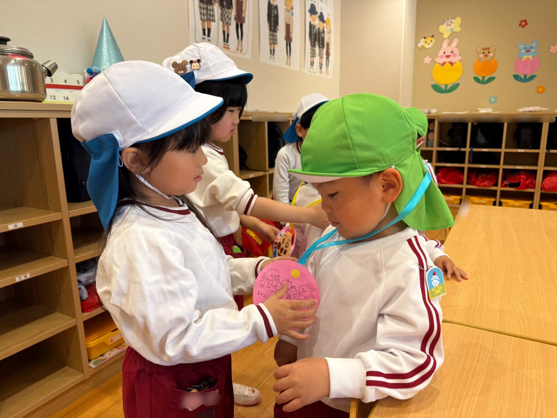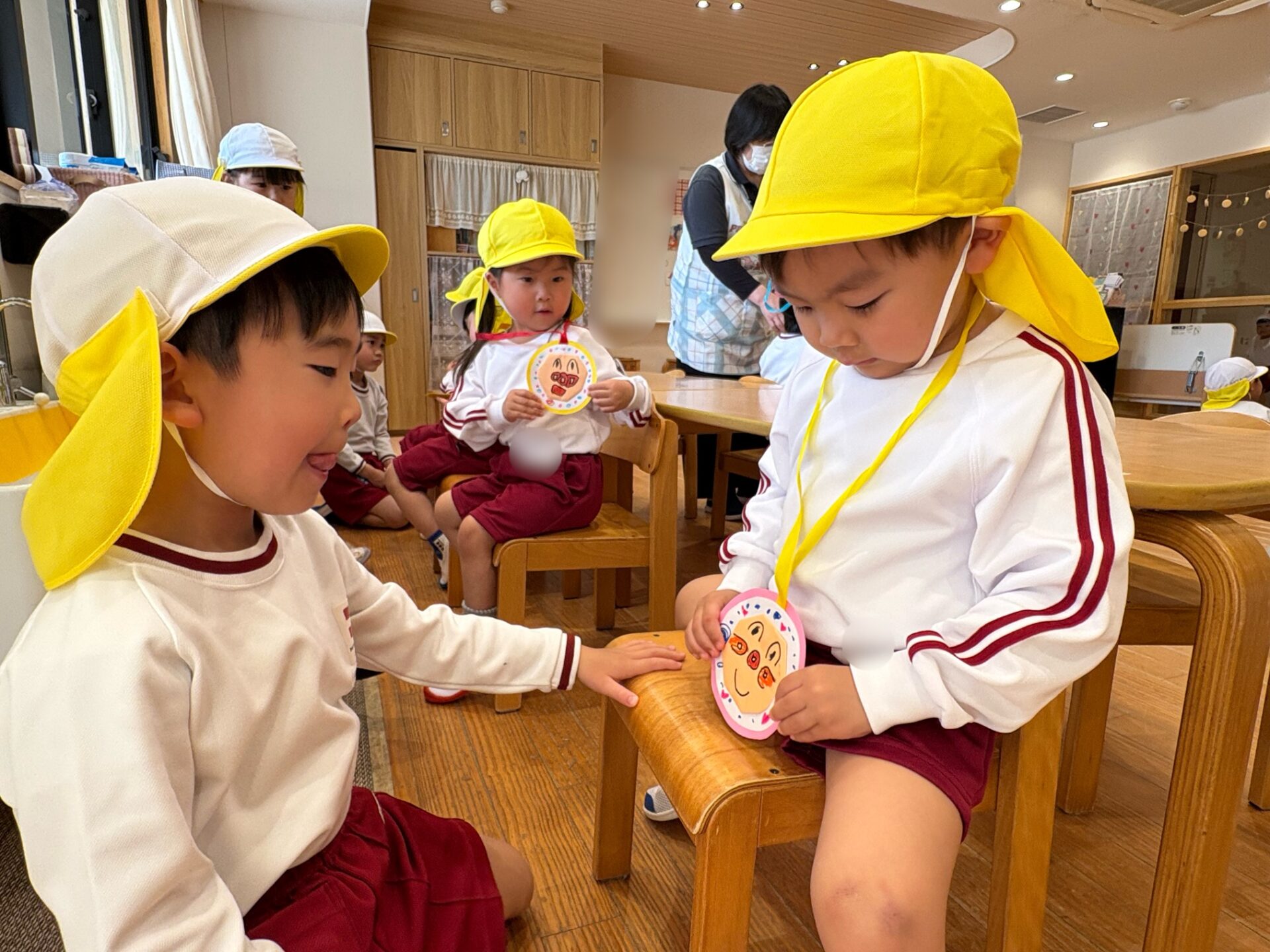 17日は乳児組さんと年中組さんのところへ・・・。「困ったことがあったら助けてあげるからね☺」「一緒に遊ぼうね💖」と声をかけメダルをプレゼントしました🎁