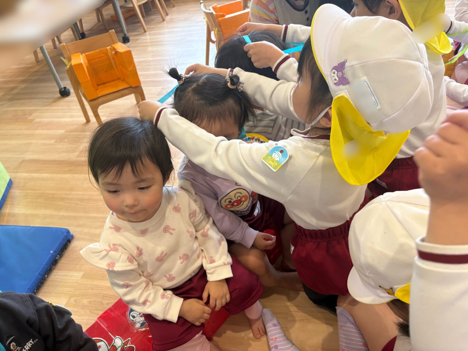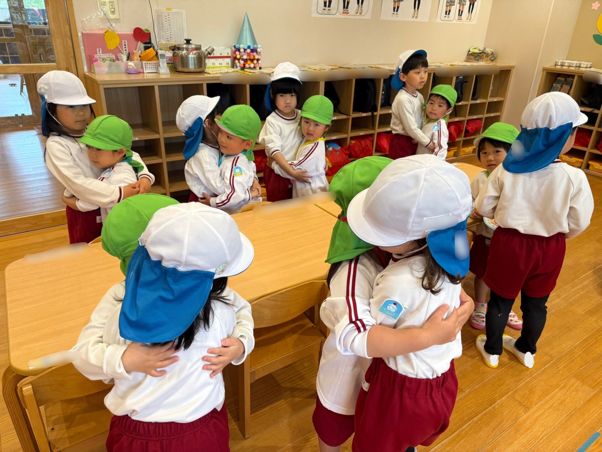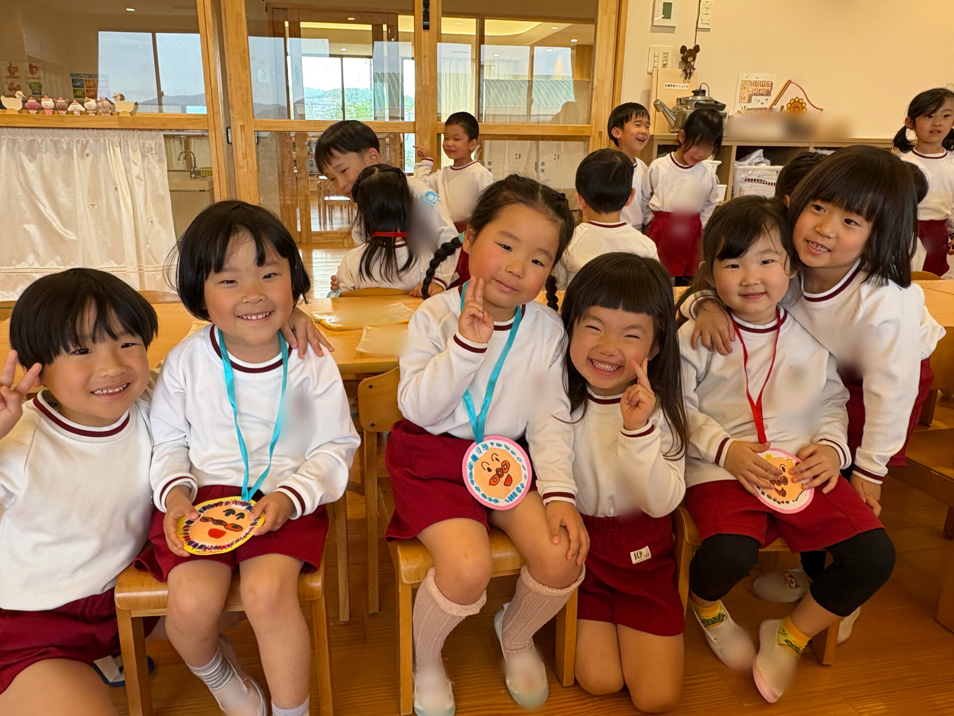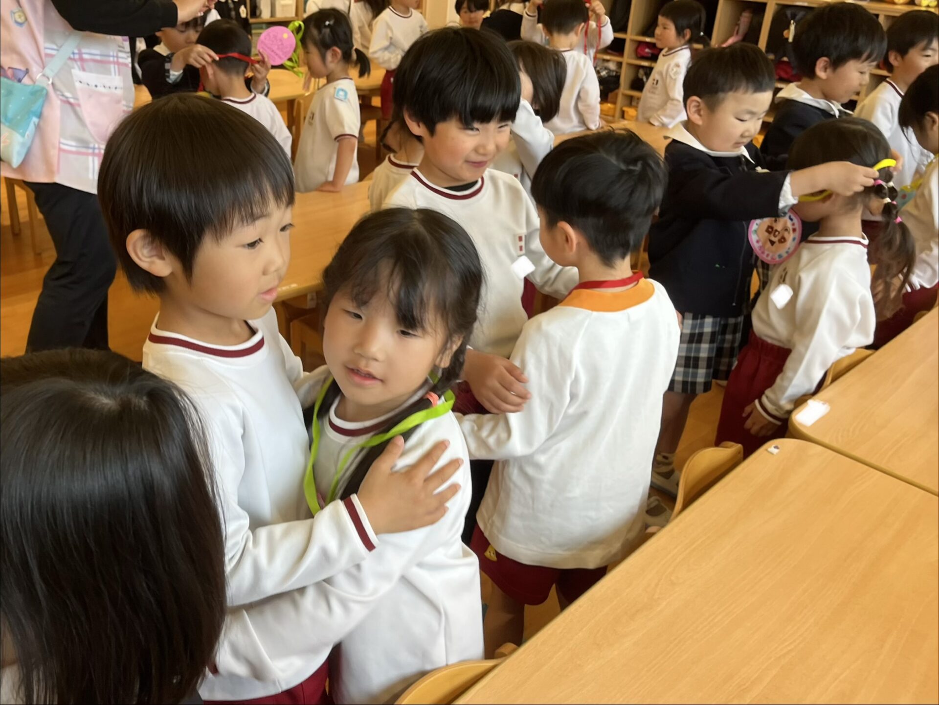 20日は年長組が年少組さんのところへ・・・。一緒に歌を歌ったり、触れ合い遊びをしたりして仲を深めました✨歓迎会の最後は「たくさん一緒に遊ぼうね🎵」と声をかけ、アンパンマンのメダルをプレゼントしました💖園庭に出ると年長児が優しく年少児を誘って遊ぶ姿も見られましたよ😊