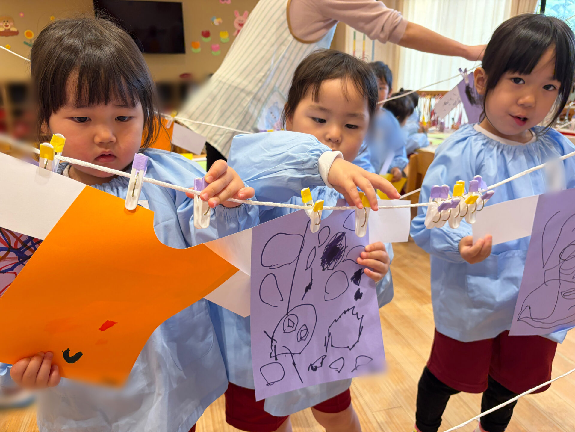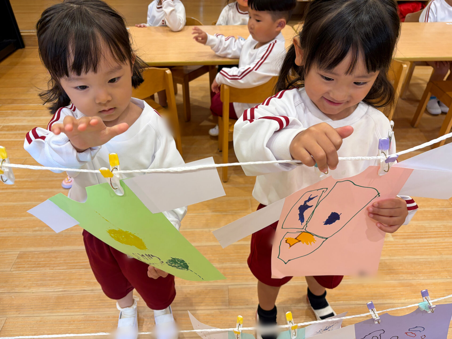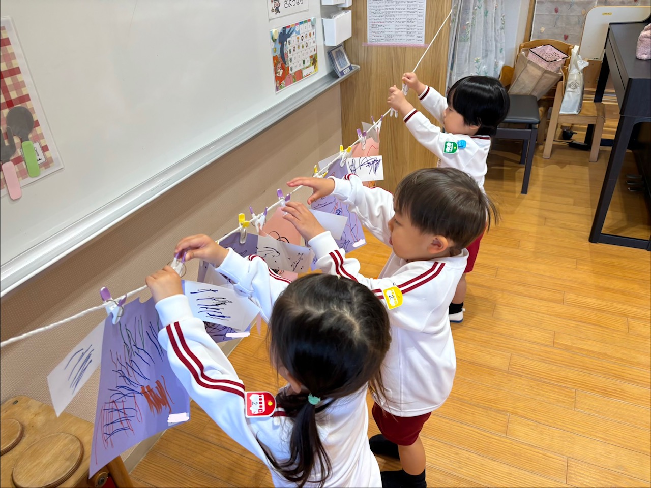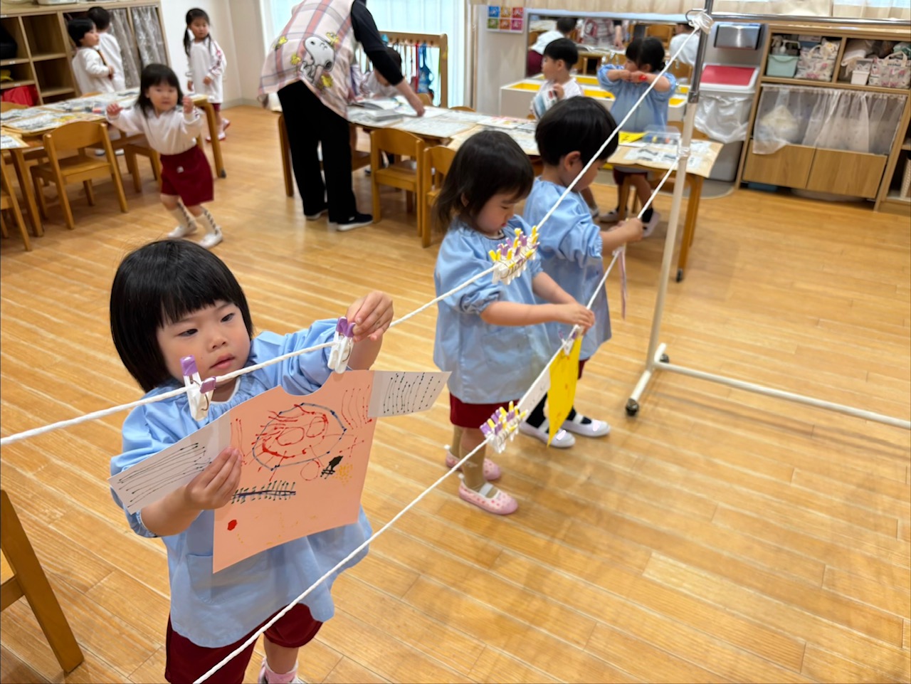 出来上がったお洋服は、物干し竿に洗濯ばさみで挟んで干しました。指先を一生懸命使いながら洗濯ばさみを開き、上手に挟もうとする姿が見られました。お家の人の姿を思い浮かべながら、「こうやってやるんだよね!」と楽しそうに取り組んでいました✨
