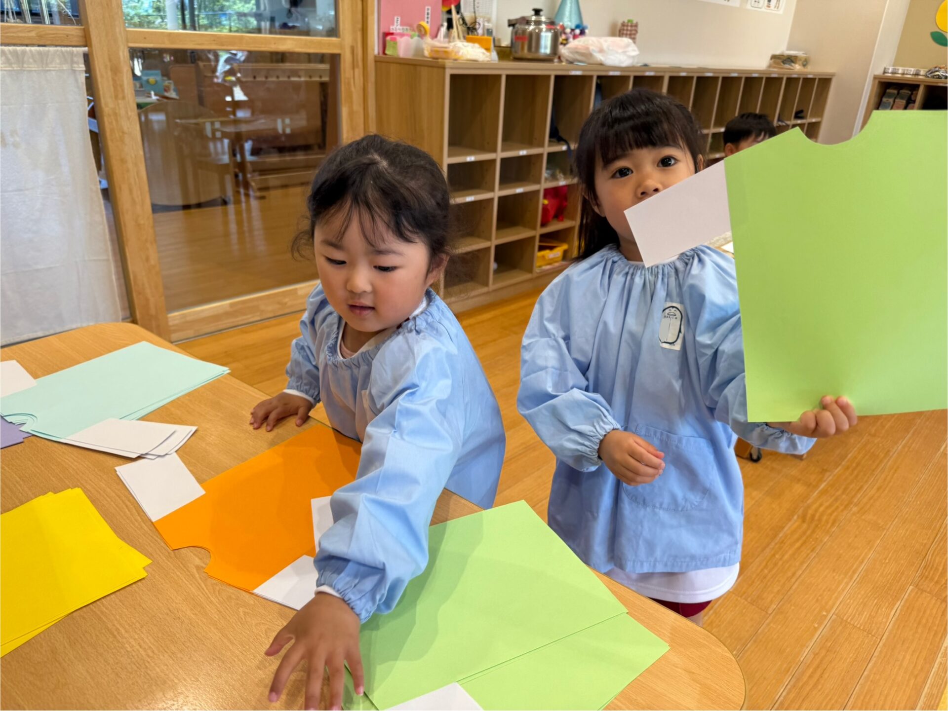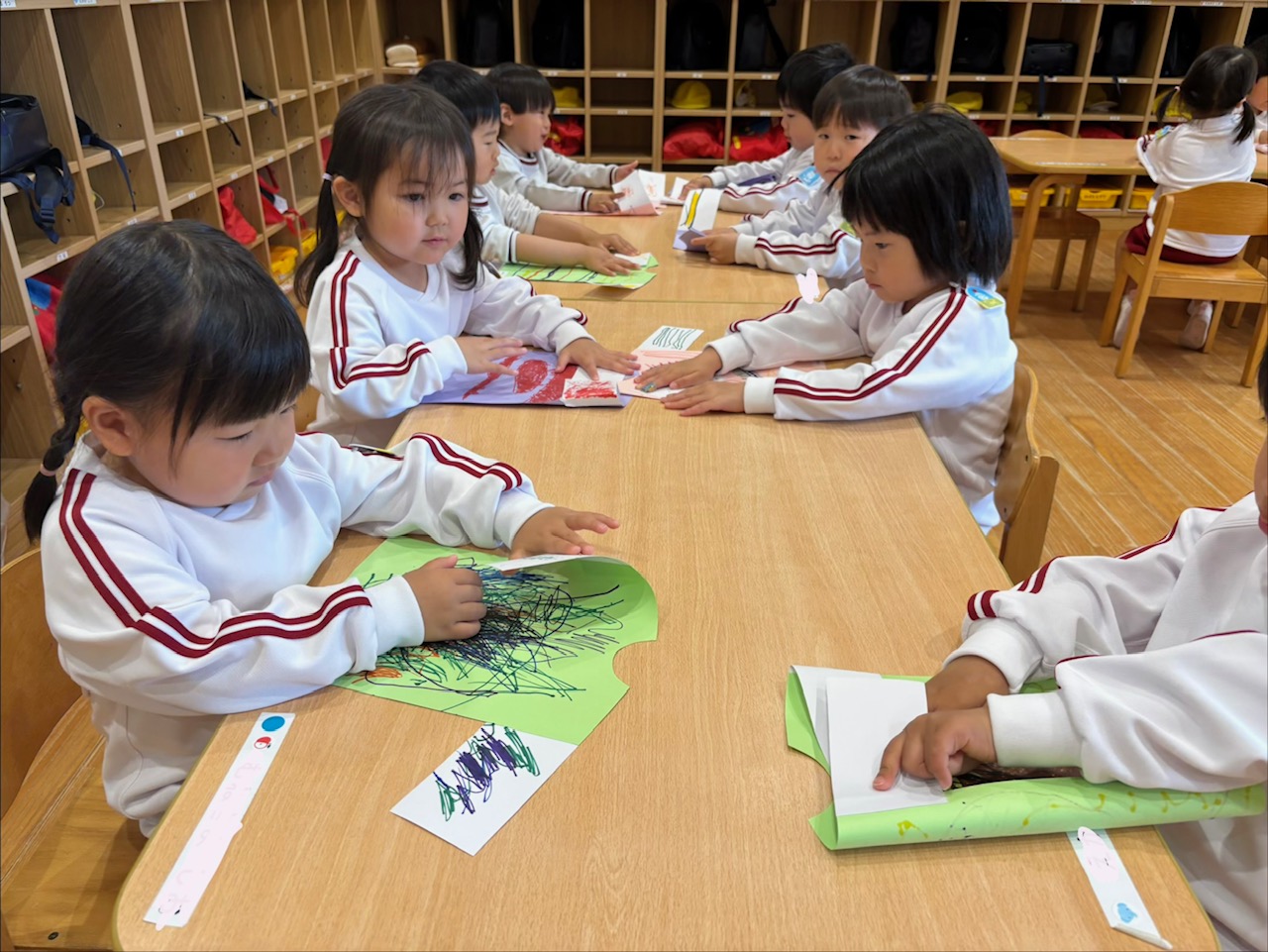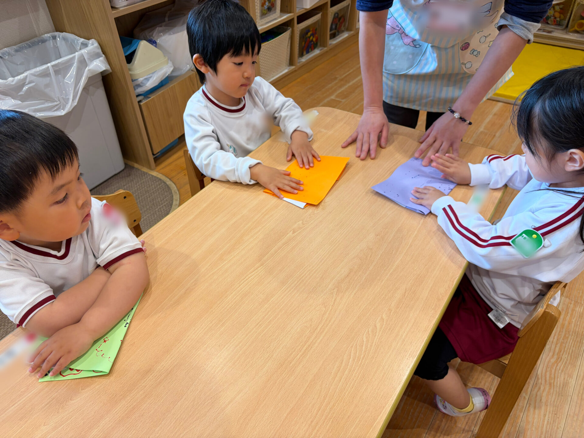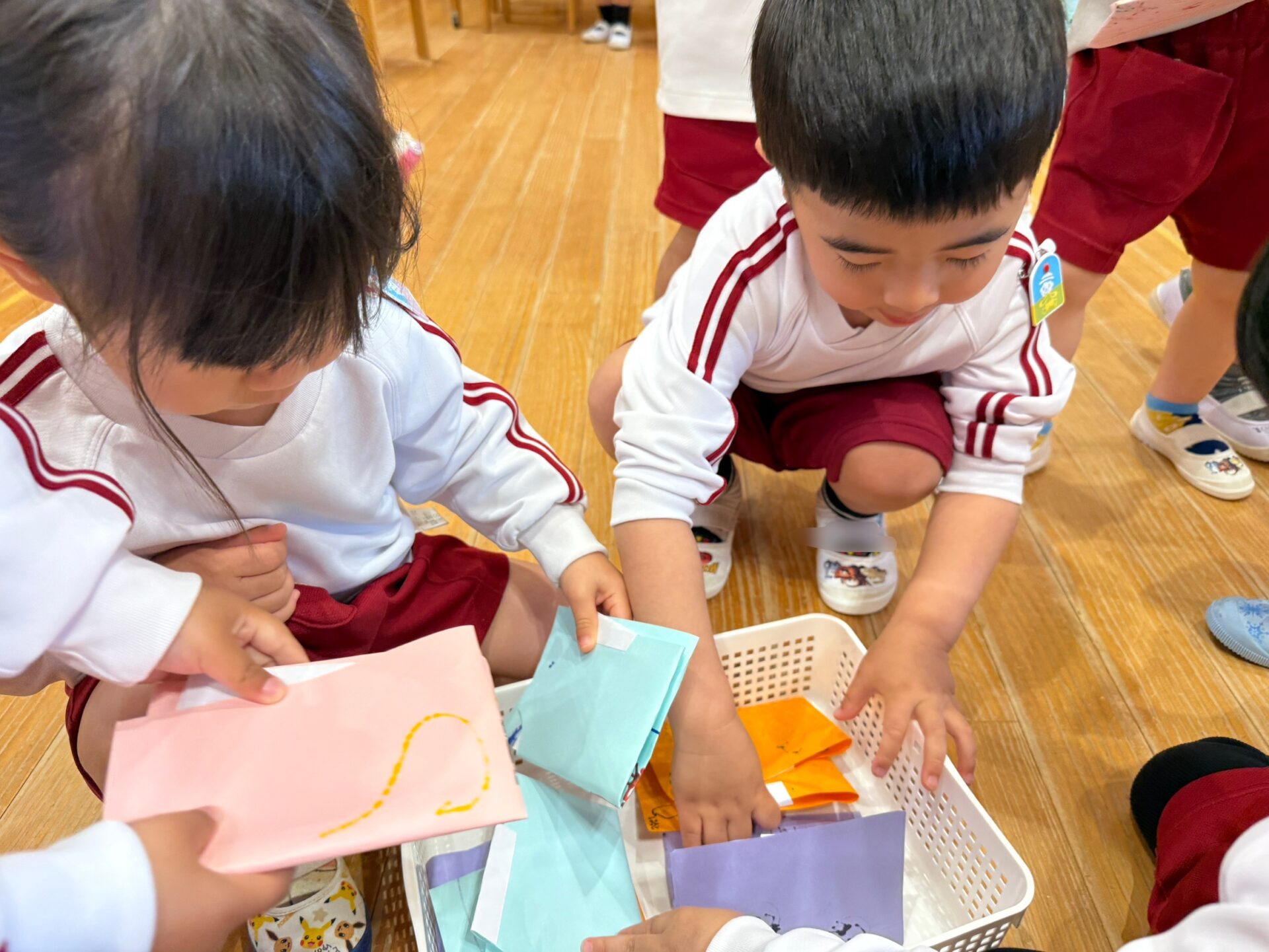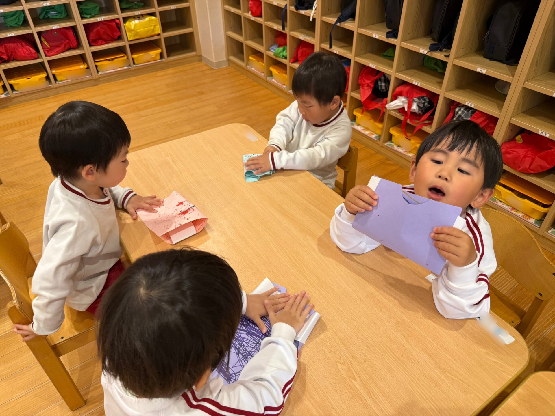 年少組では、制服から体操服へ着替える活動を行っています。遊びを通して覚えたお洋服のたたみ方も、日々の生活の中で意欲的に取り組んでいます。是非お家でも、いっしょにおたたみしてみてくださいね!