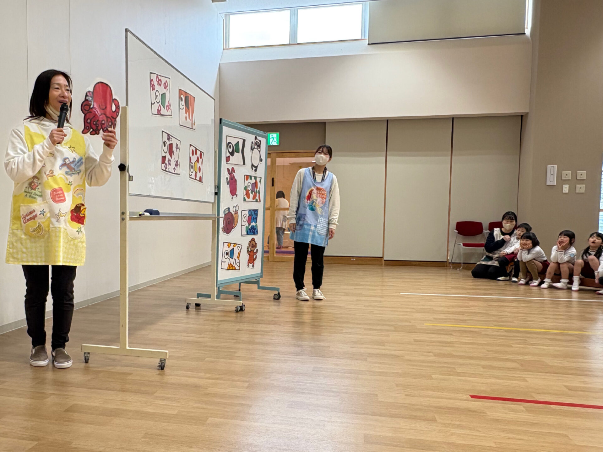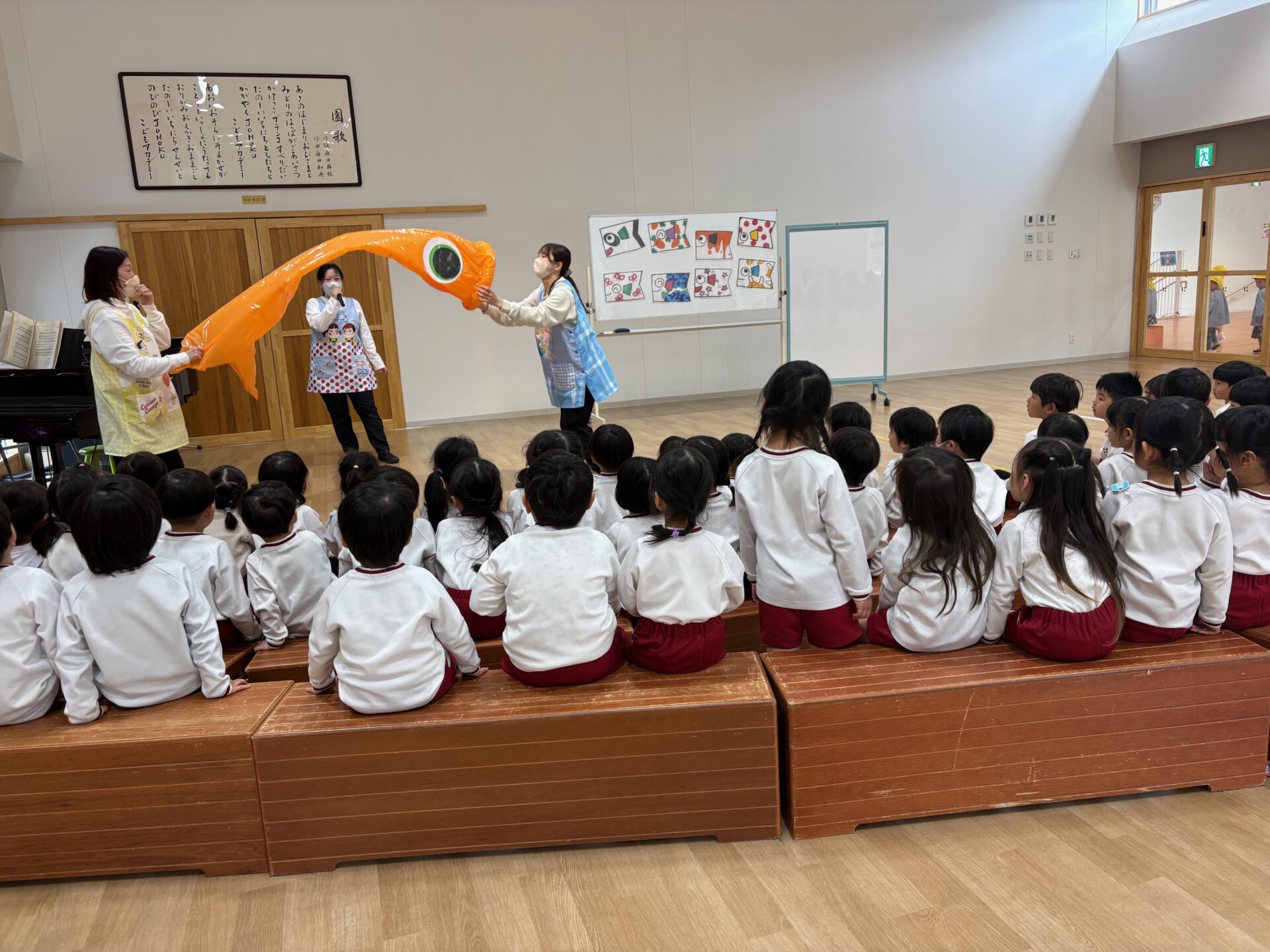 最初にホールで、パネルシアター『誰が描いたこいのぼり?』を楽しみました。いろいろな動物たちが描いたこいのぼりを見て、「これは誰のかな?」「体と同じもようだって?」と考えながら、当てるゲームに大盛り上がりでした✨