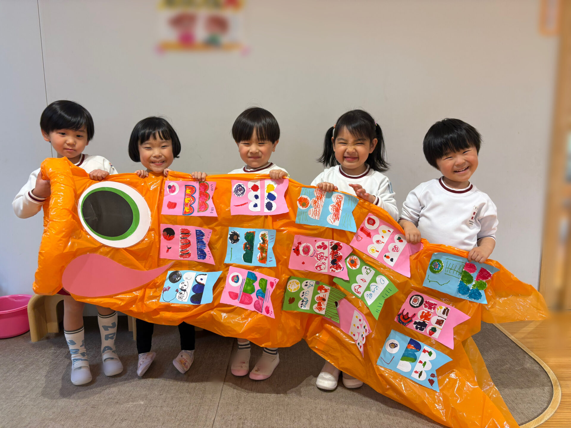 クラスの大きなこいのぼりにのせて✨「元気に泳いでね!」とみんな嬉しそうでした✨