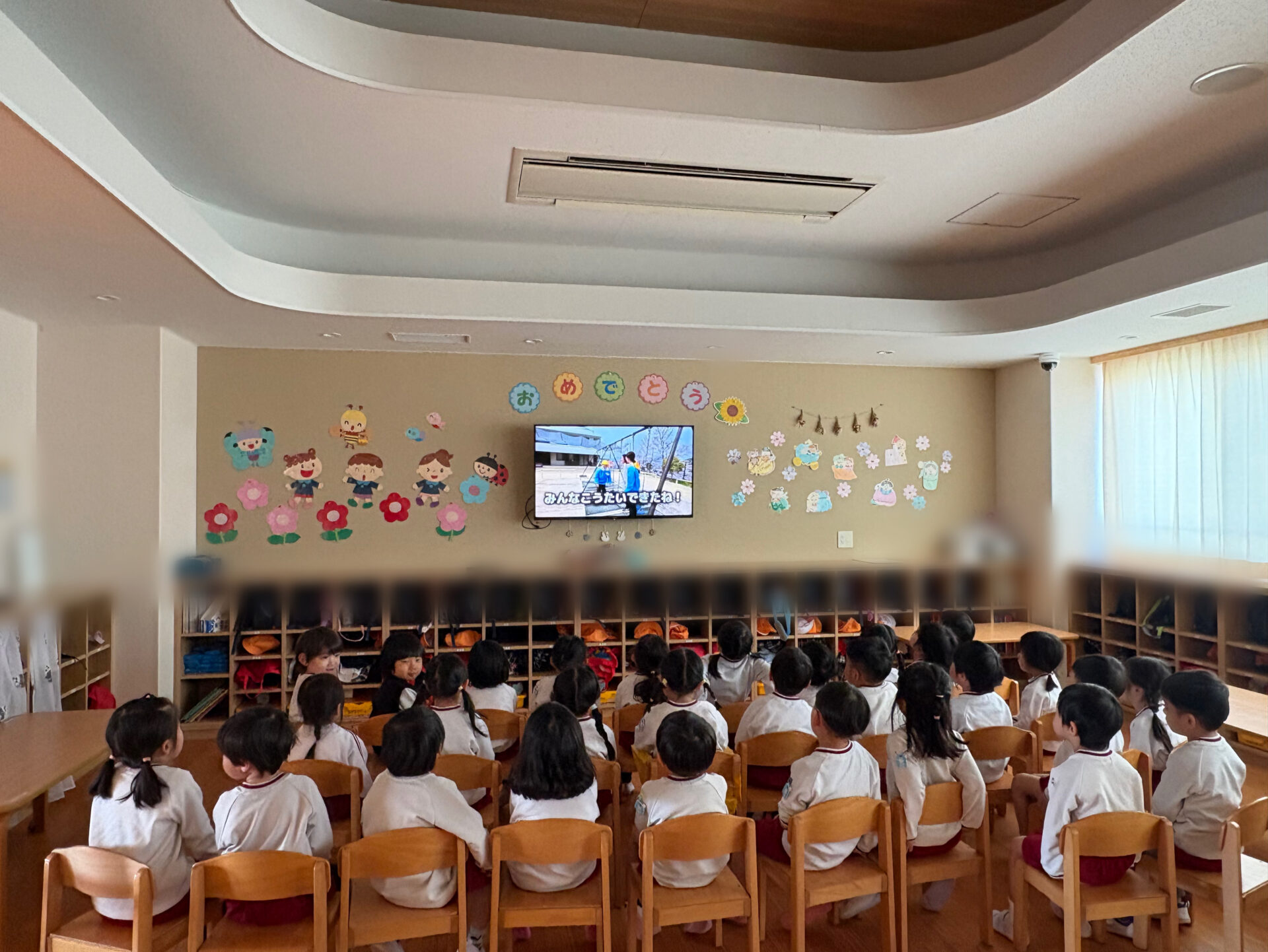 遊具の使い方や2階施設の使い方についてお話をしました。先生たちが登場する動画を見たり、実際にクイズをしたりしながら、「これはいいかな?」「これは危ないかな?」とみんなで考え、安全に遊ぶための約束を確認しました。