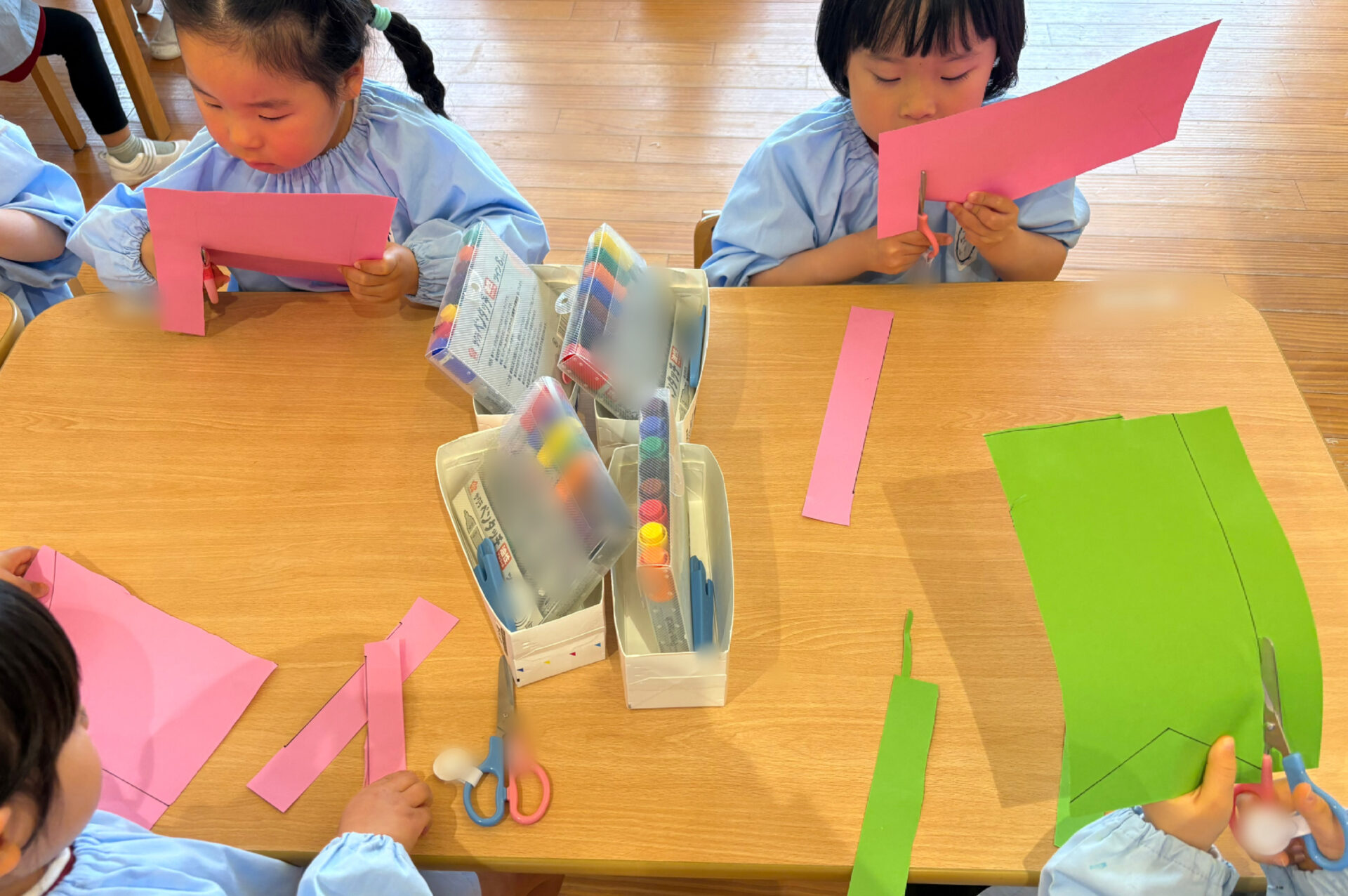 その後、保育室に戻って製作スタート。はさみでこいのぼりの胴体を切り、目やうろこはマジックで描きました。