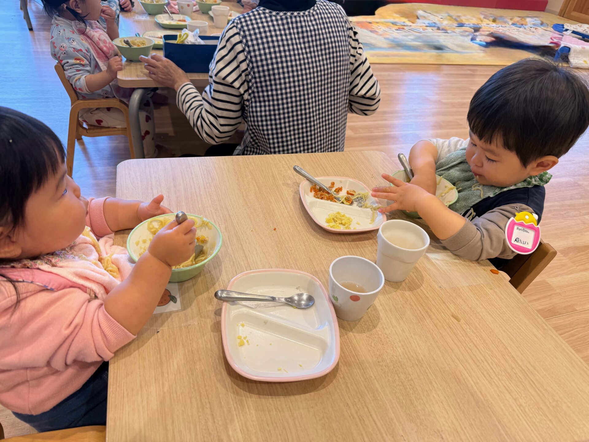 大きなお口を「あーん」と開けておいしそうに食べる姿がとてもかわいらしく「おいしいね」「モグモグしようね」とやさしく声をかけながら楽しい雰囲気の中で食事の時間を過ごしています。