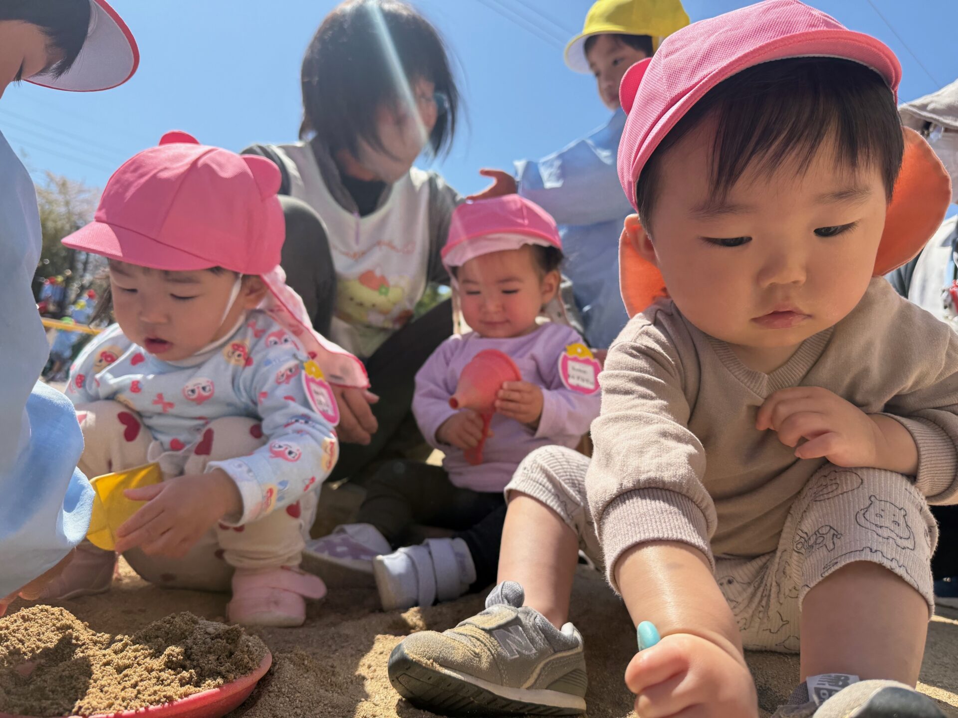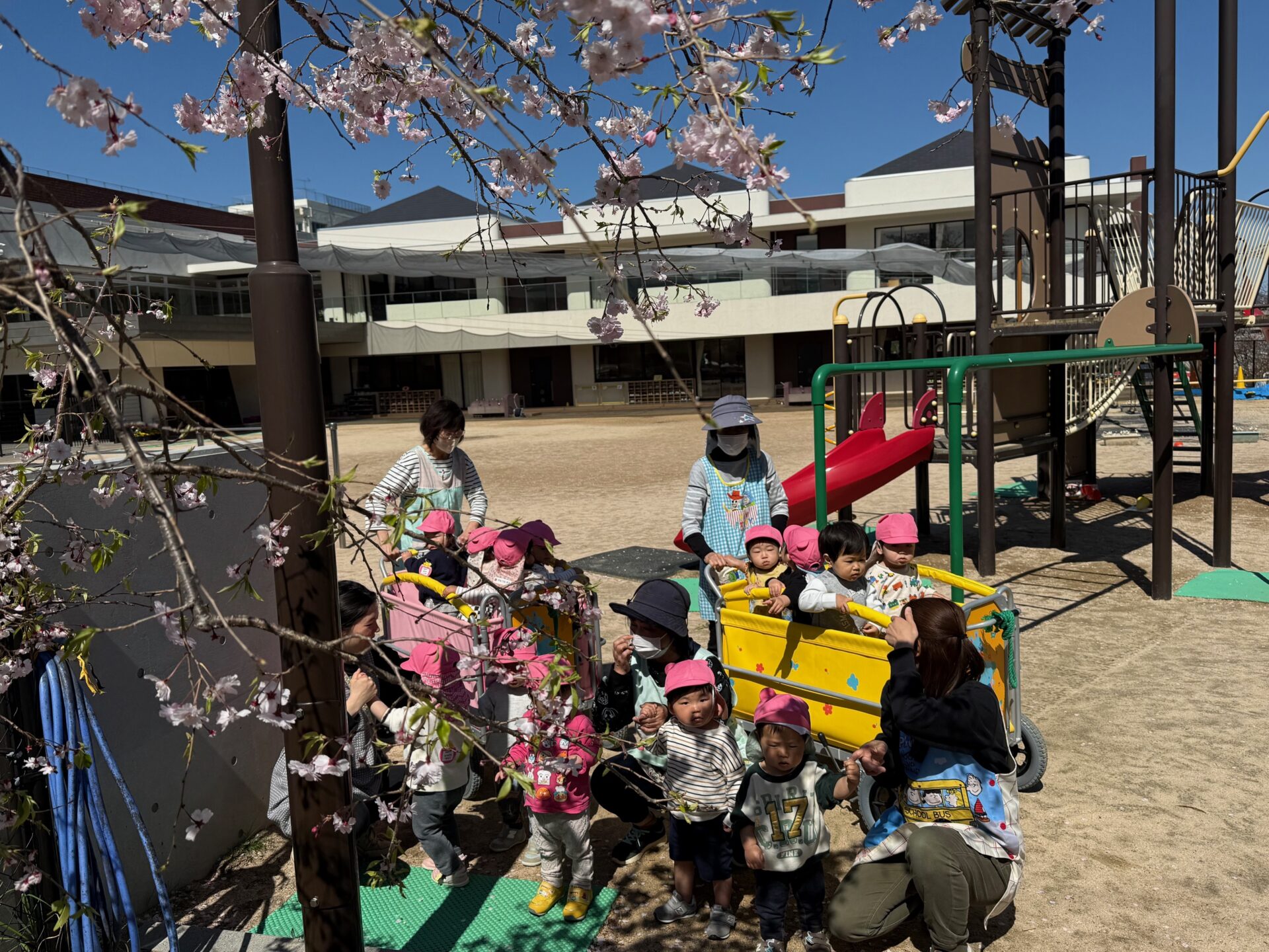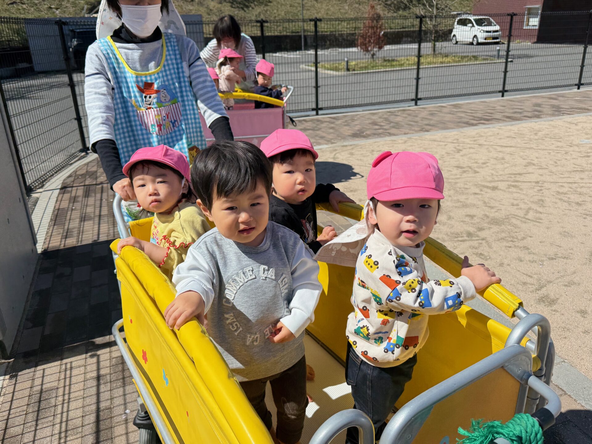 天気の良い日には戸外へ出て春のあたたかな陽気を感じながらお散歩を楽しんでいます。お散歩カートに揺られて気持ちよさそうに過ごしたり、トコトコと自分の足で歩いたりとそれぞれのペースで春の自然に触れています。