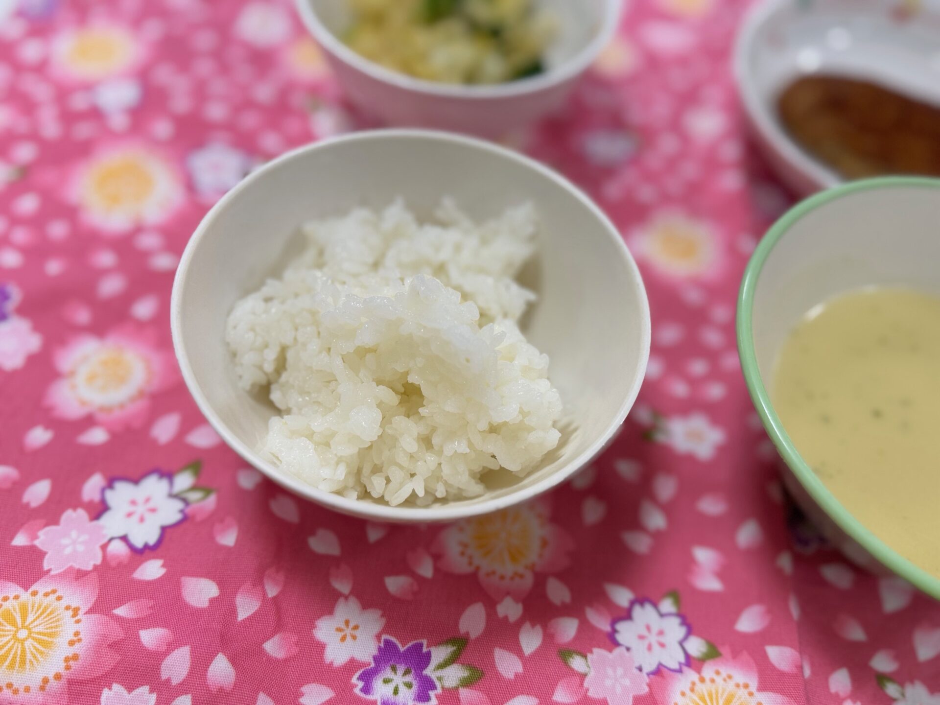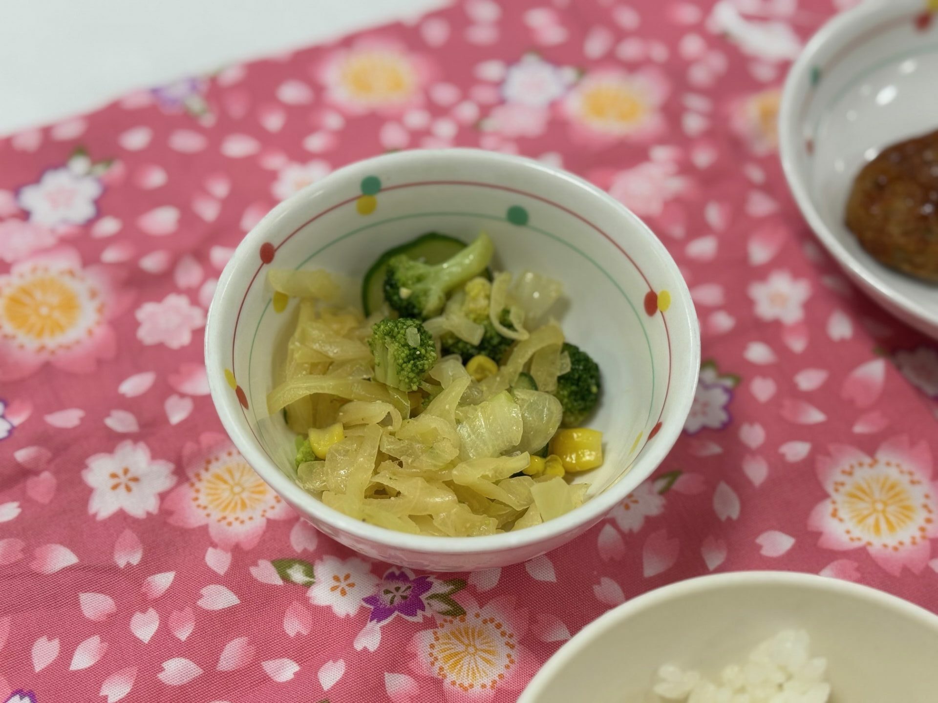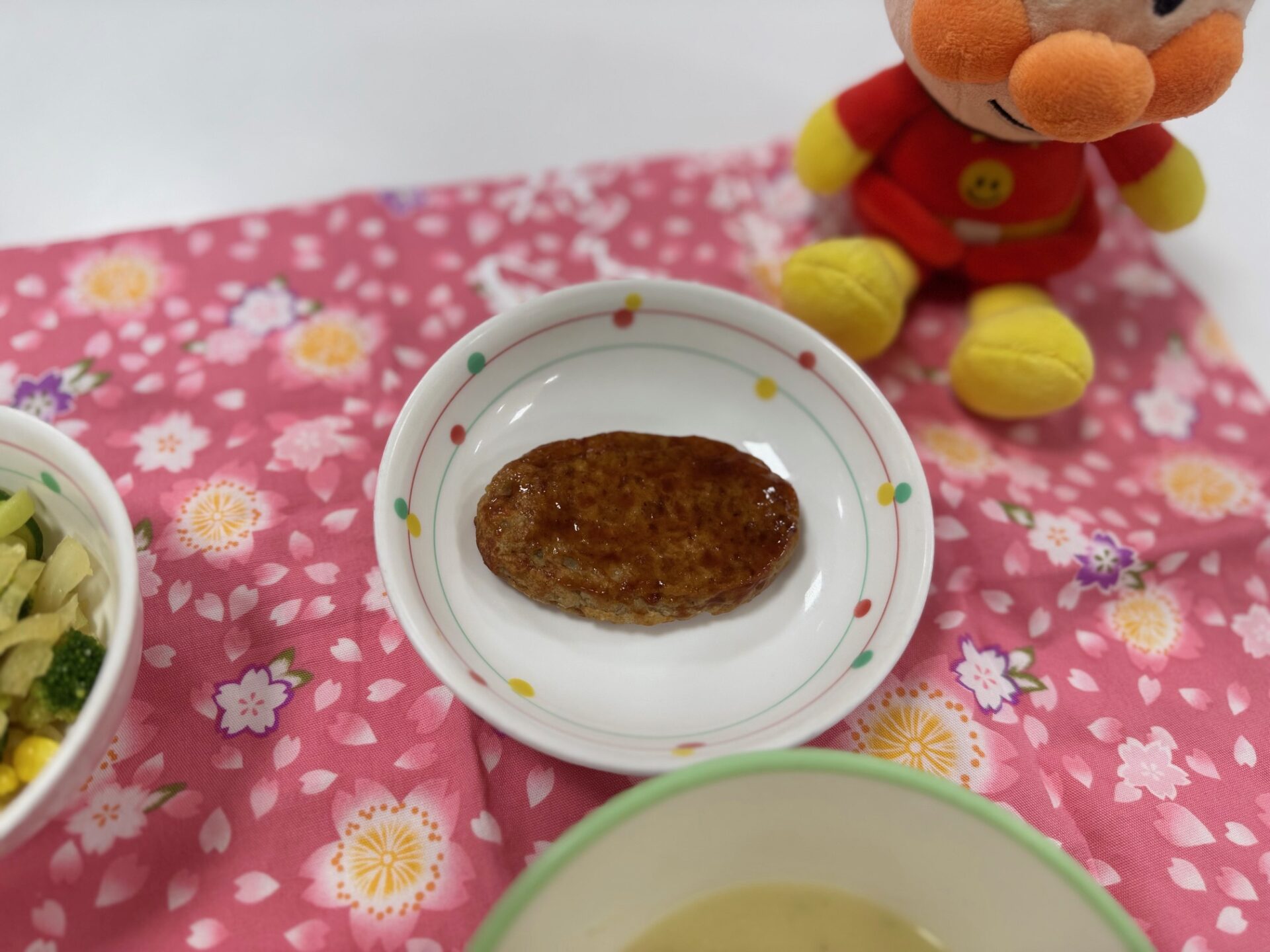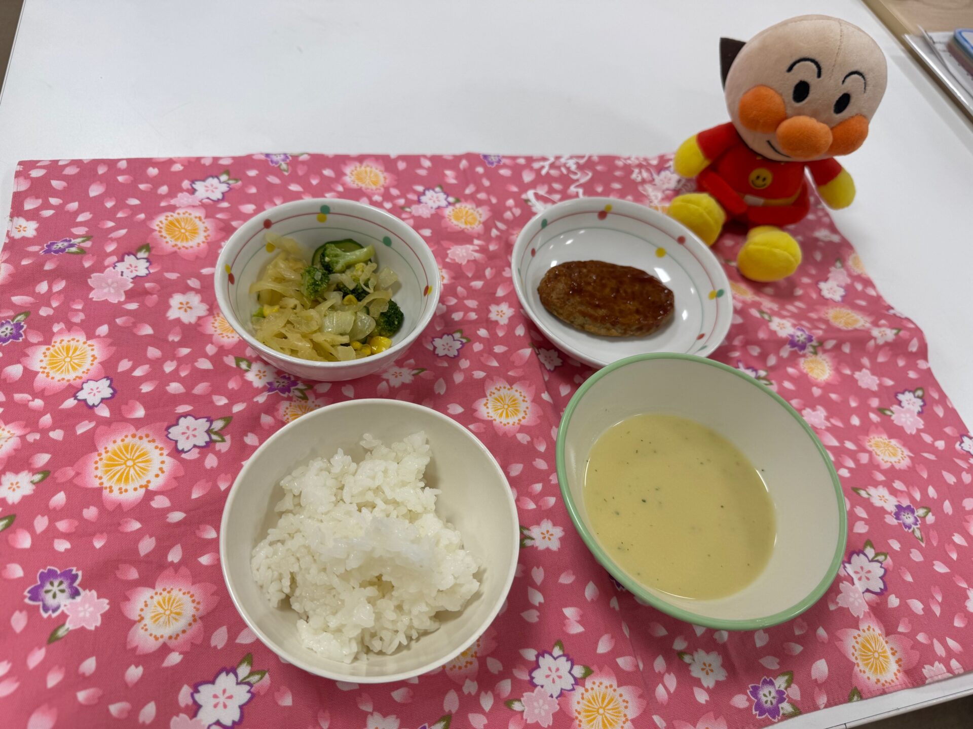 ご飯に良く合う、ハンバーグと豆乳コーンポタージュスープでとても美味しかったです。食べる煮干しでカルシウムアップしました。