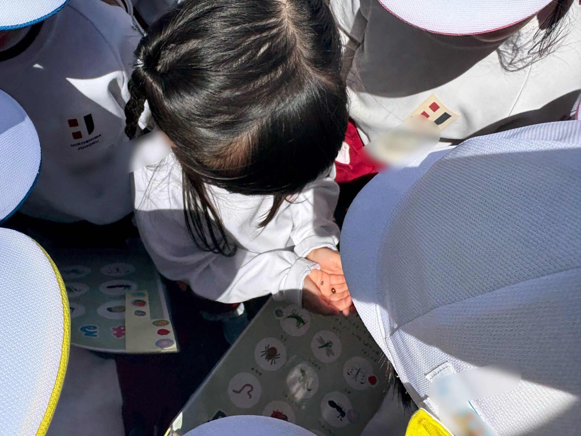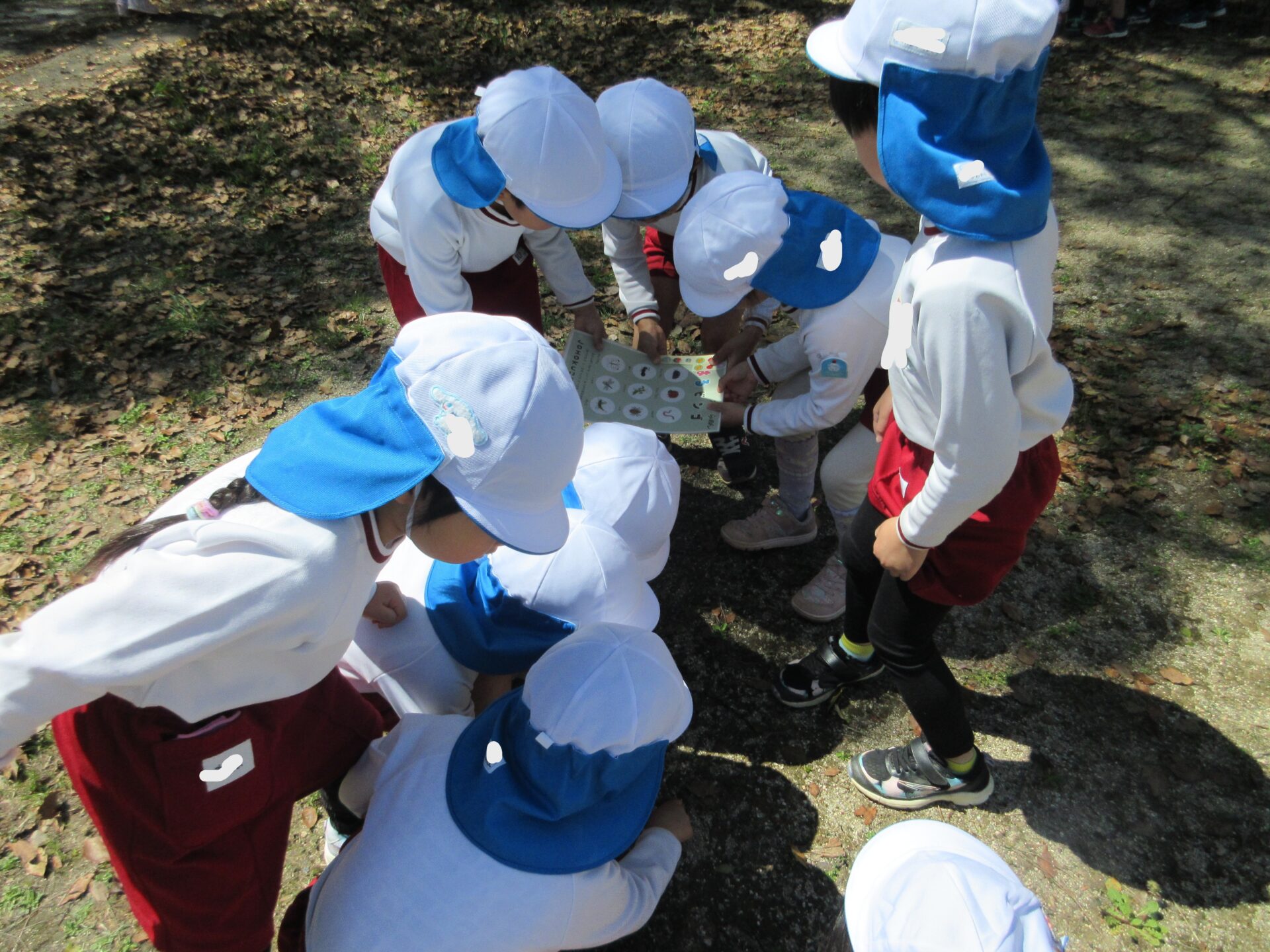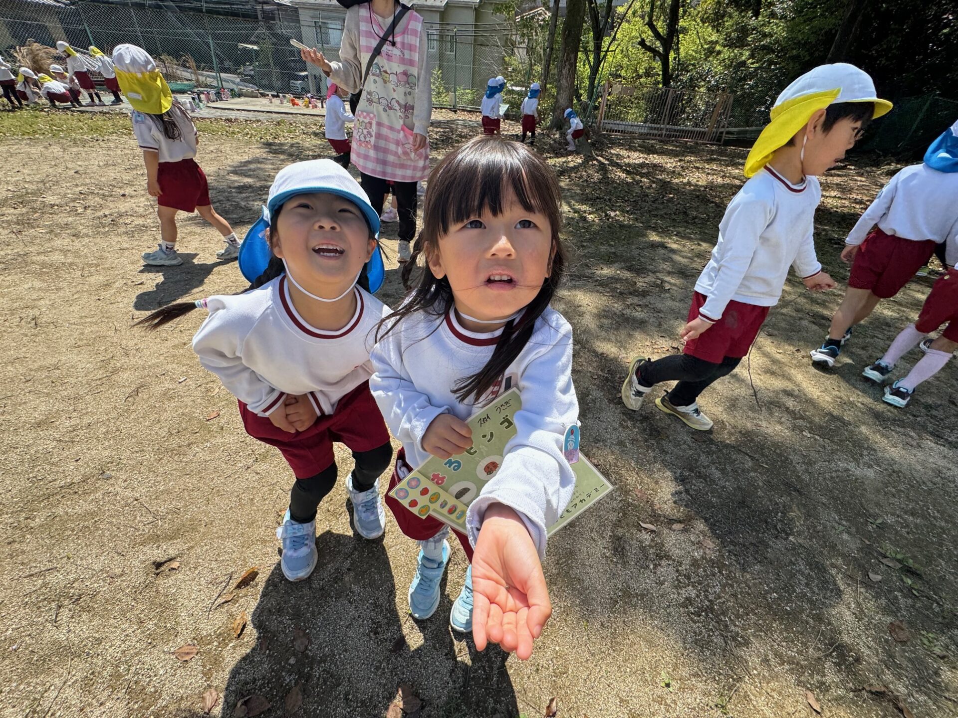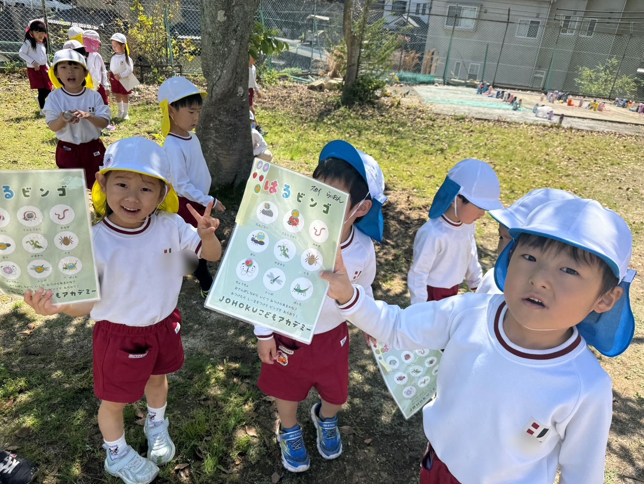 それぞれ3~4人のグループに分かれ、ビンゴに描かれた春の生き物や植物を探します🔍「ダンゴムシ見つけたよ!」「これ芋虫じゃない?!」「あっちにてんとう虫がいるかも!」と友達と協力しながら第二園庭を駆け回り、春見つけに夢中な園児たち🎵