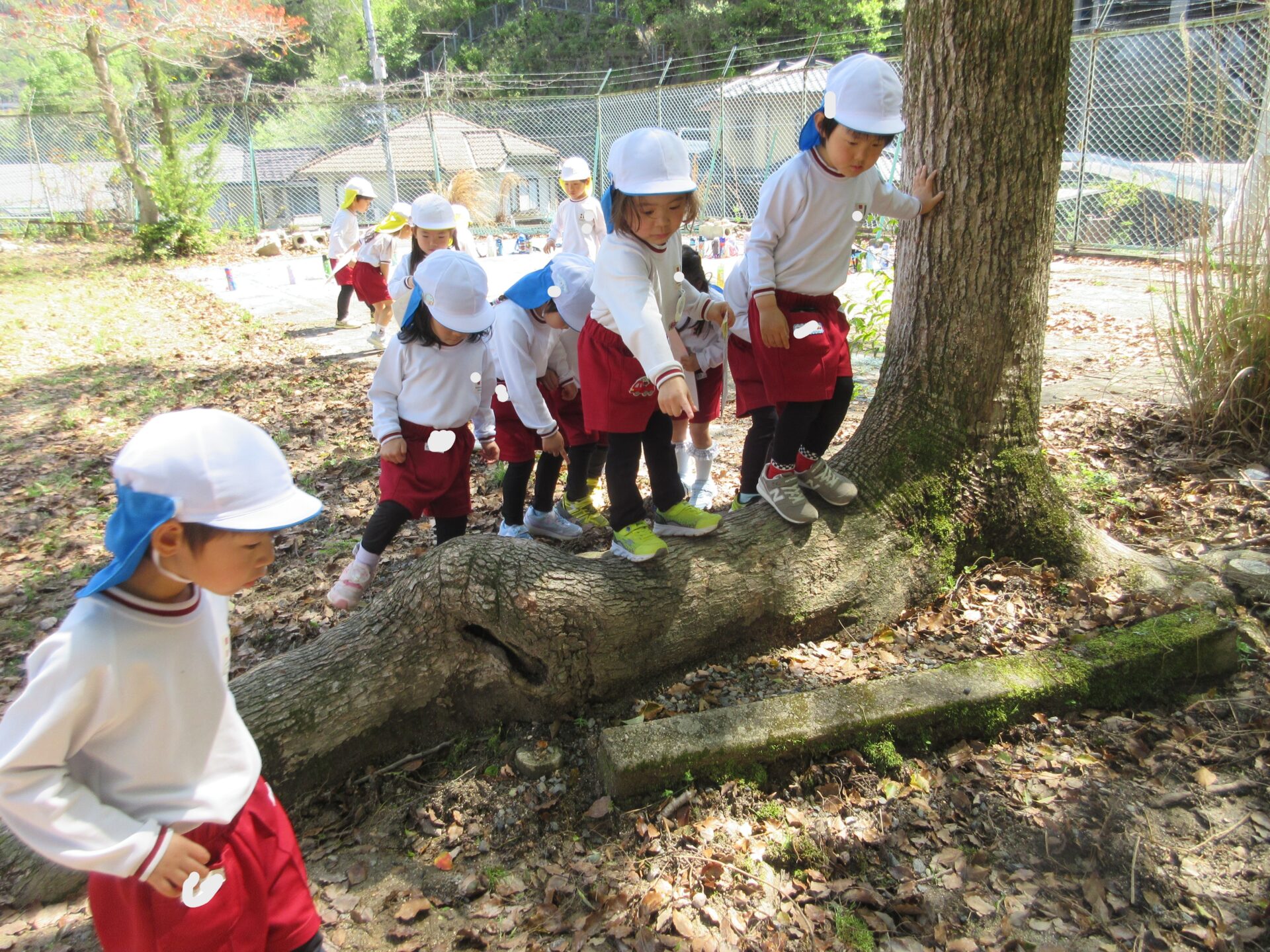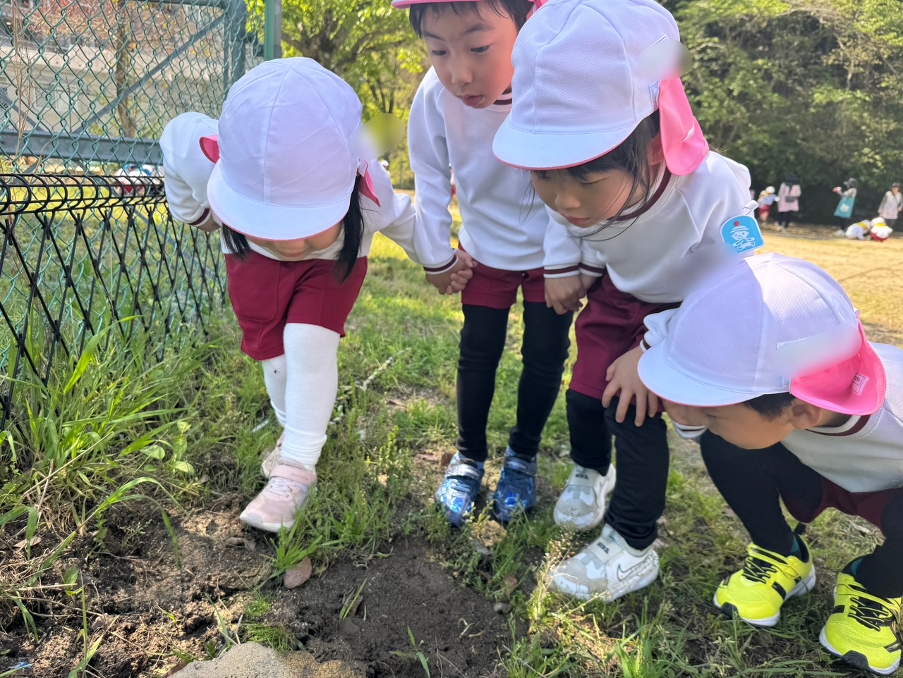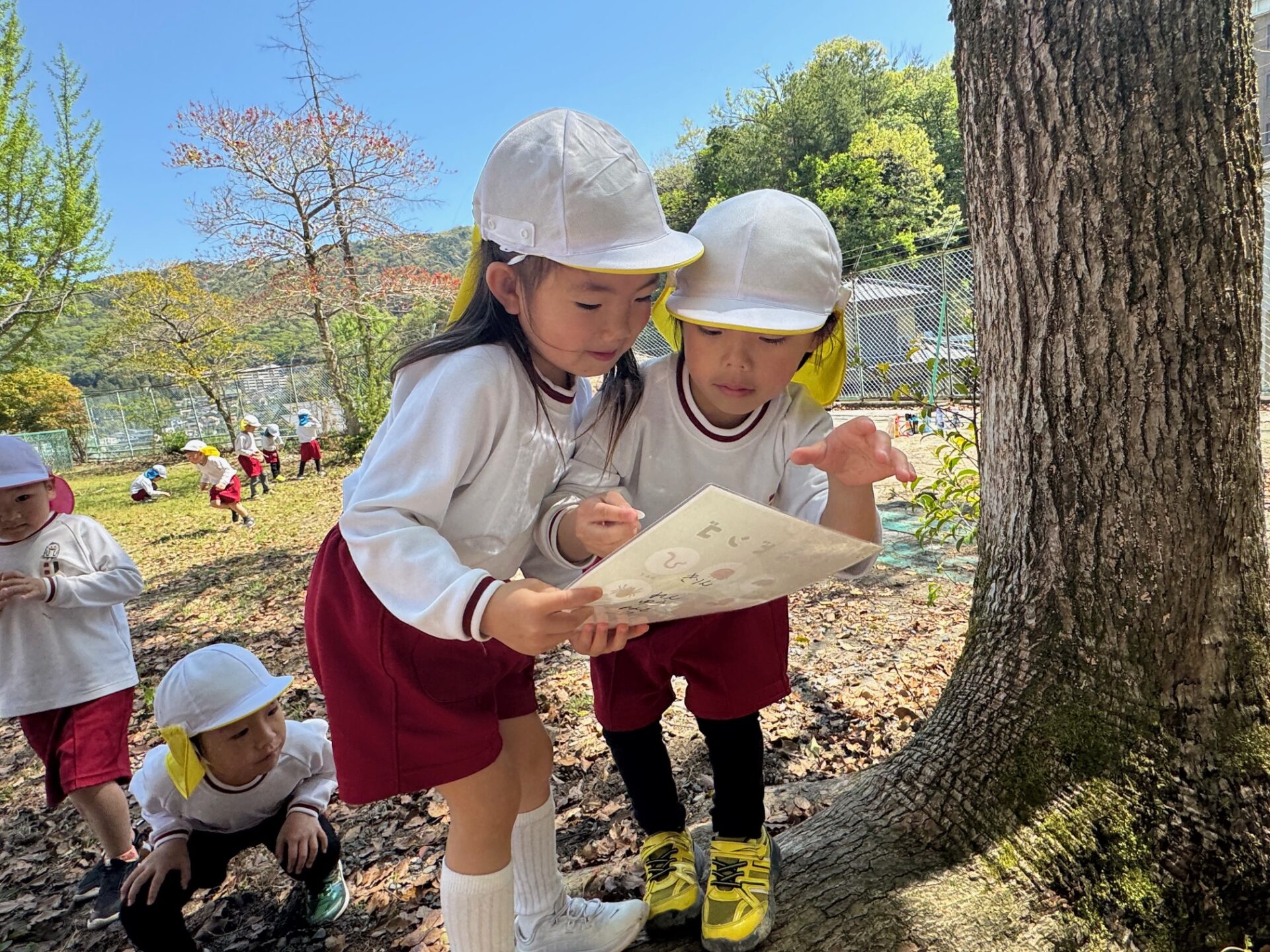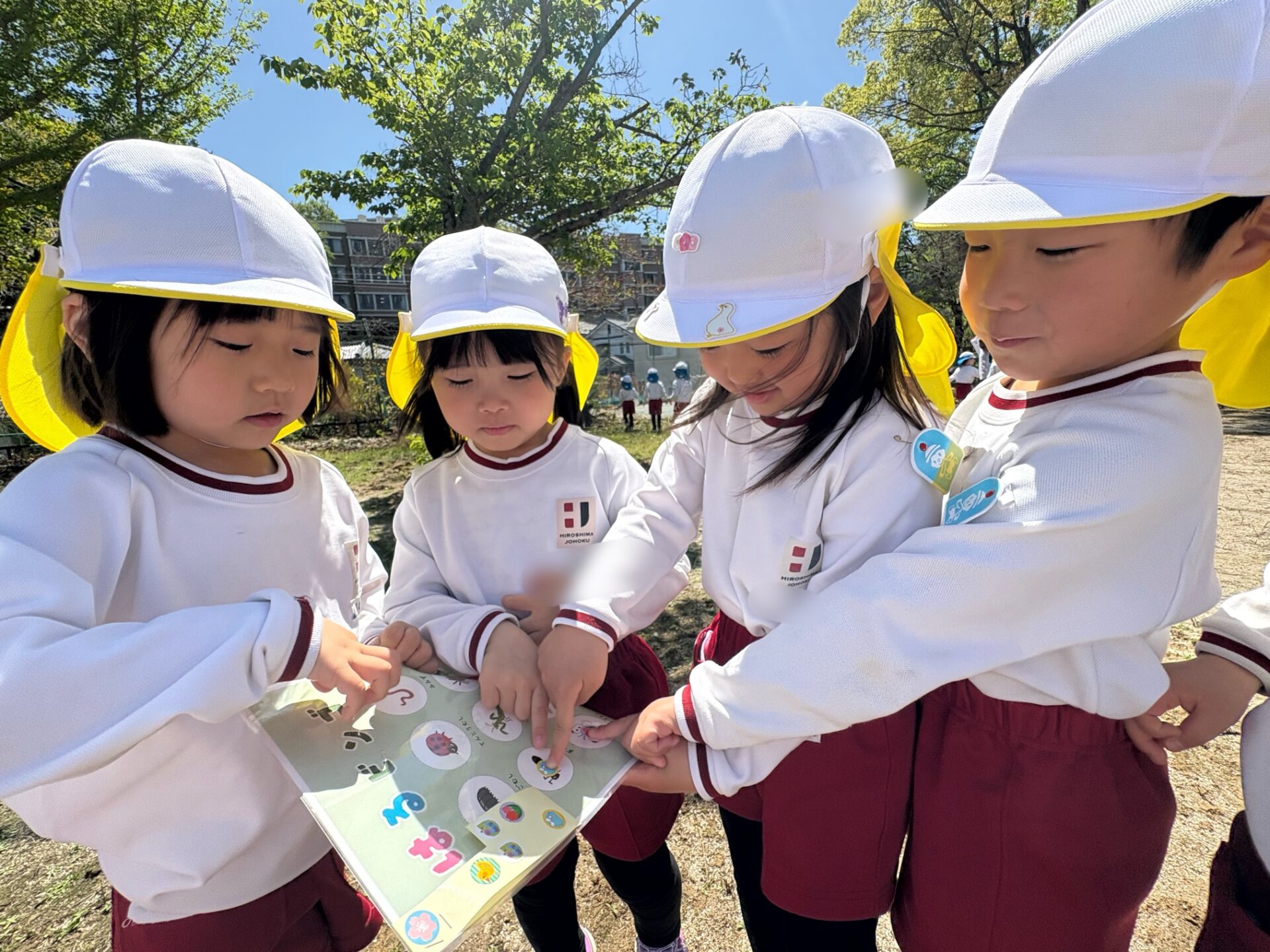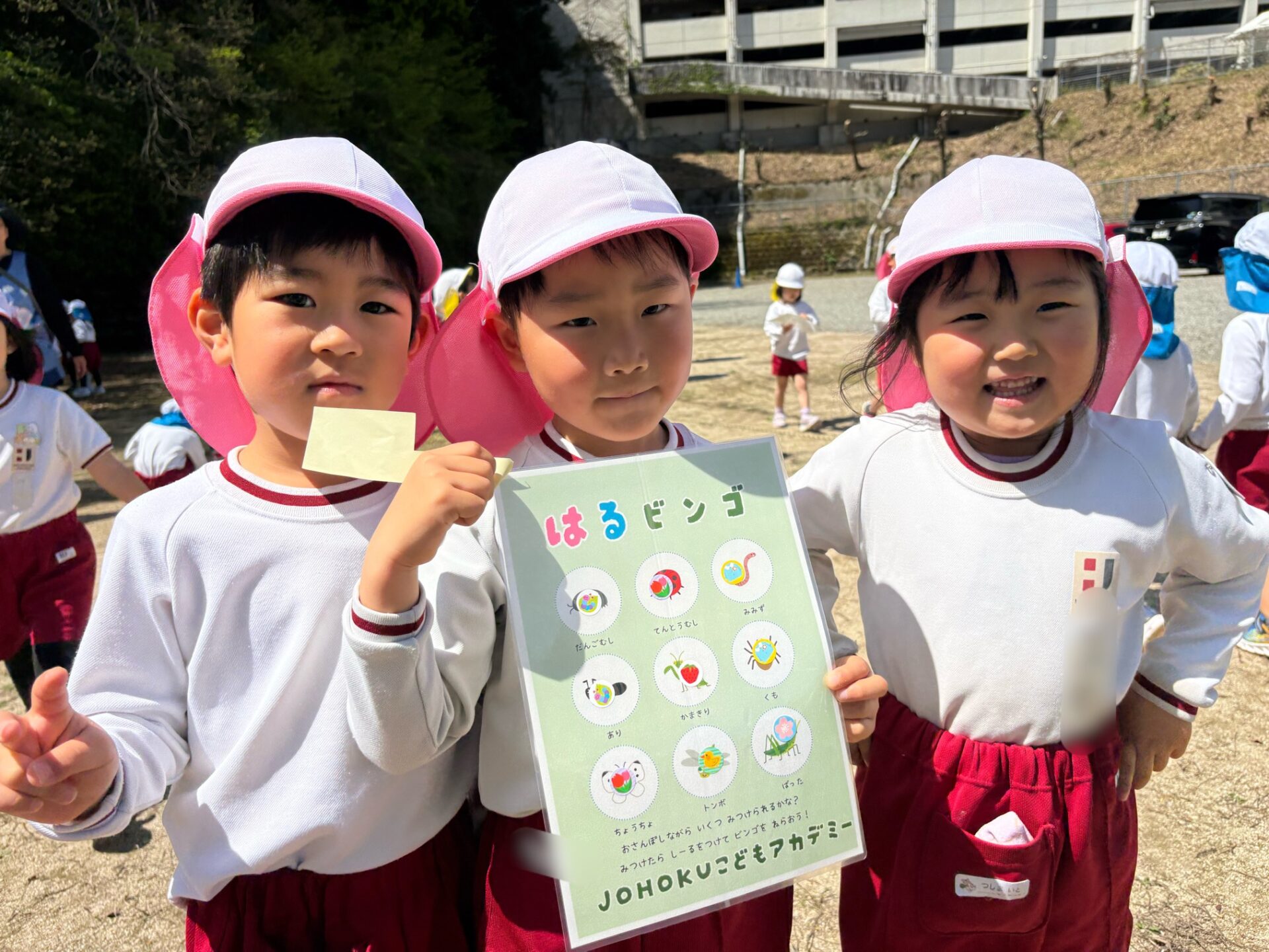 それぞれ3~4人のグループに分かれ、ビンゴに描かれた春の生き物や植物を探します🔍「ダンゴムシ見つけたよ!」「これ芋虫じゃない?!」「あっちにてんとう虫がいるかも!」と友達と協力しながら第二園庭を駆け回り、春見つけに夢中な園児たち🎵