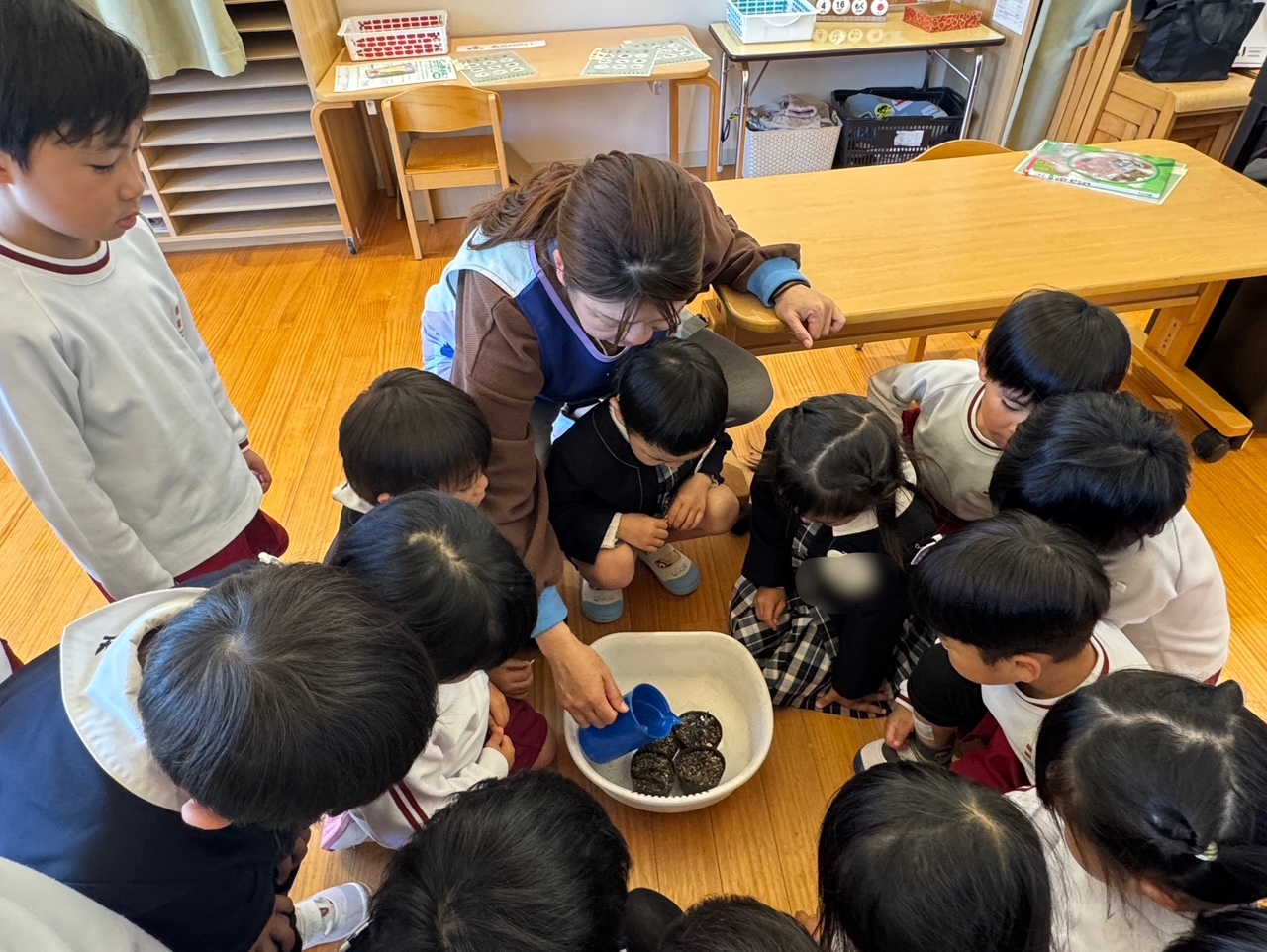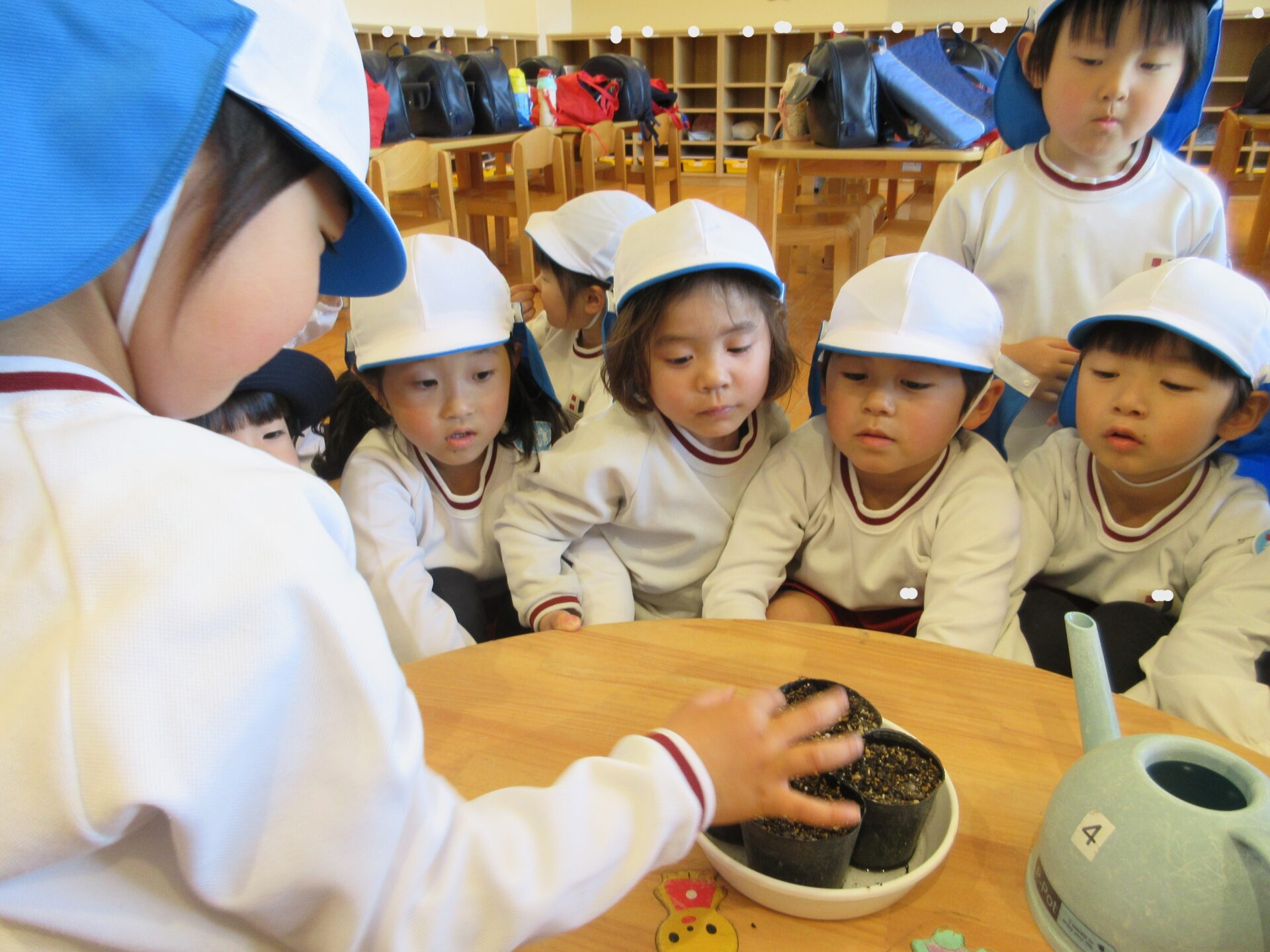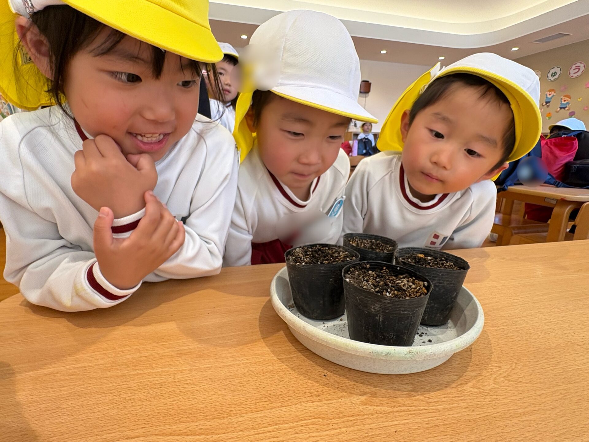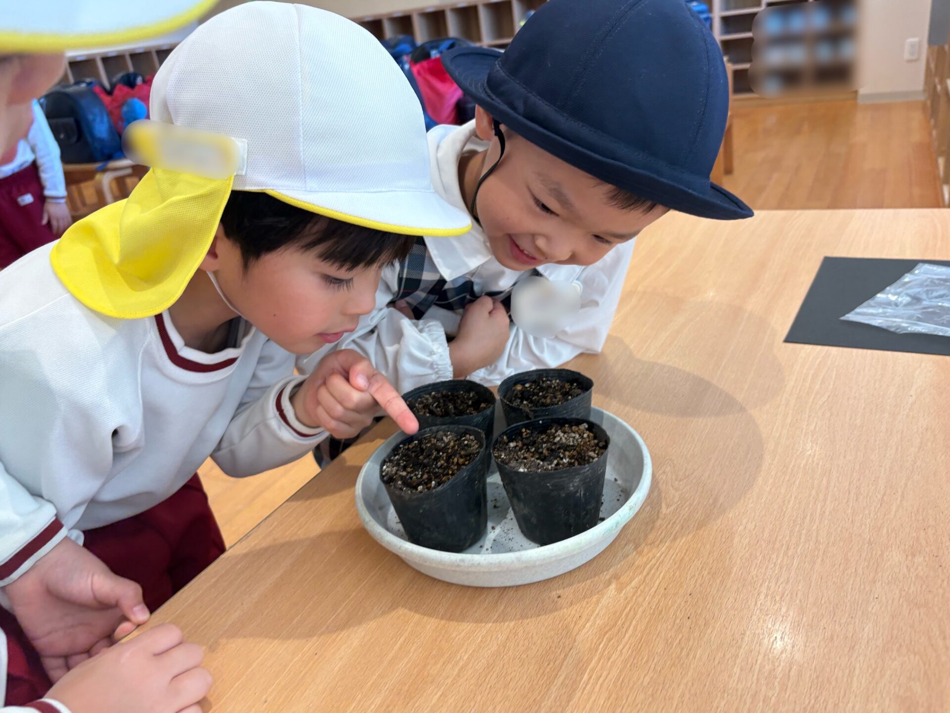 園に帰り、もらった種を土に植えた年長組さん。「一体何ができるんだろう?」と興味津々な様子でした♪