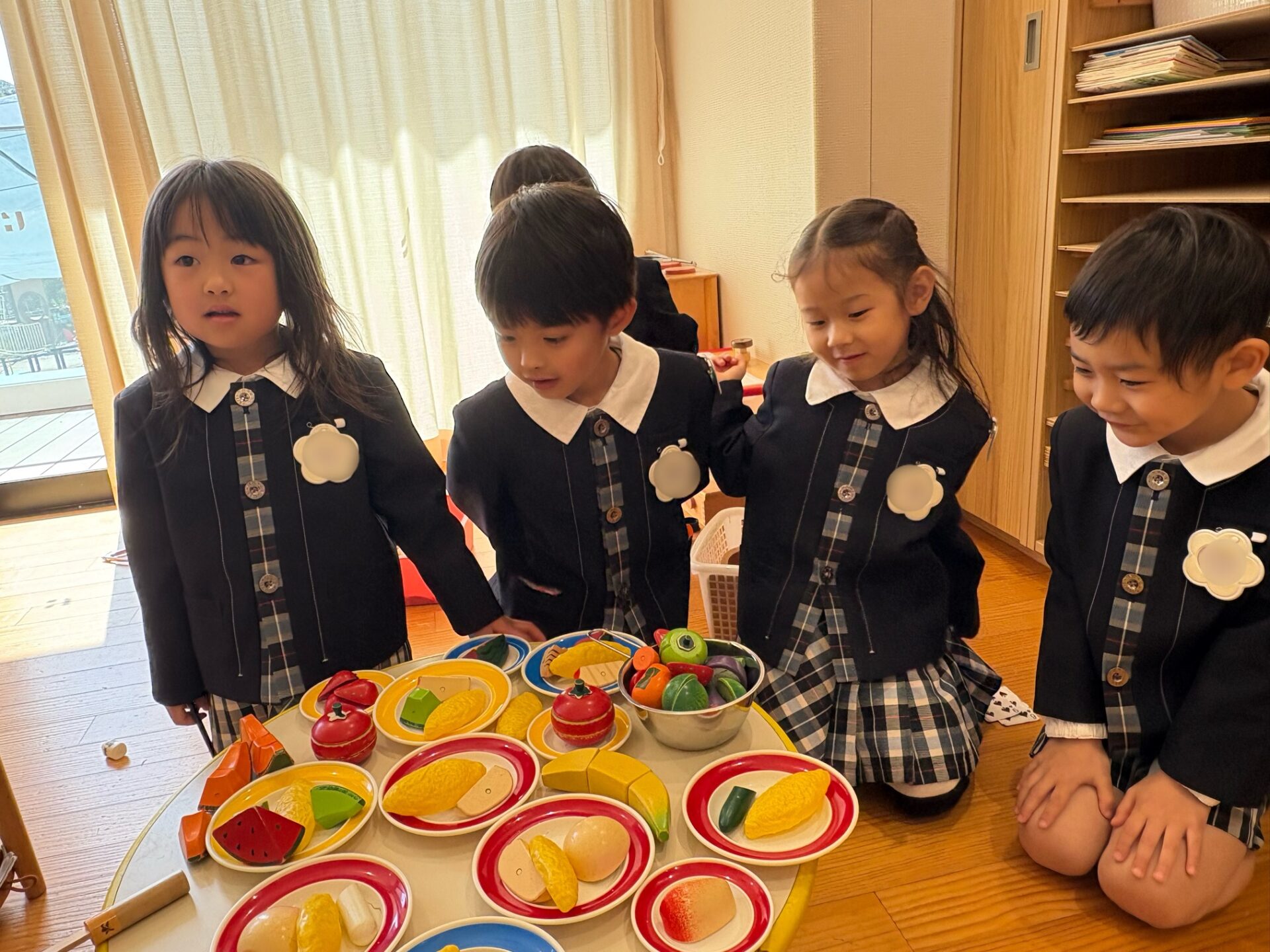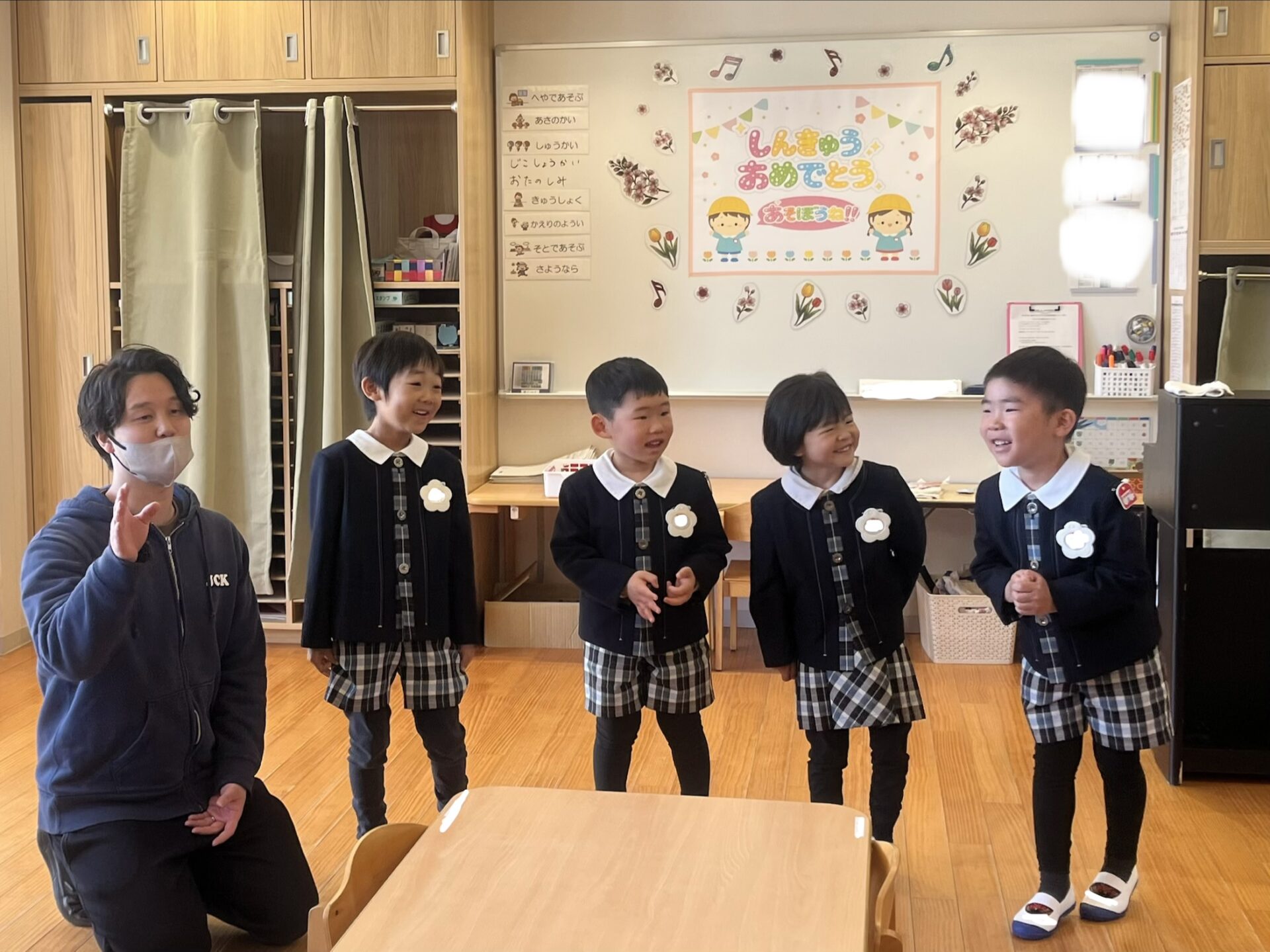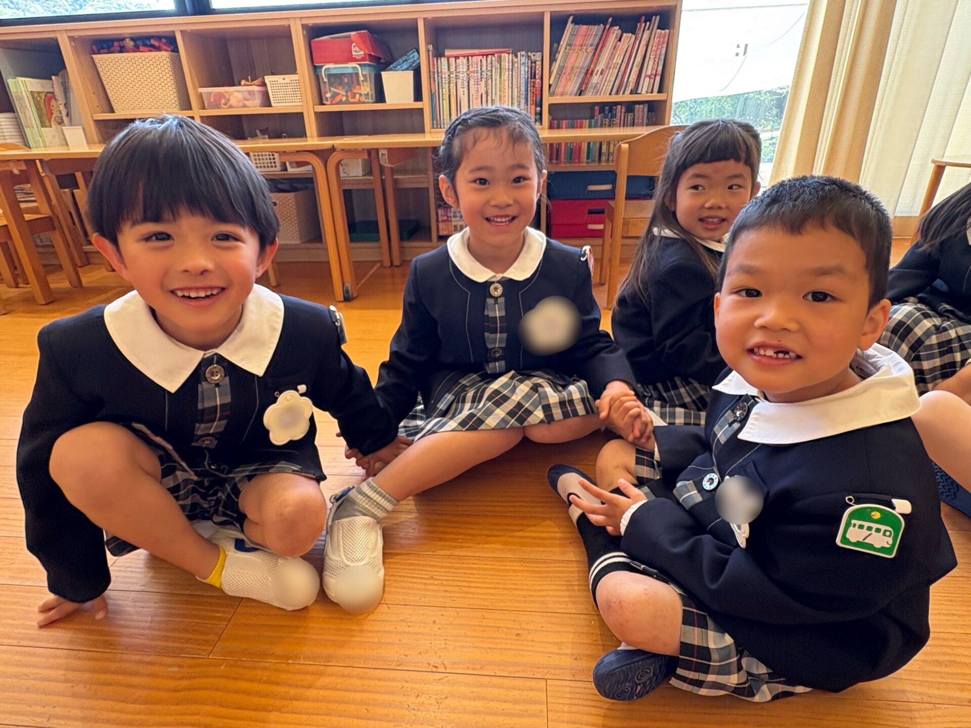 いよいよ新学期が始まりました!少しドキドキしていた園児も、友達の顔を見ると緊張がほぐれ、笑顔が見られました☺️担任の先生から新しい名札を付けてもらい、誇らしげな年長組さん✨