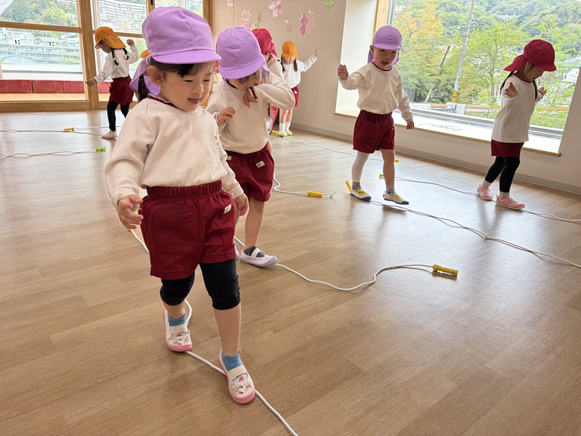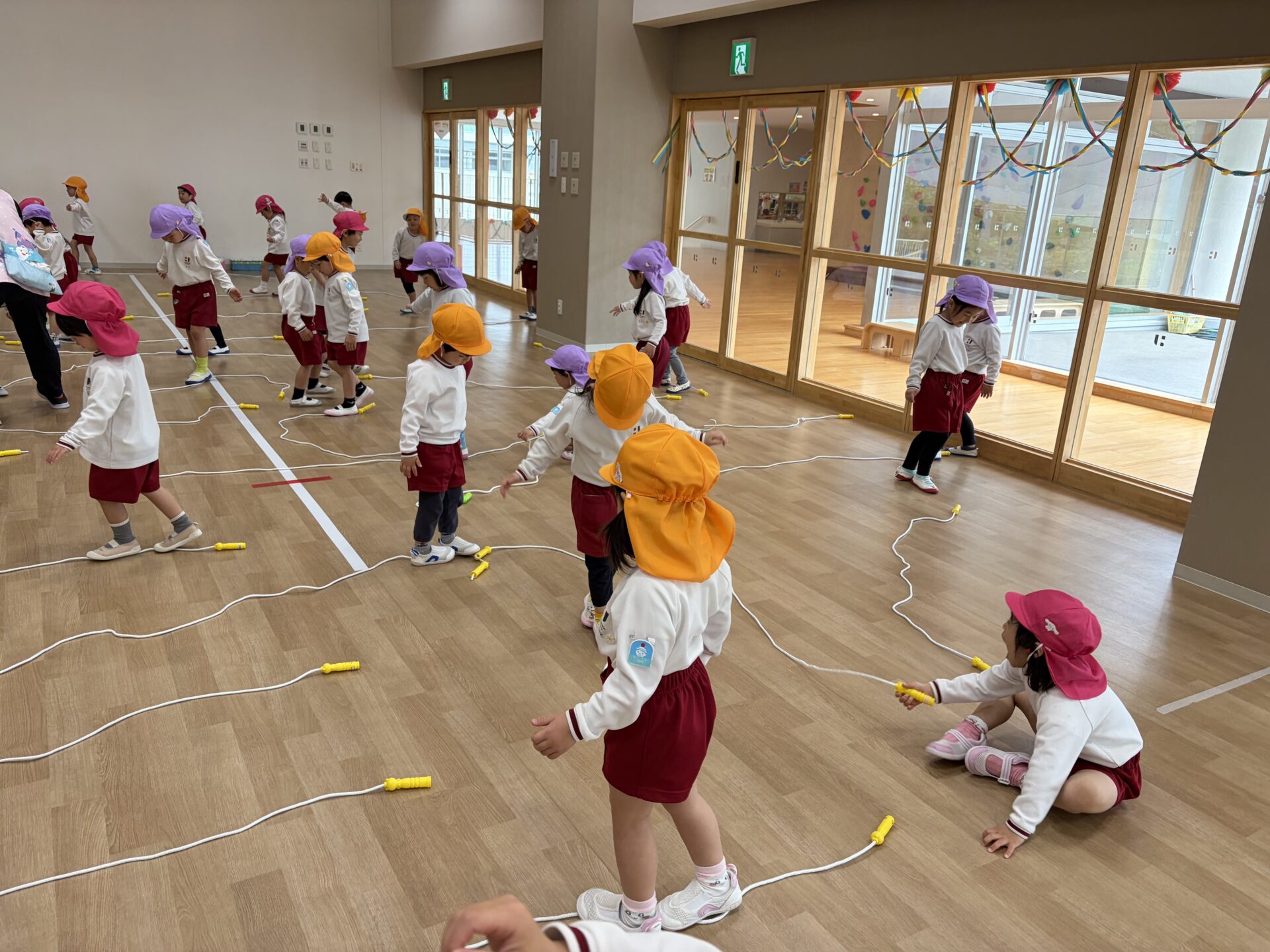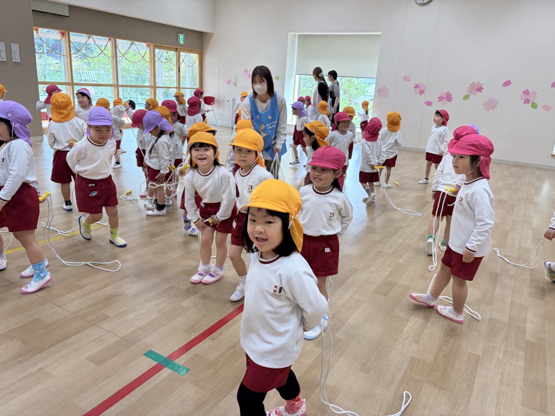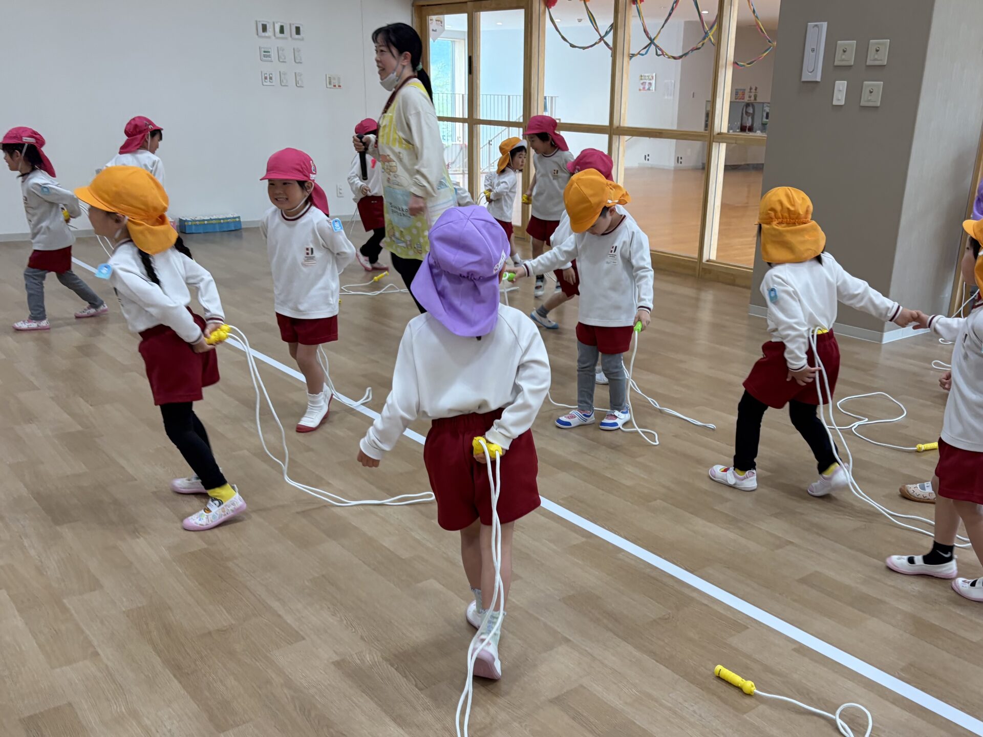縄跳びの活動がスタートしました。初日は、すぐに跳ぶのではなく、まずは縄に親しむことから始めました✨結び目をほどく時からドキドキな園児たち😊
