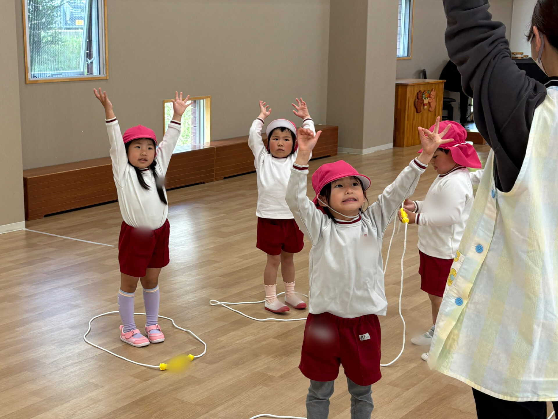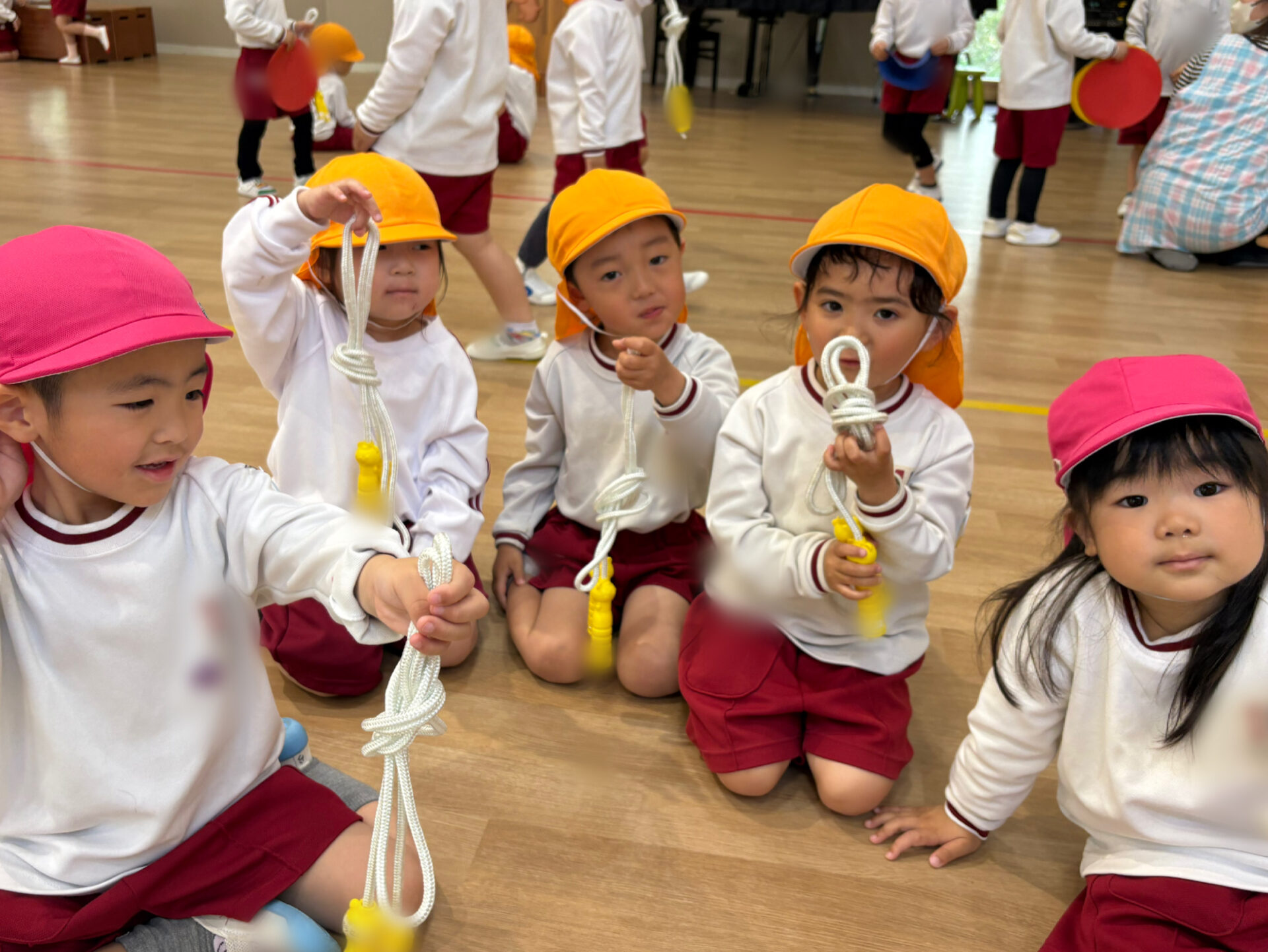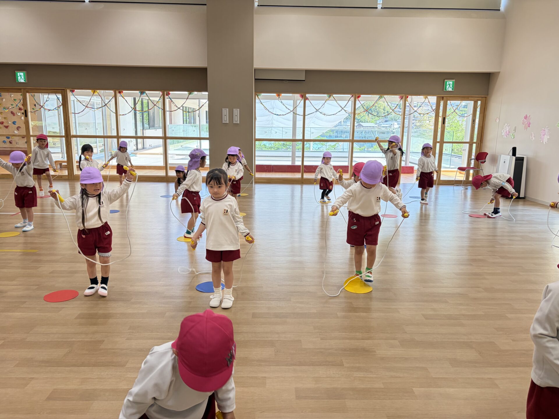 縄跳びの活動がスタートしました。初日は、すぐに跳ぶのではなく、まずは縄に親しむことから始めました✨結び目をほどく時からドキドキな園児たち😊