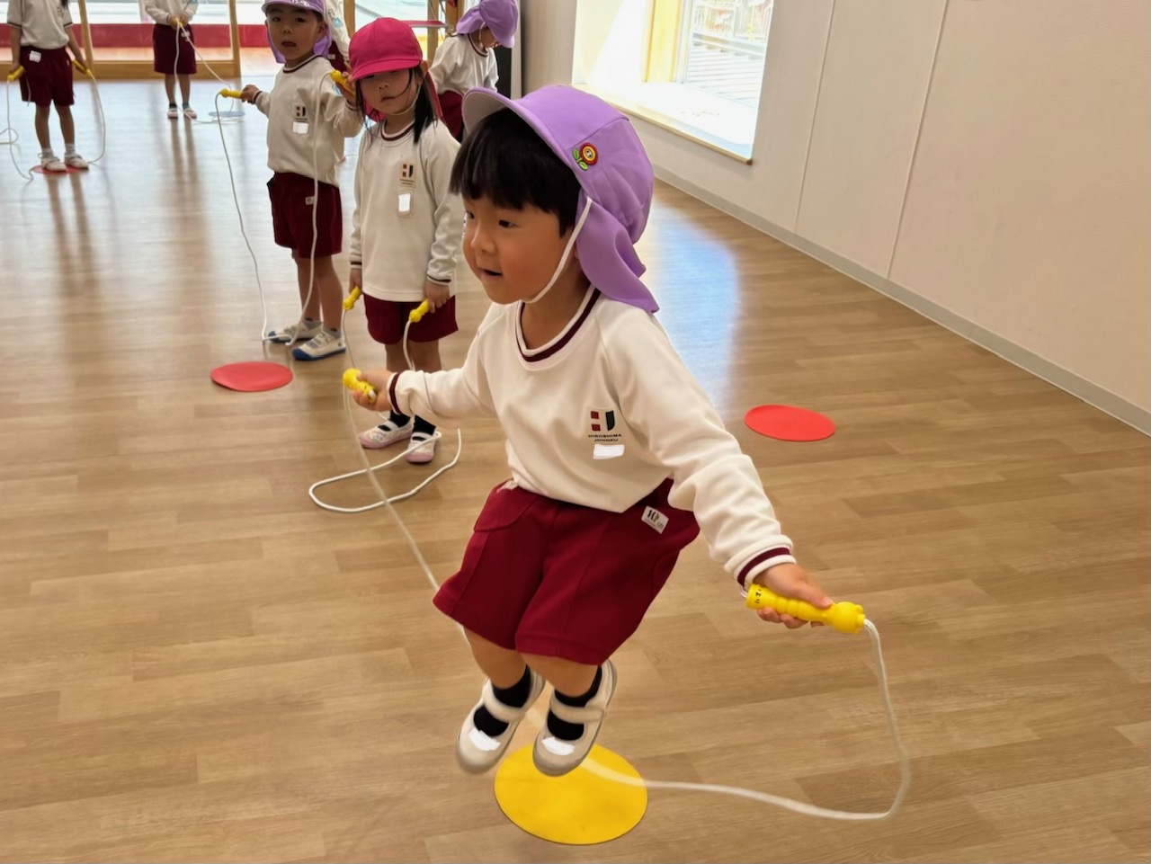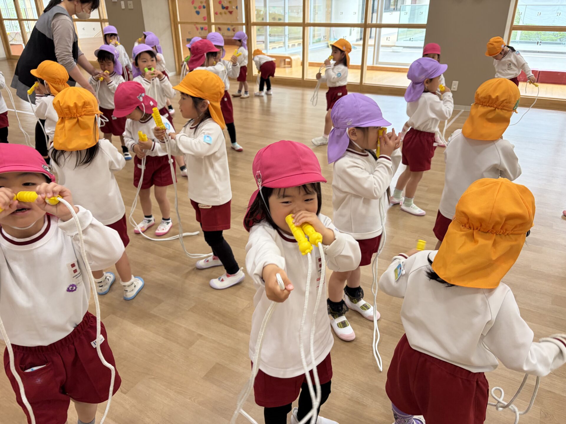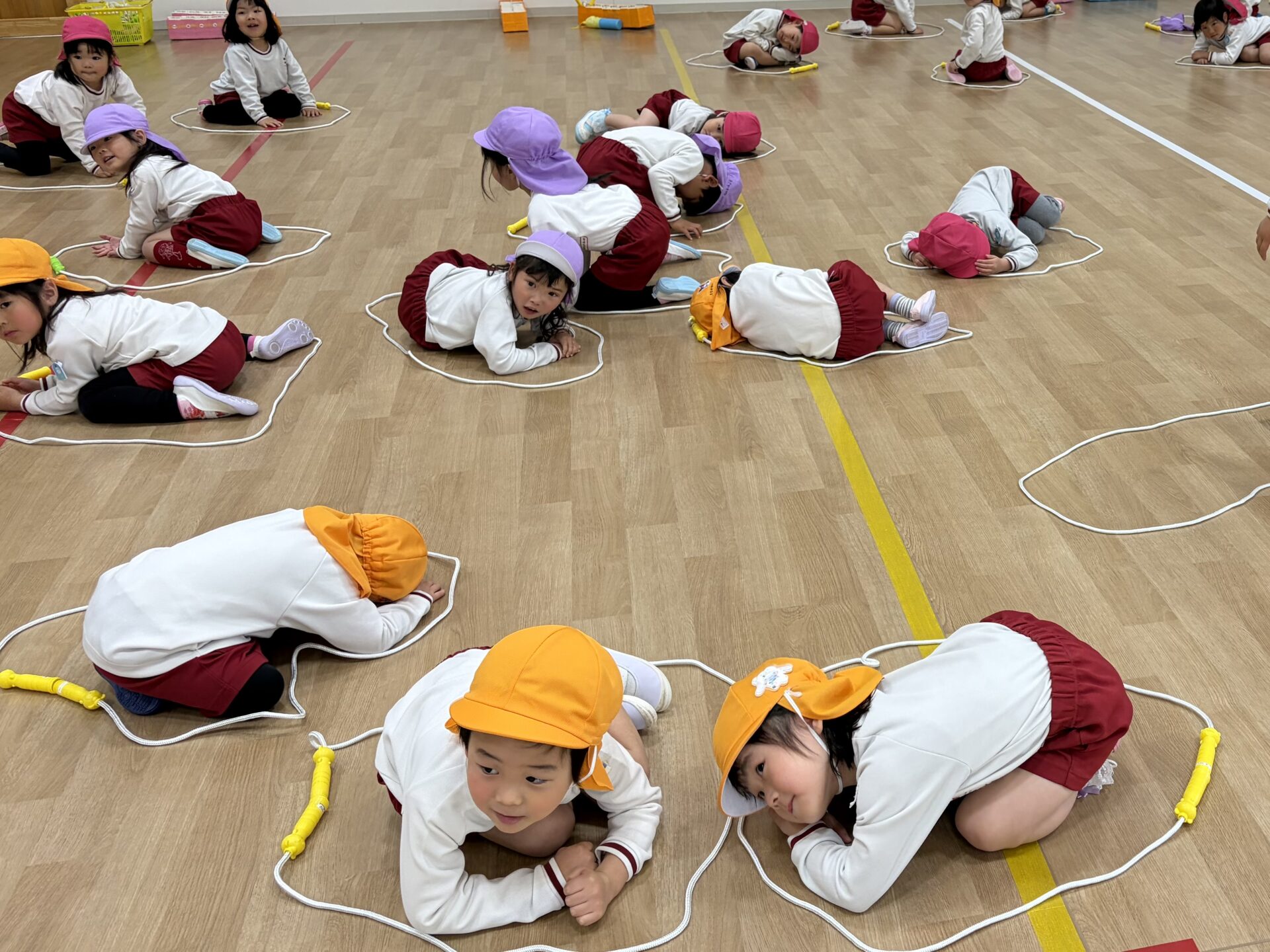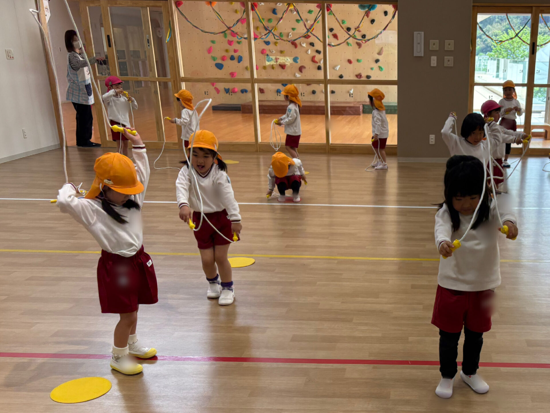 縄跳びの活動がスタートしました。初日は、すぐに跳ぶのではなく、まずは縄に親しむことから始めました✨結び目をほどく時からドキドキな園児たち😊