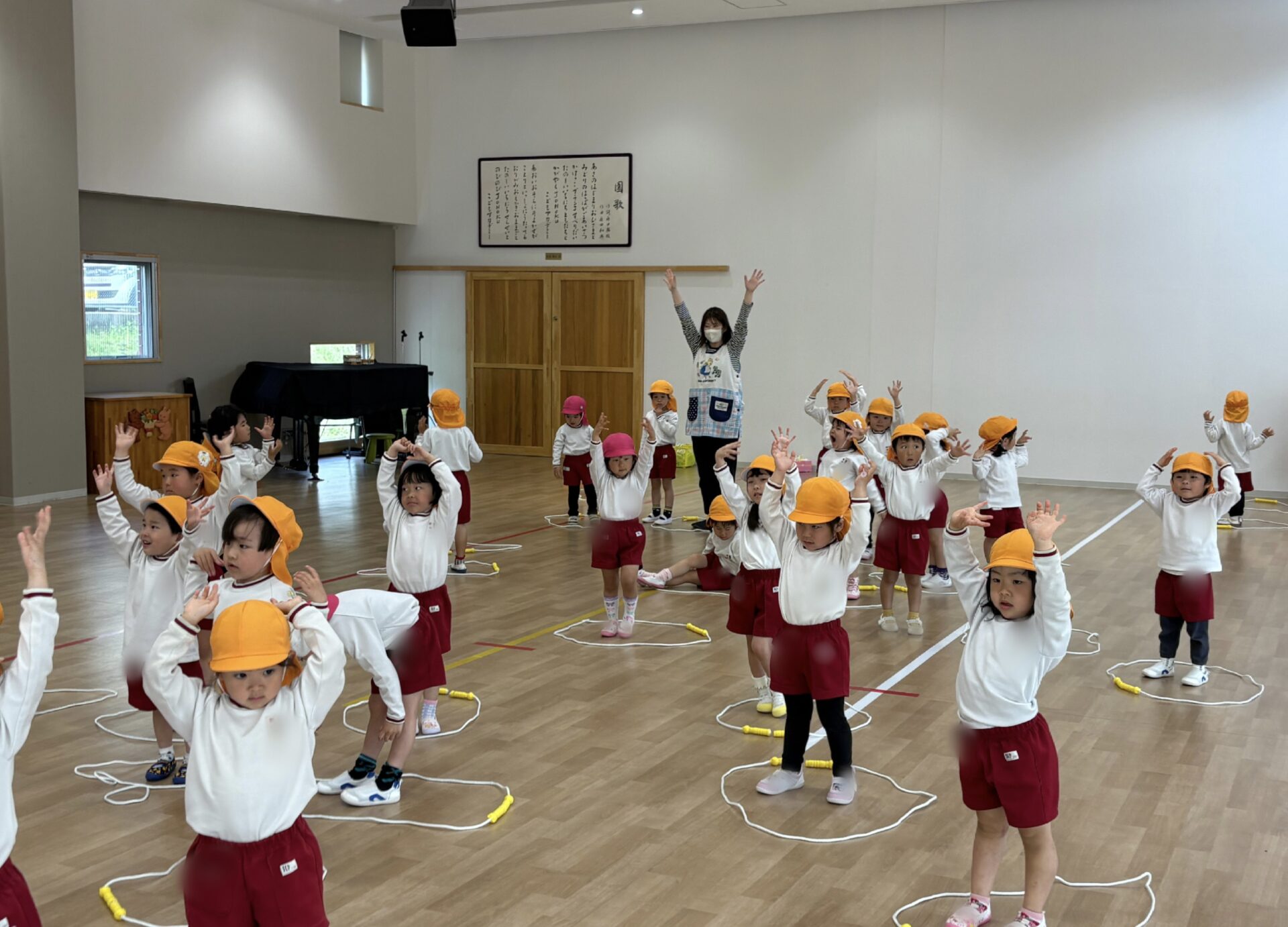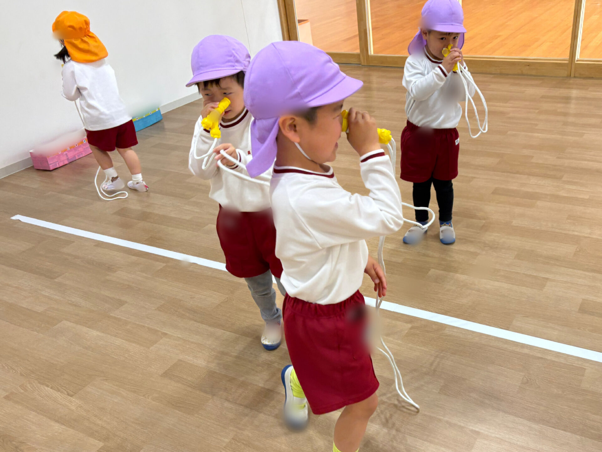 また、ピアノの音に合わせて縄を使い、動物に変身したり、道や橋、お家を作ったりと、さまざまな「縄あそび」を楽しみました🎵縄がいろいろなものに変身していく中で、「縄遊びって楽しい!」、「こんな使い方もできるんだ!」という発見や喜びがうまれ、園児たちの笑い声がたくさん聞かれました。