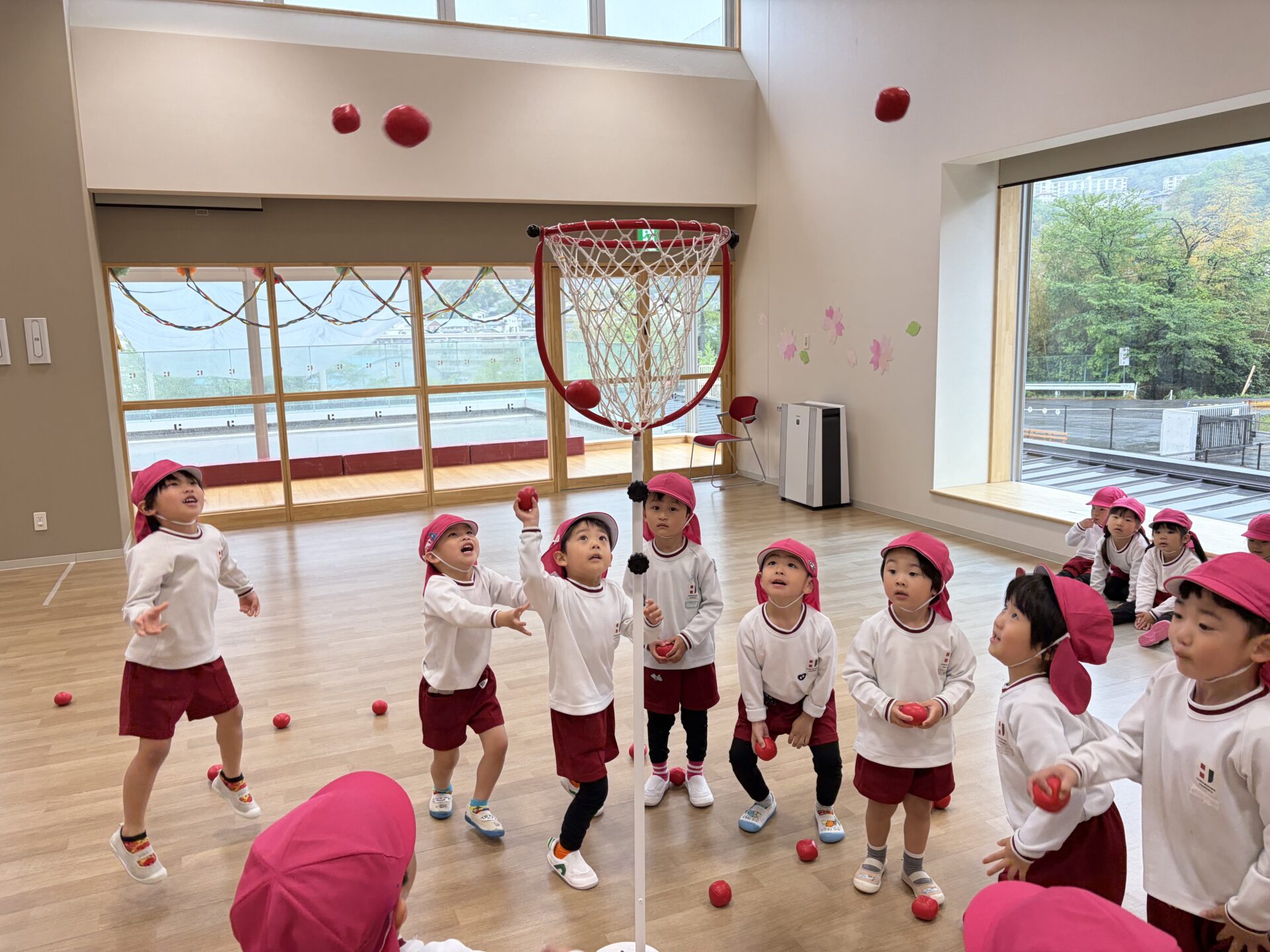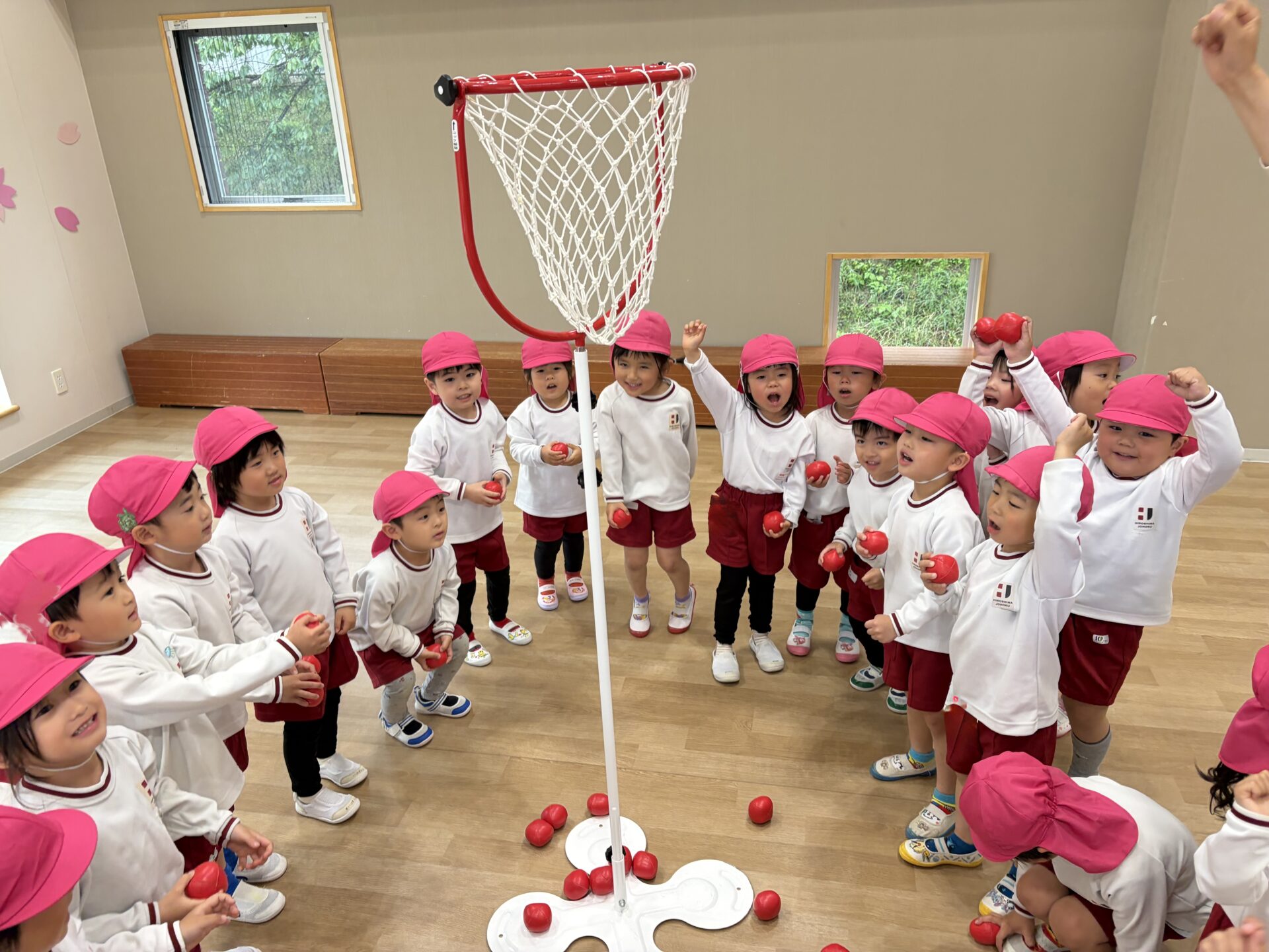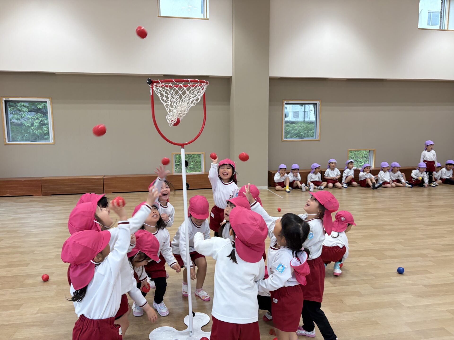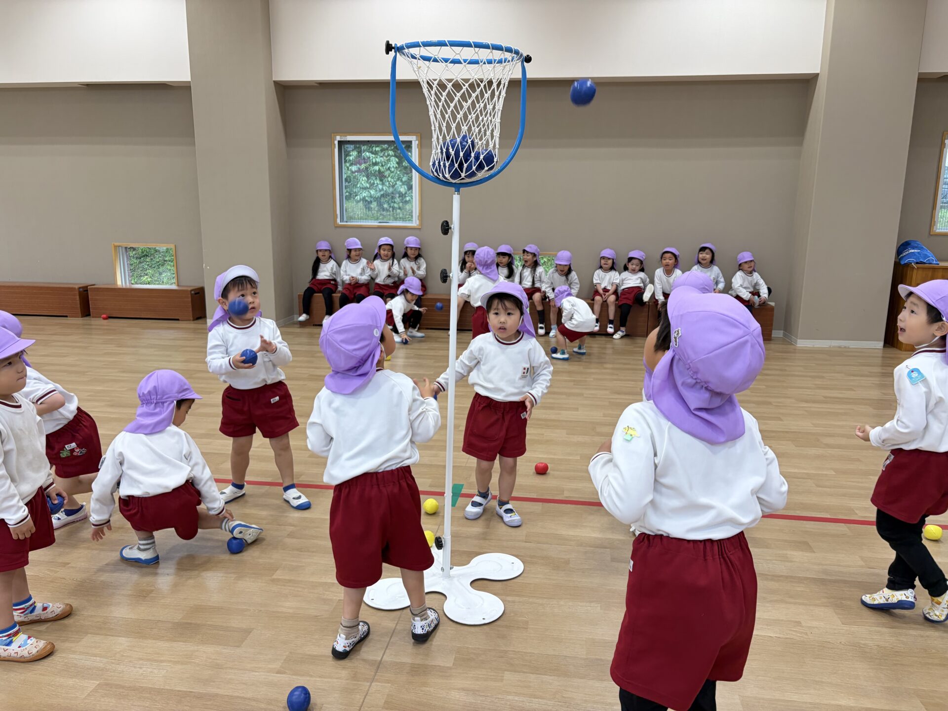 ホールでクラス対抗の玉入れ大会を行いました。雨の日ならではの特別な遊びに、朝から元気いっぱいの声が響いていました✨広いホールいっぱいに広がって、みんなやる気満々!3回戦の勝負に、「がんばるぞー!」、「たくさん入れるぞ!」と気合十分で挑みました。玉を拾っては一生懸命投げ、入るたびに大喜びでした😊😊