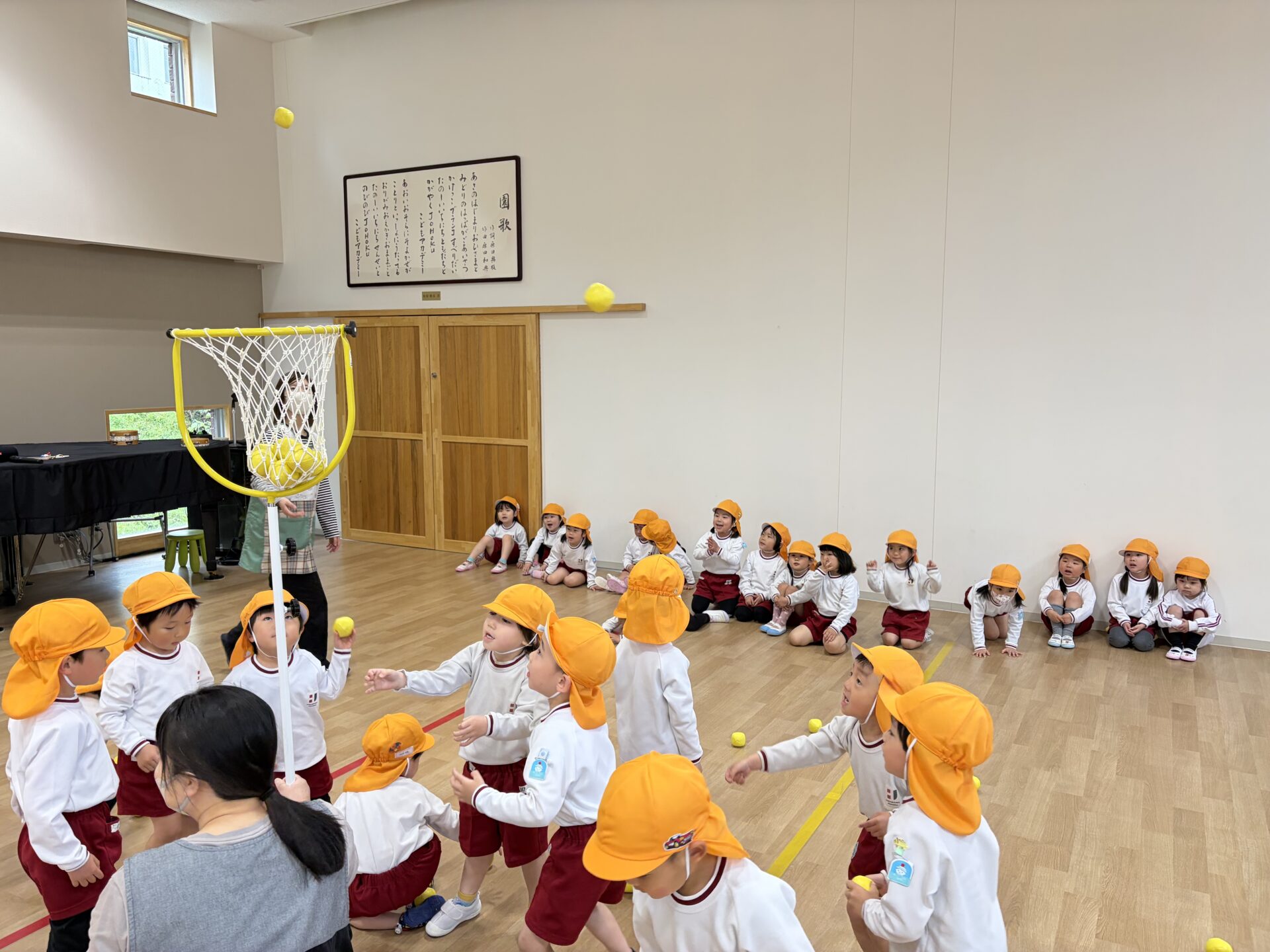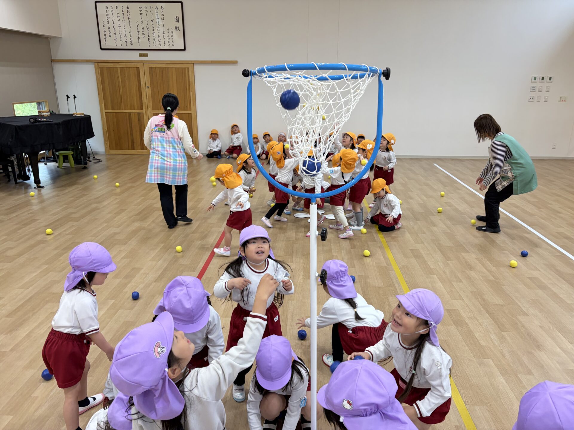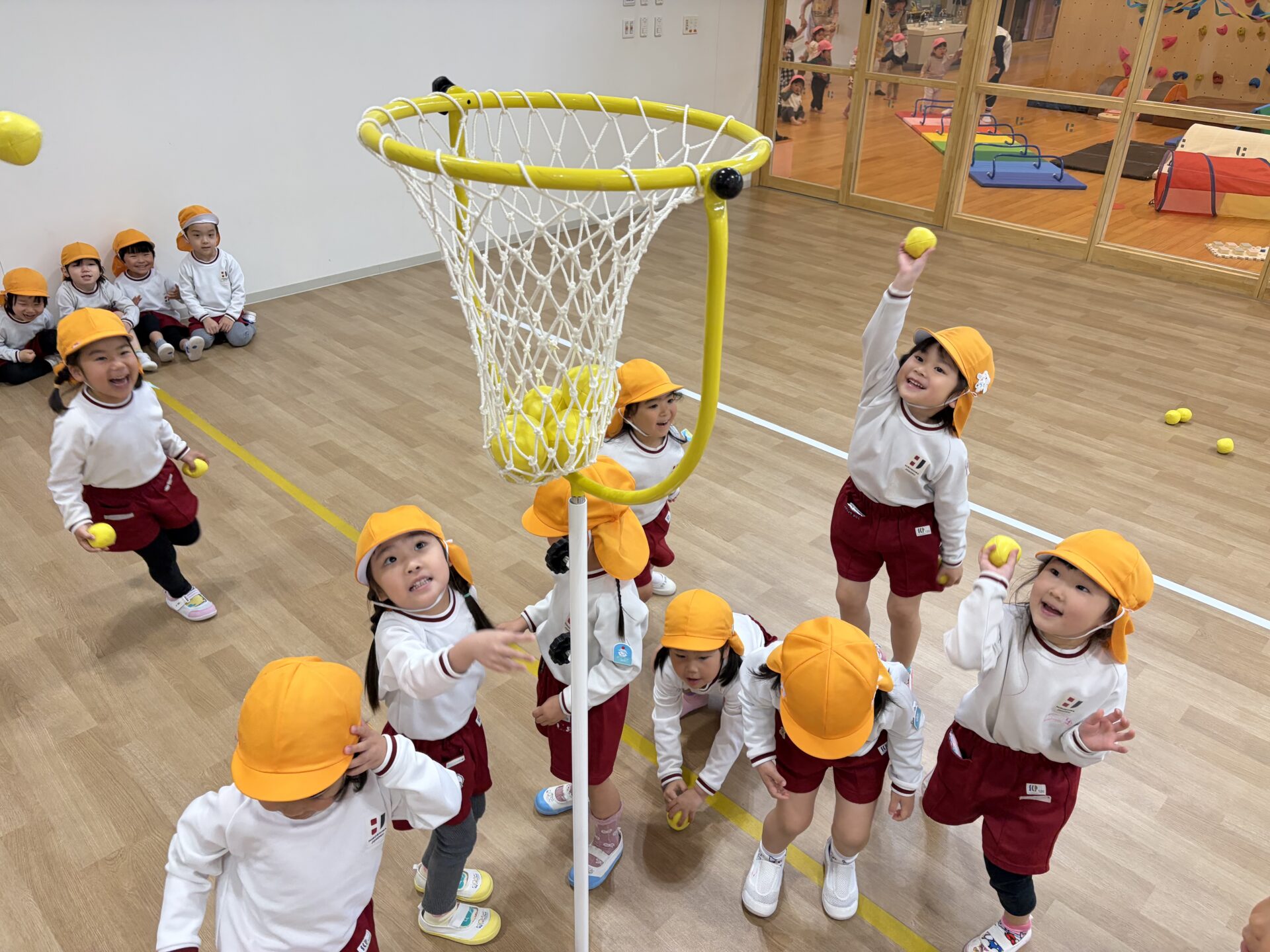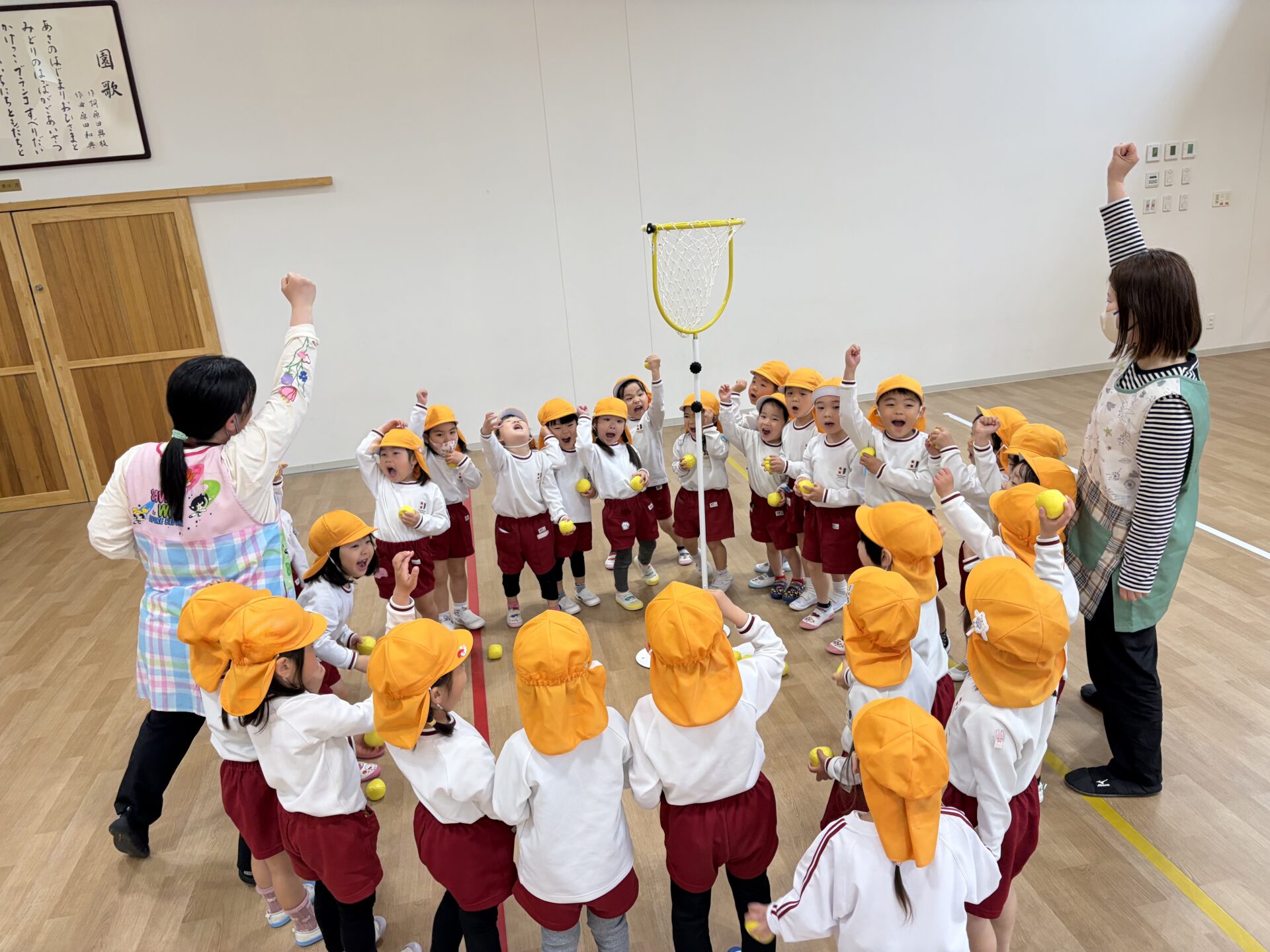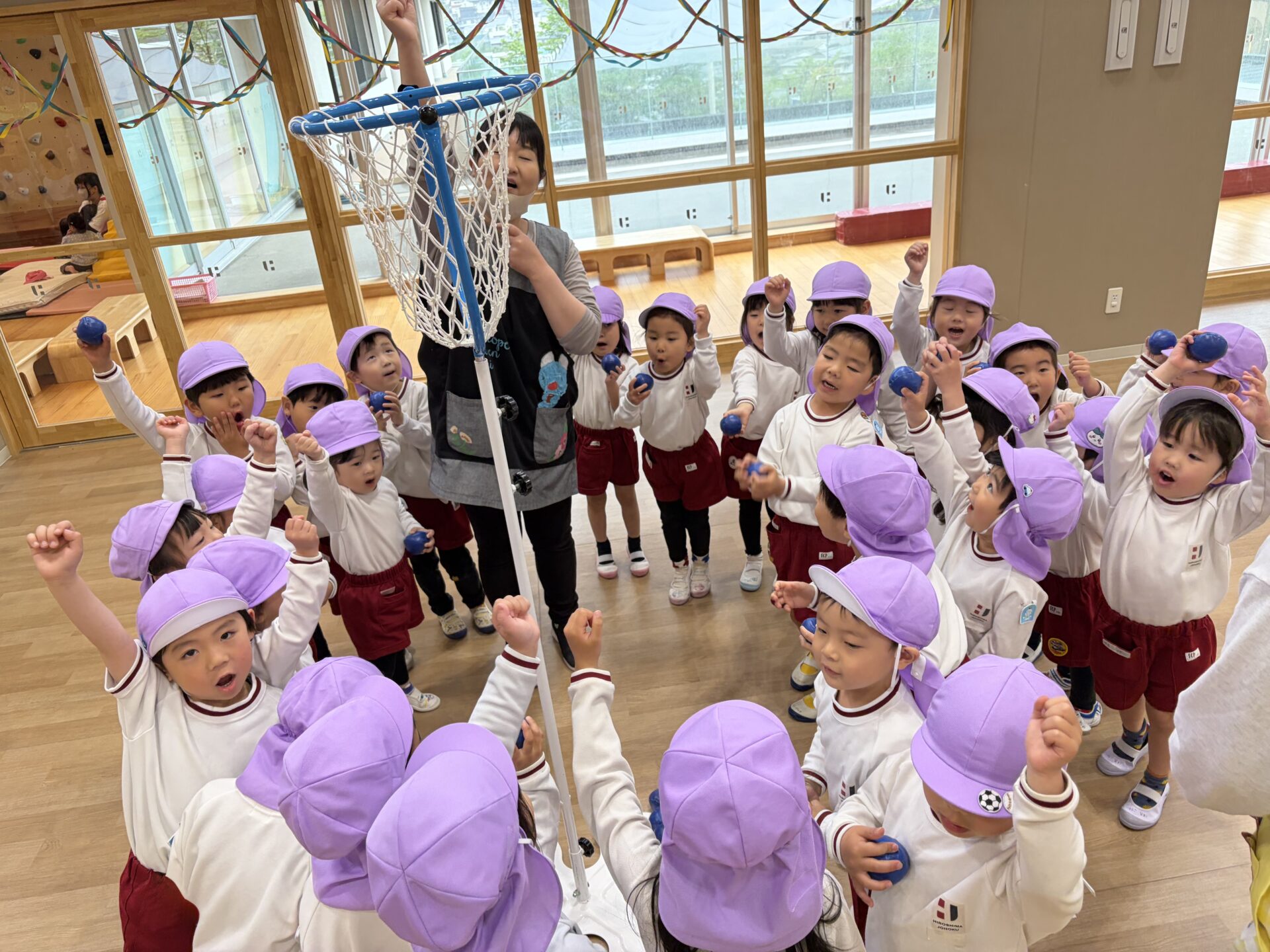 ホールでクラス対抗の玉入れ大会を行いました。雨の日ならではの特別な遊びに、朝から元気いっぱいの声が響いていました✨広いホールいっぱいに広がって、みんなやる気満々!3回戦の勝負に、「がんばるぞー!」、「たくさん入れるぞ!」と気合十分で挑みました。玉を拾っては一生懸命投げ、入るたびに大喜びでした😊😊