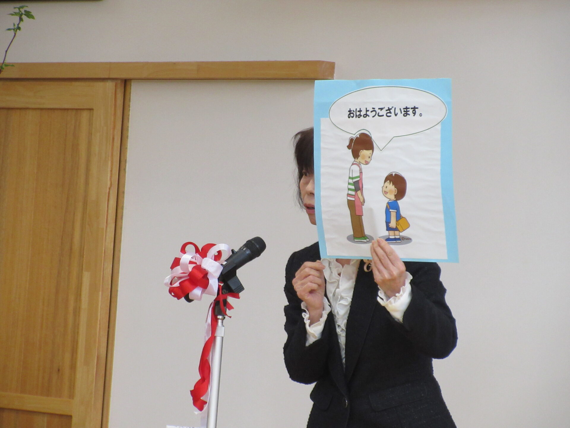 入園式では、園長先生から「あいさつ」「お友だちと仲良く遊ぶこと」「交通安全」についてのお話がありました。