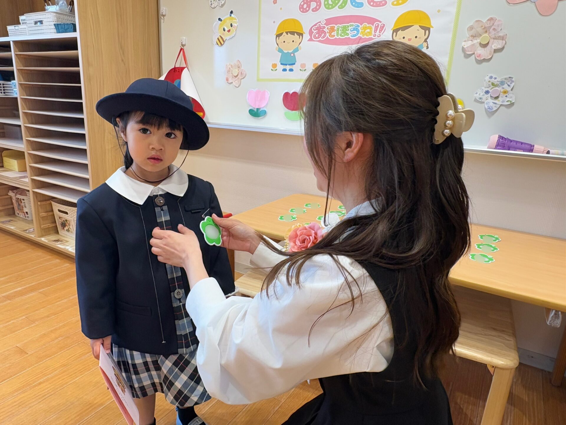 保育室では、自分のロッカーや机を確認したり、先生に名札をつけてもらったりする中で、少しずつ緊張がほぐれ、笑顔も見られるようになりました☺