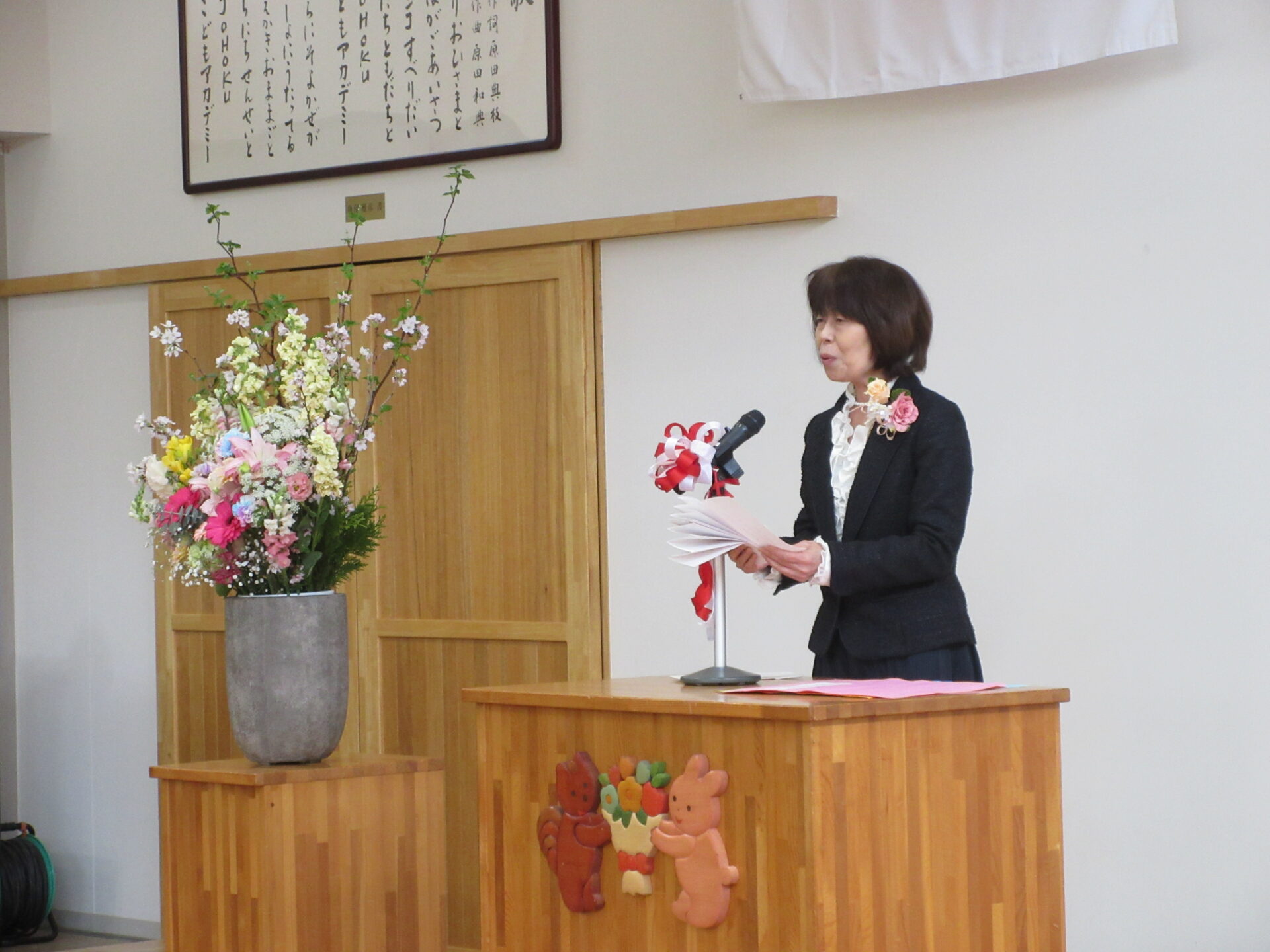 入園式では、園長先生から「あいさつ」「お友だちと仲良く遊ぶこと」「交通安全」についてのお話がありました。