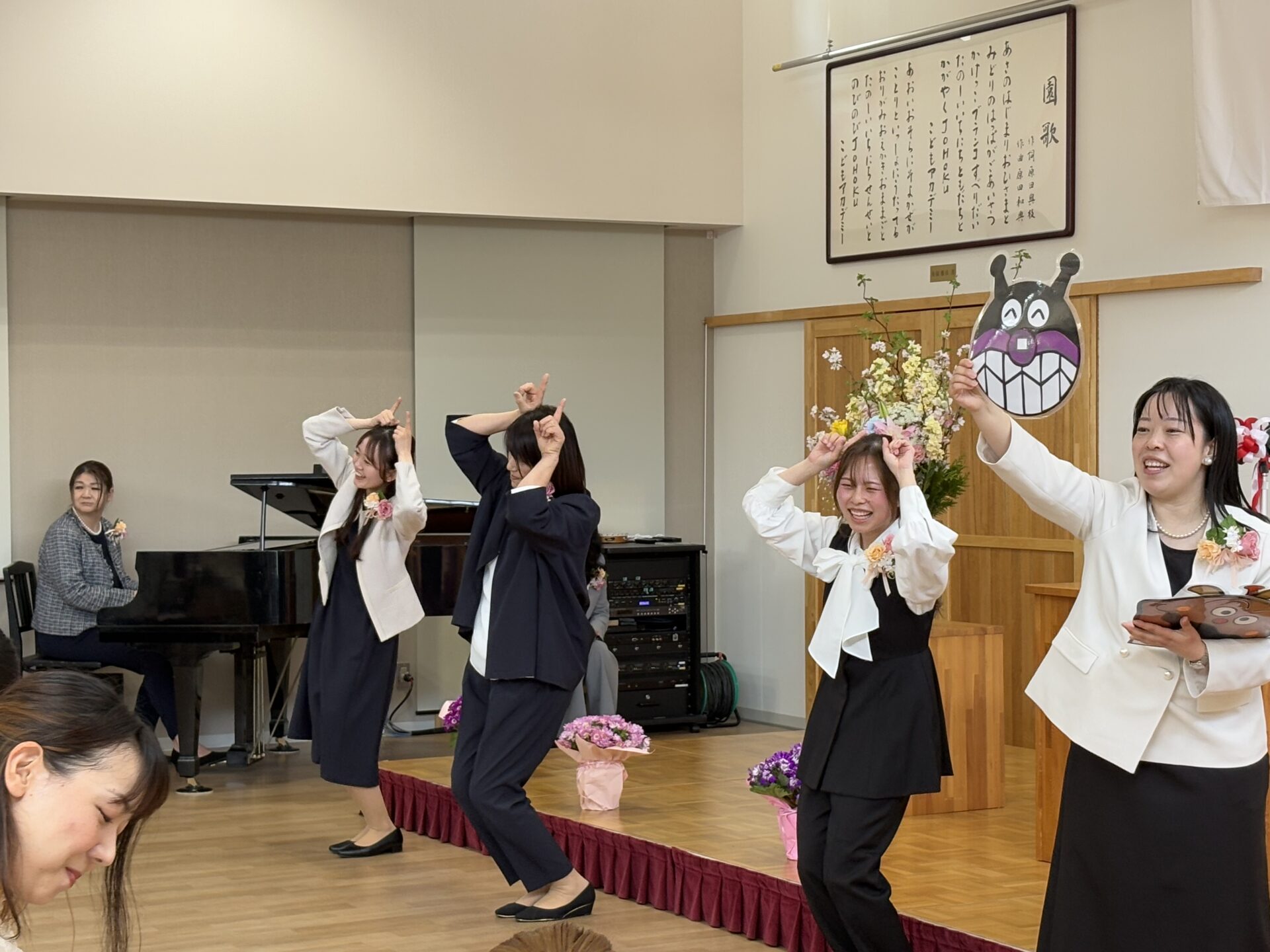 入園式の前には、先生たちと一緒に「とんとんとんとんアンパンマン」の手遊びを楽しみました✨