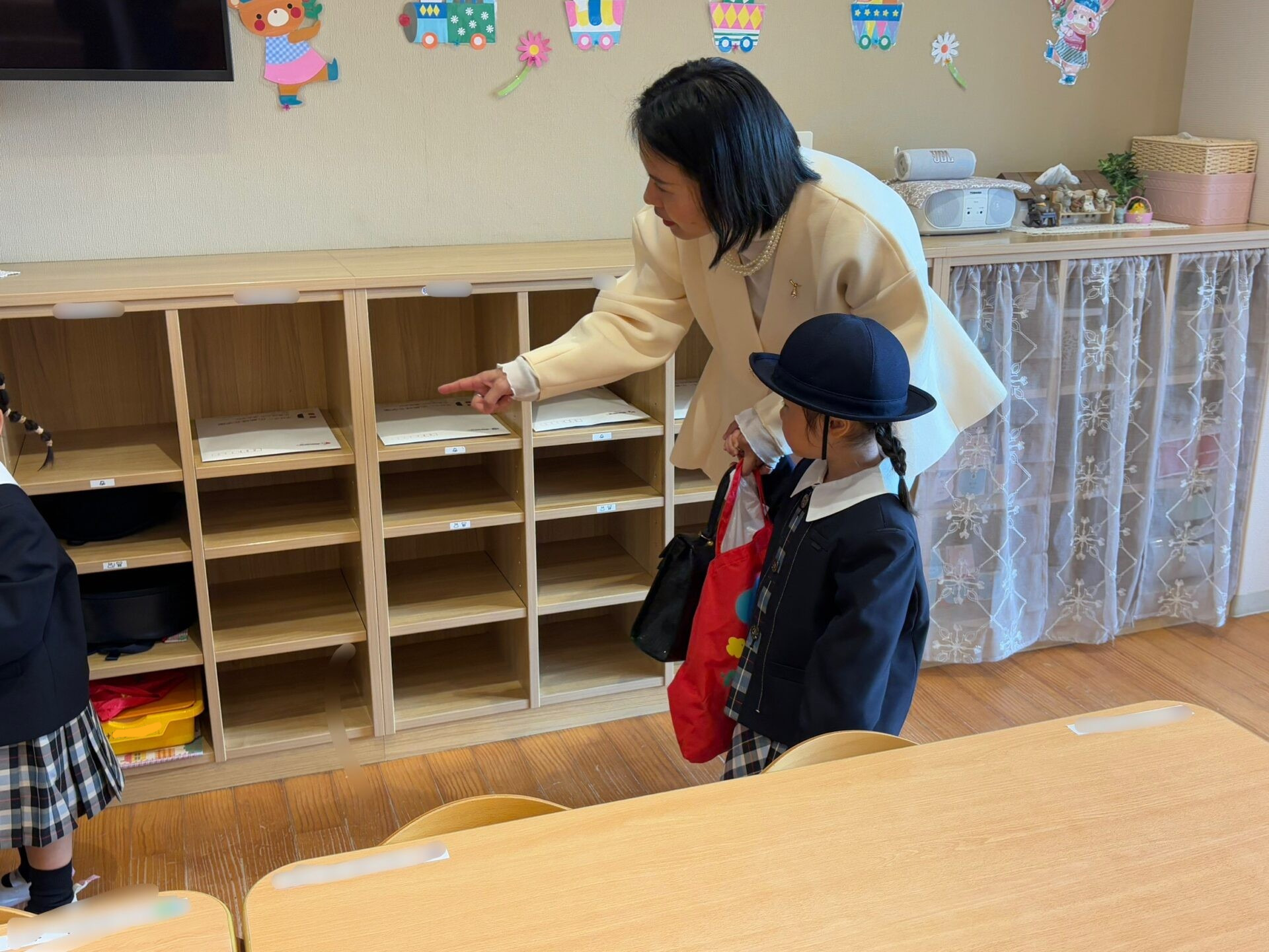 保育室では、自分のロッカーや机を確認したり、先生に名札をつけてもらったりする中で、少しずつ緊張がほぐれ、笑顔も見られるようになりました☺
