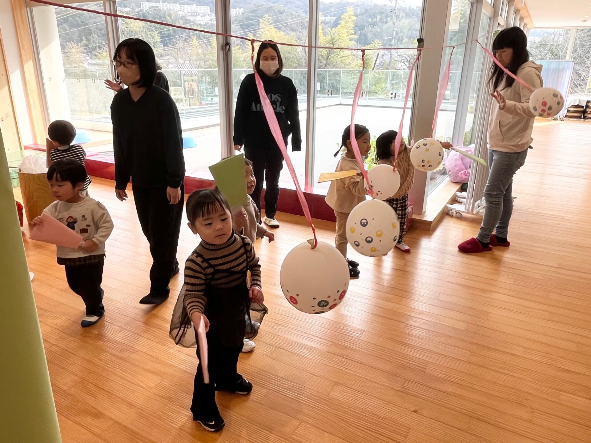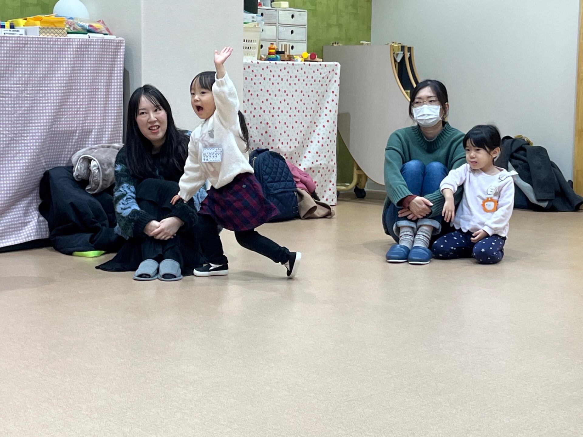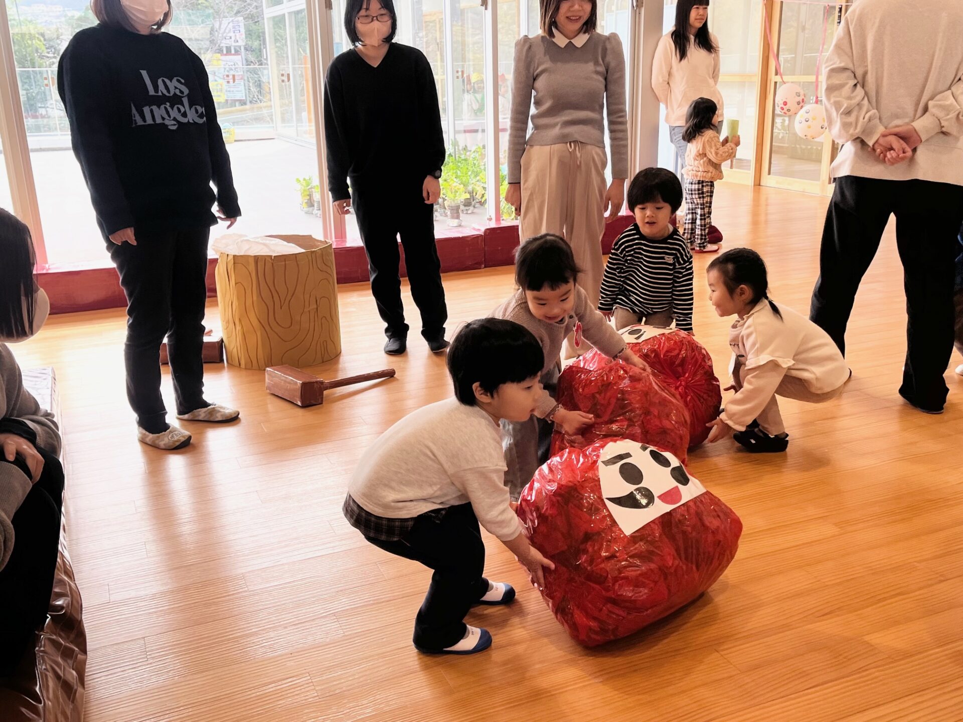 今回は🎍お正月あそび🎍をしました。はじめに大きい絵本『だるまさんが』見ました。だるまさんの絵に合わせて、みんなでまねっこ💖楽しいね!!絵本のあとは、「おもちつき」「はねつき」「だるまころがし」・・・みんなで楽しみました。
