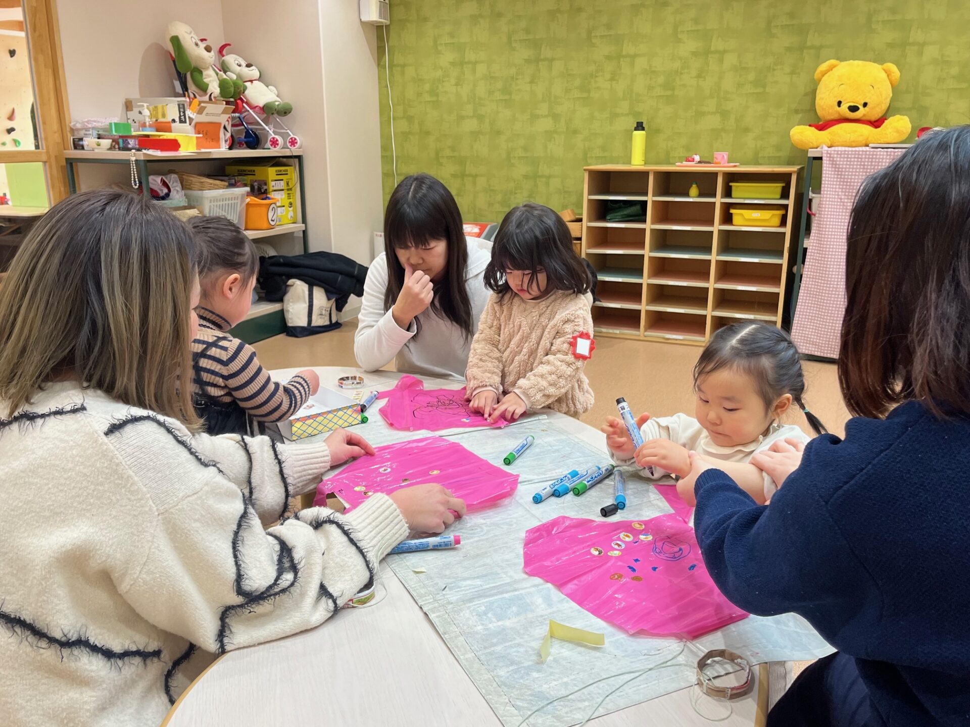 身体を動かしたあとは、凧の製作・・・マジックで模様を描いたりシールで飾りをつけて、世界でひとつの素敵な『凧』が出来上がりました。園庭ではその凧が元気よくお空を泳いでいましたよ😊。