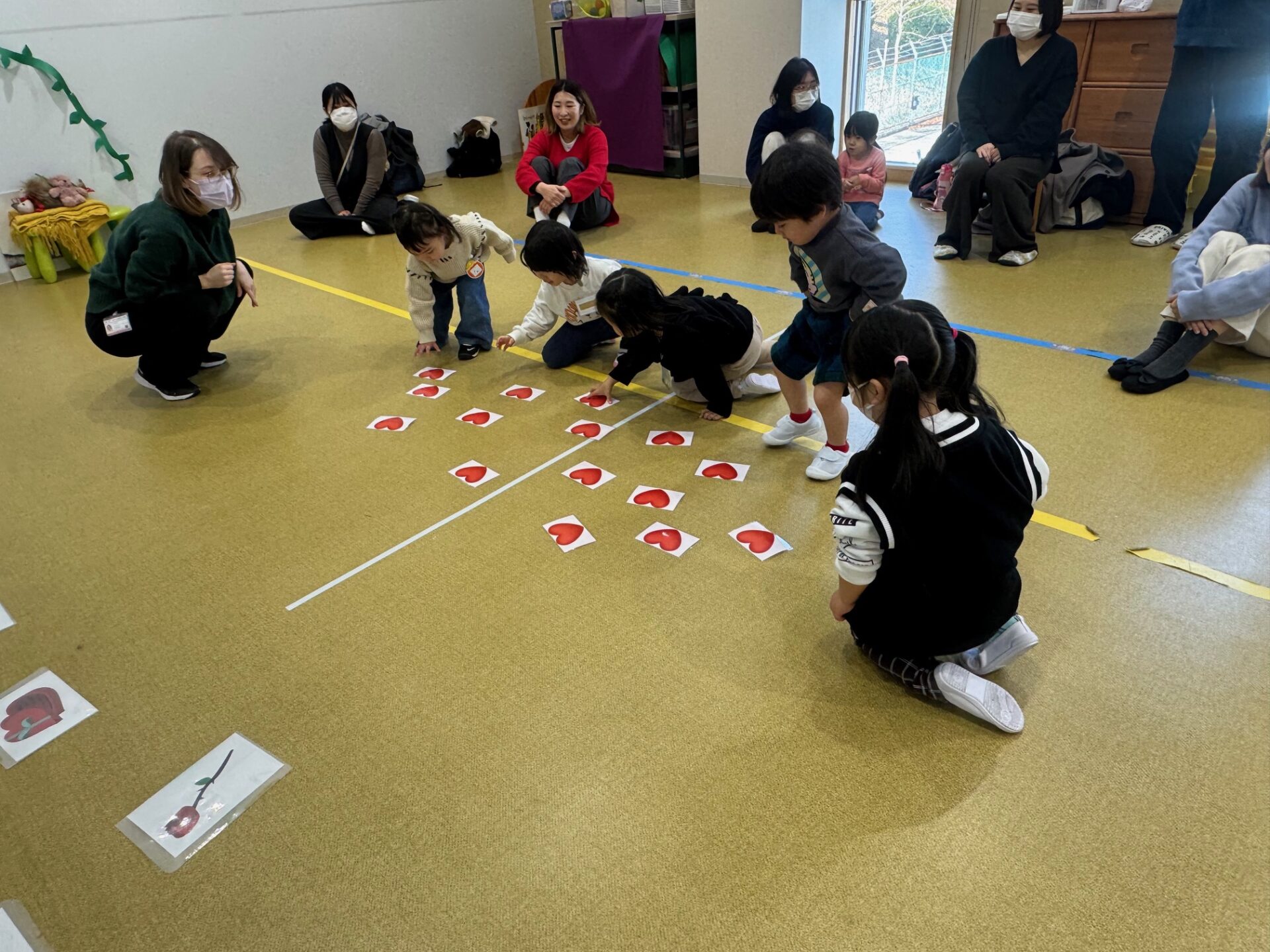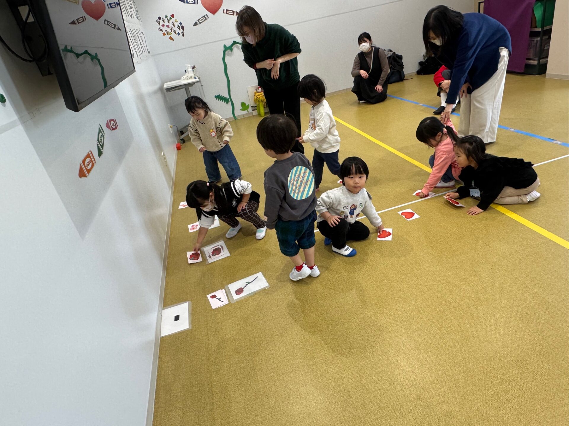 アリサ先生の英語あそびでは、バレンタインにちなんで、チョコレートやキャンディの絵合わせゲームをしました。